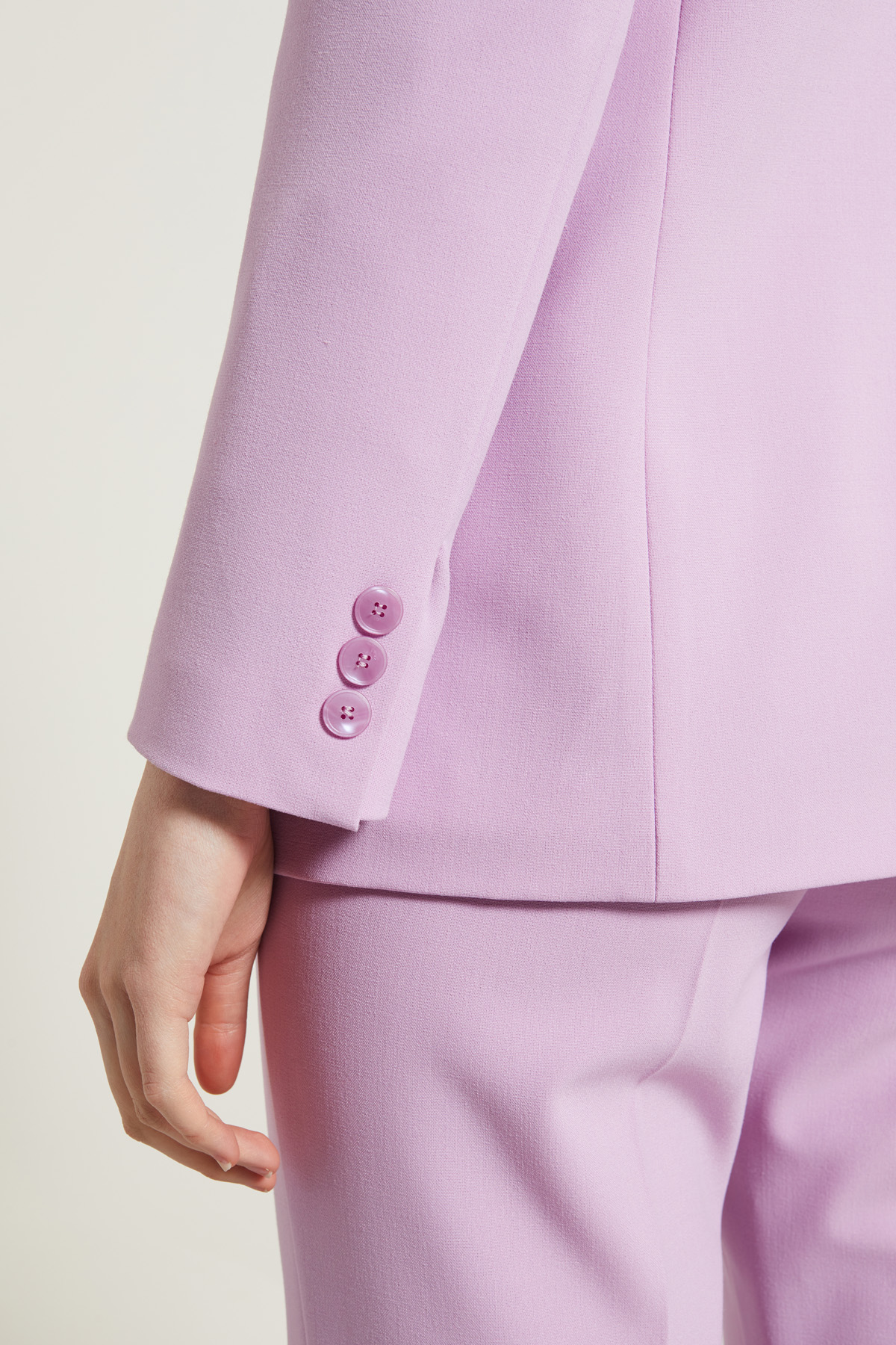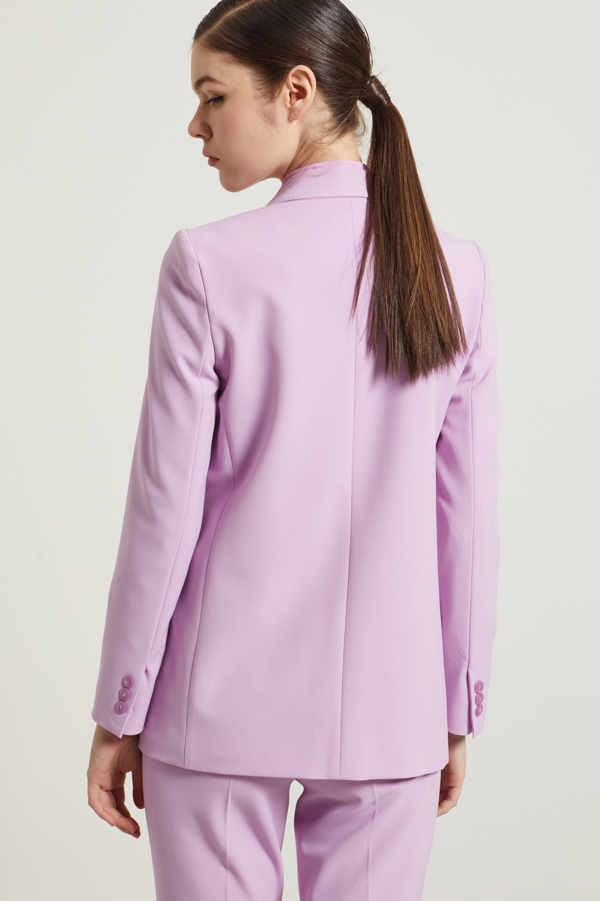 Blazer dalla linea dritta realizzato in tela di misto viscosa stretch, con collo a rever, maniche lunghe con bottoni al fondo, tasche a doppio filetto con patta, profili rifiniti a puntino. Allacciatura monopetto tramite bottone. Foderato.