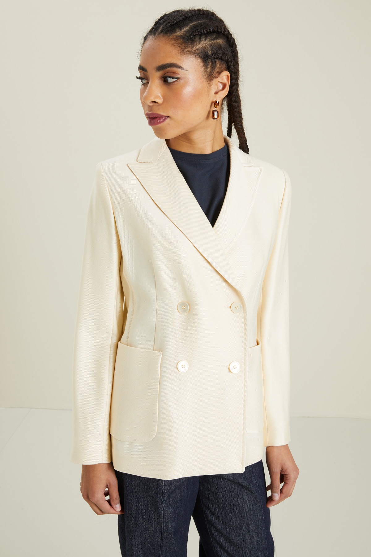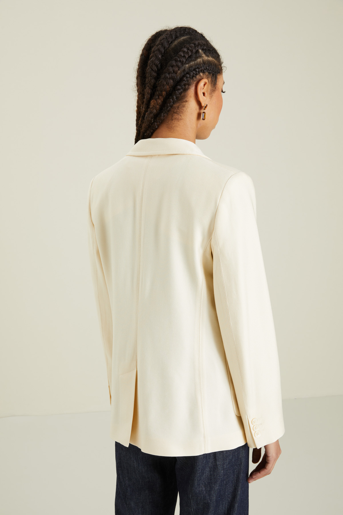 Blazer dalla linea dritta realizzato in faille di viscosa e cotone, collo a rever, maniche lunghe con bottoni, maxi tasche applicate, spacco nel retro e allacciatura doppiopetto tramite bottoni. Semifoderato.
