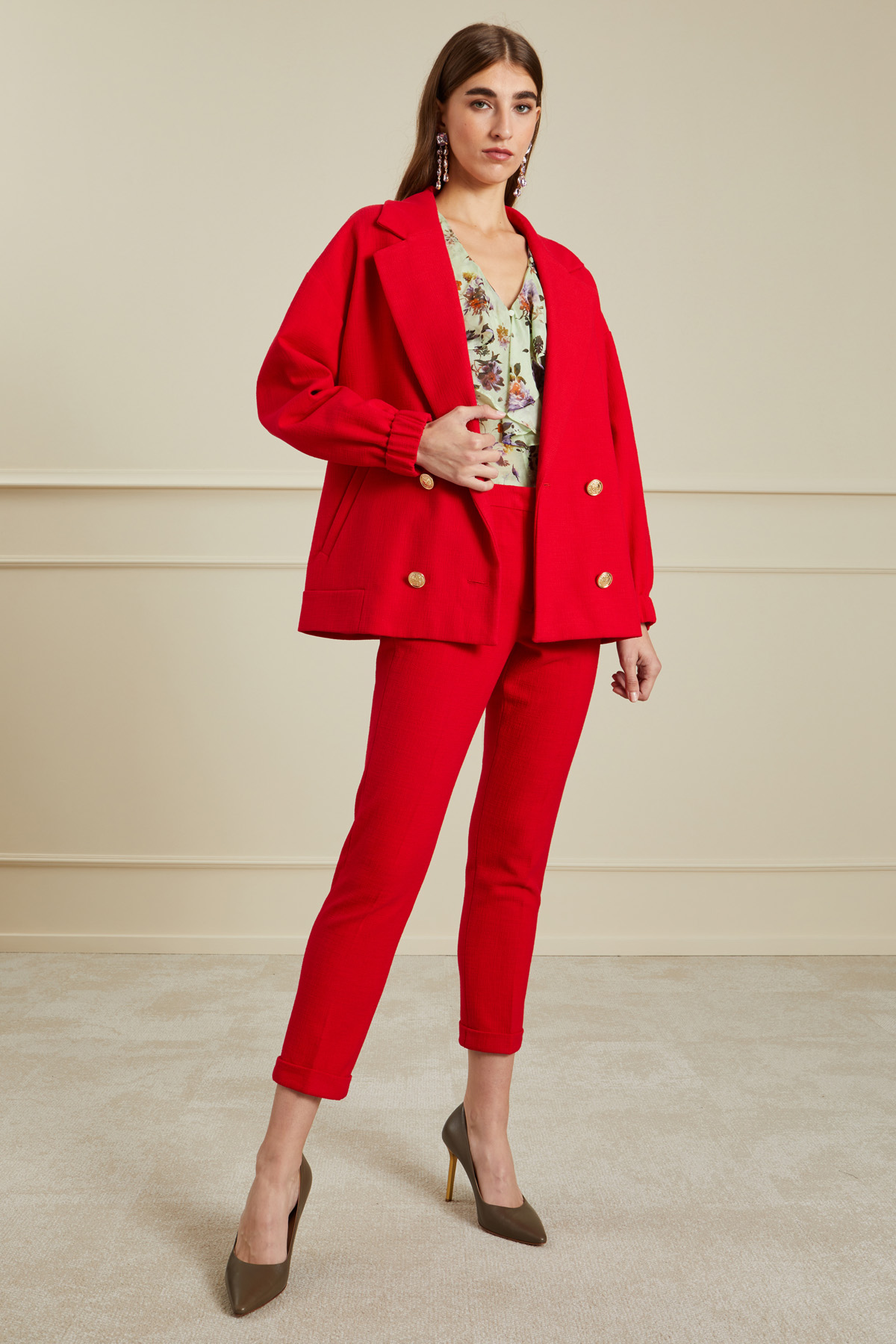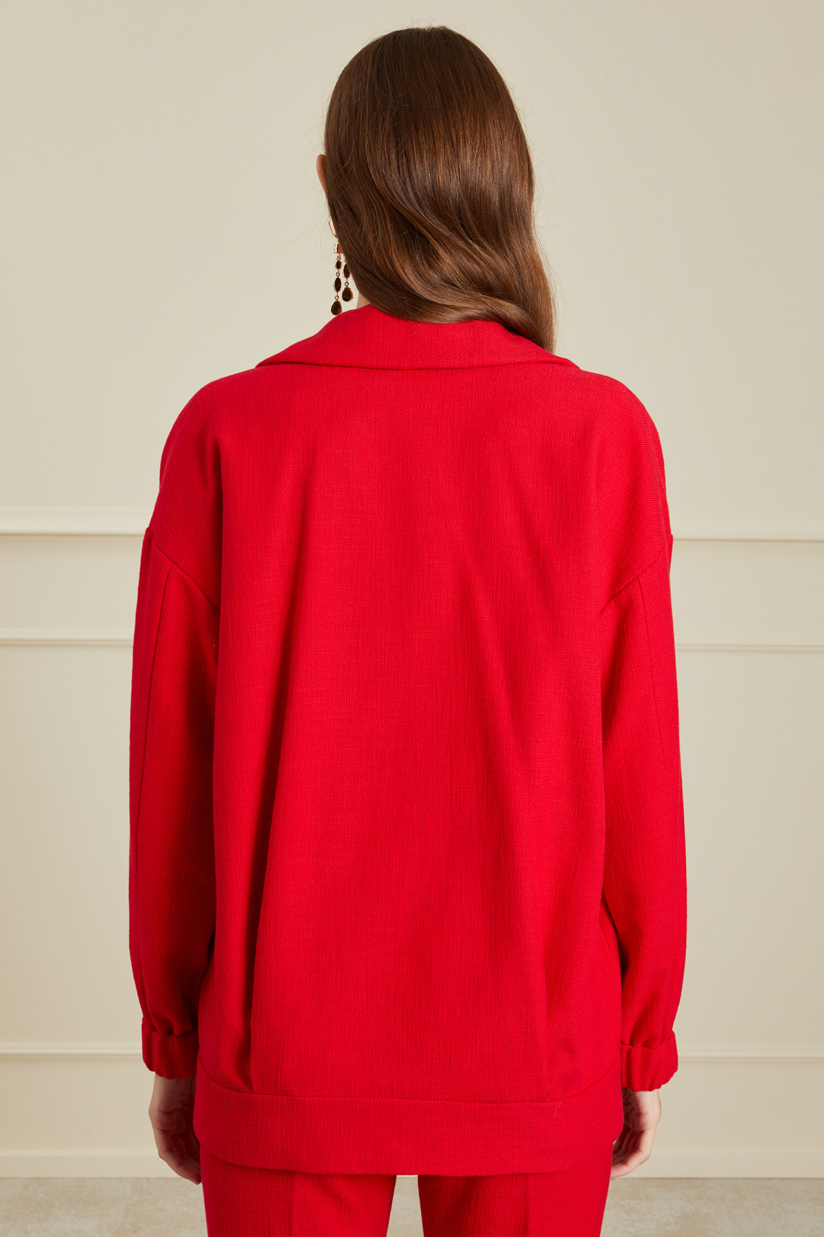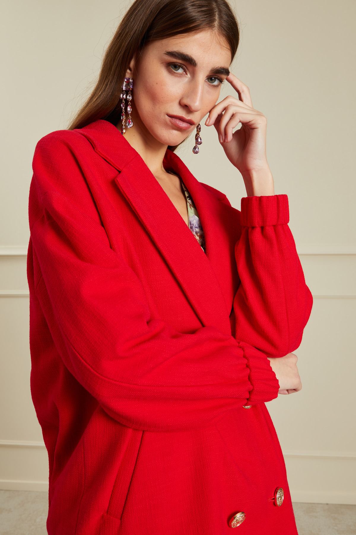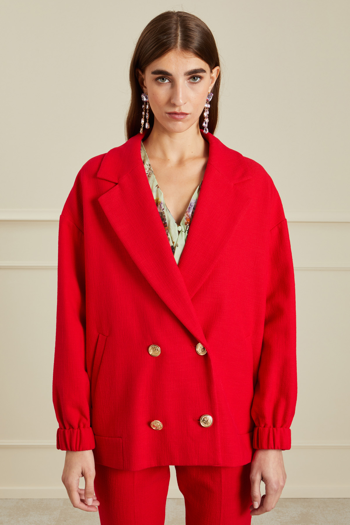 Giacca dalla linea a uovo realizzata in stuoia di misto cotone stretch, con maxi rever, maniche lunghe con inserto elastico al fondo, tasche oblique a filetto e allacciatura doppiopetto tramite bottoni metallici. Foderato.