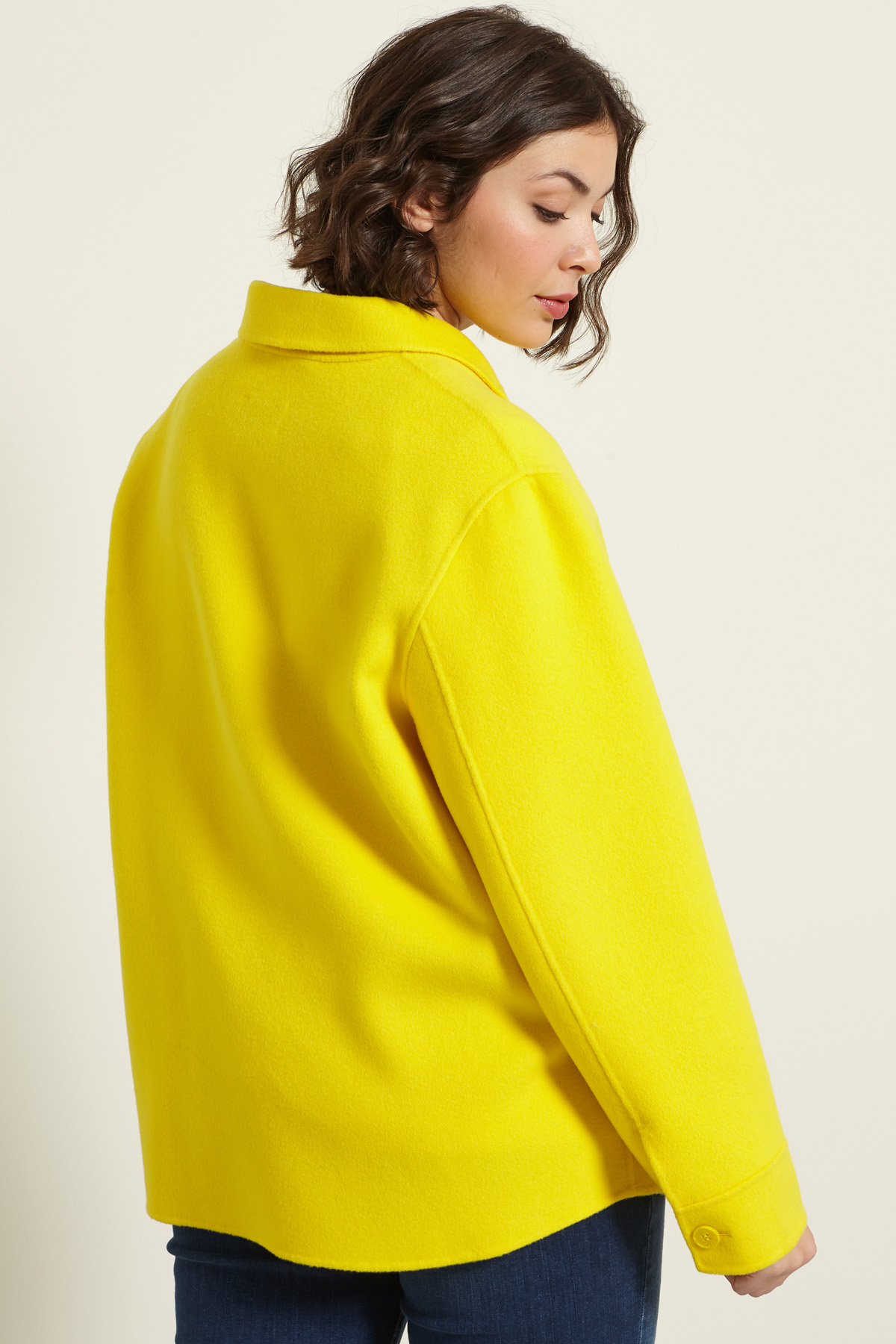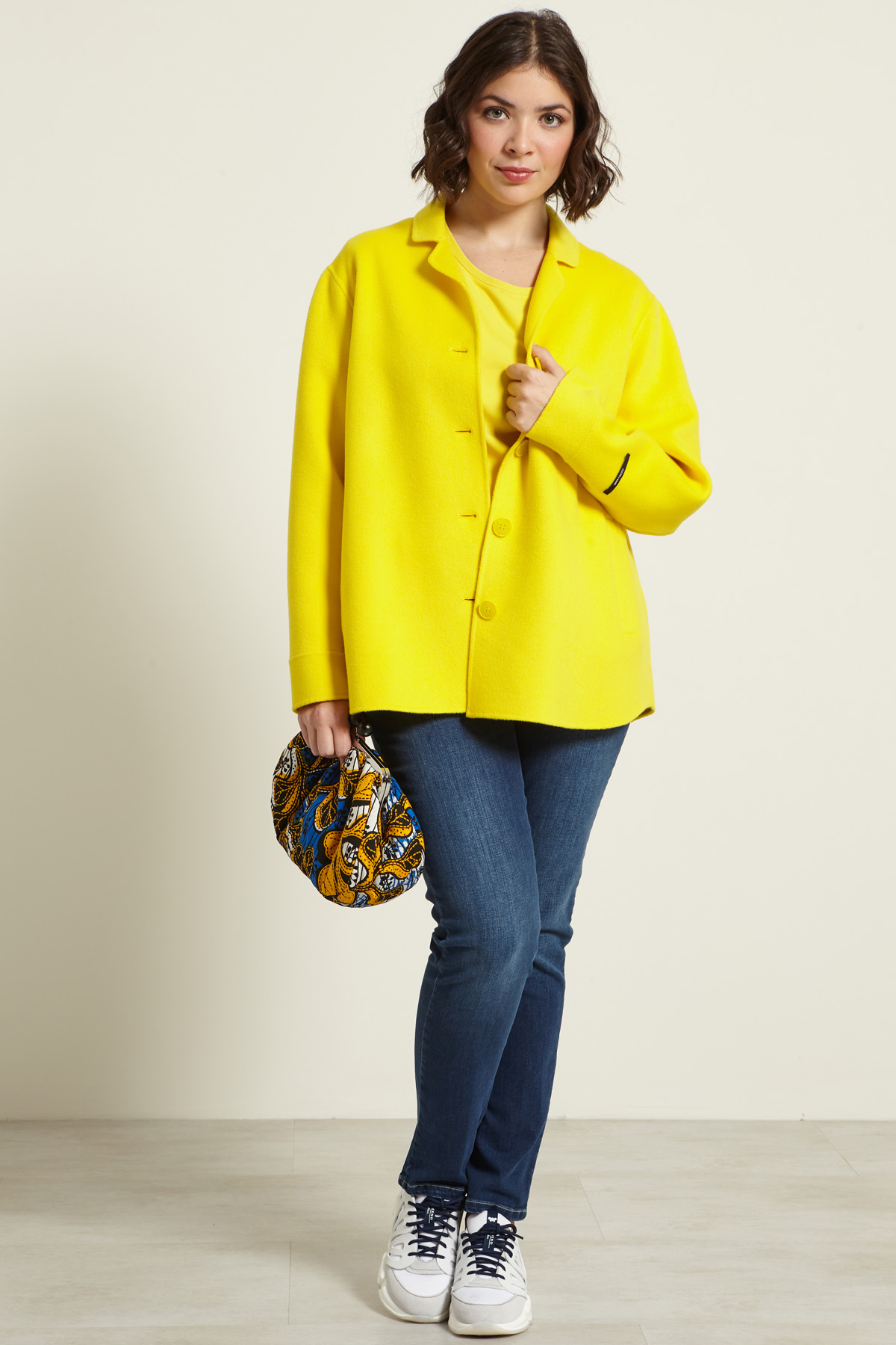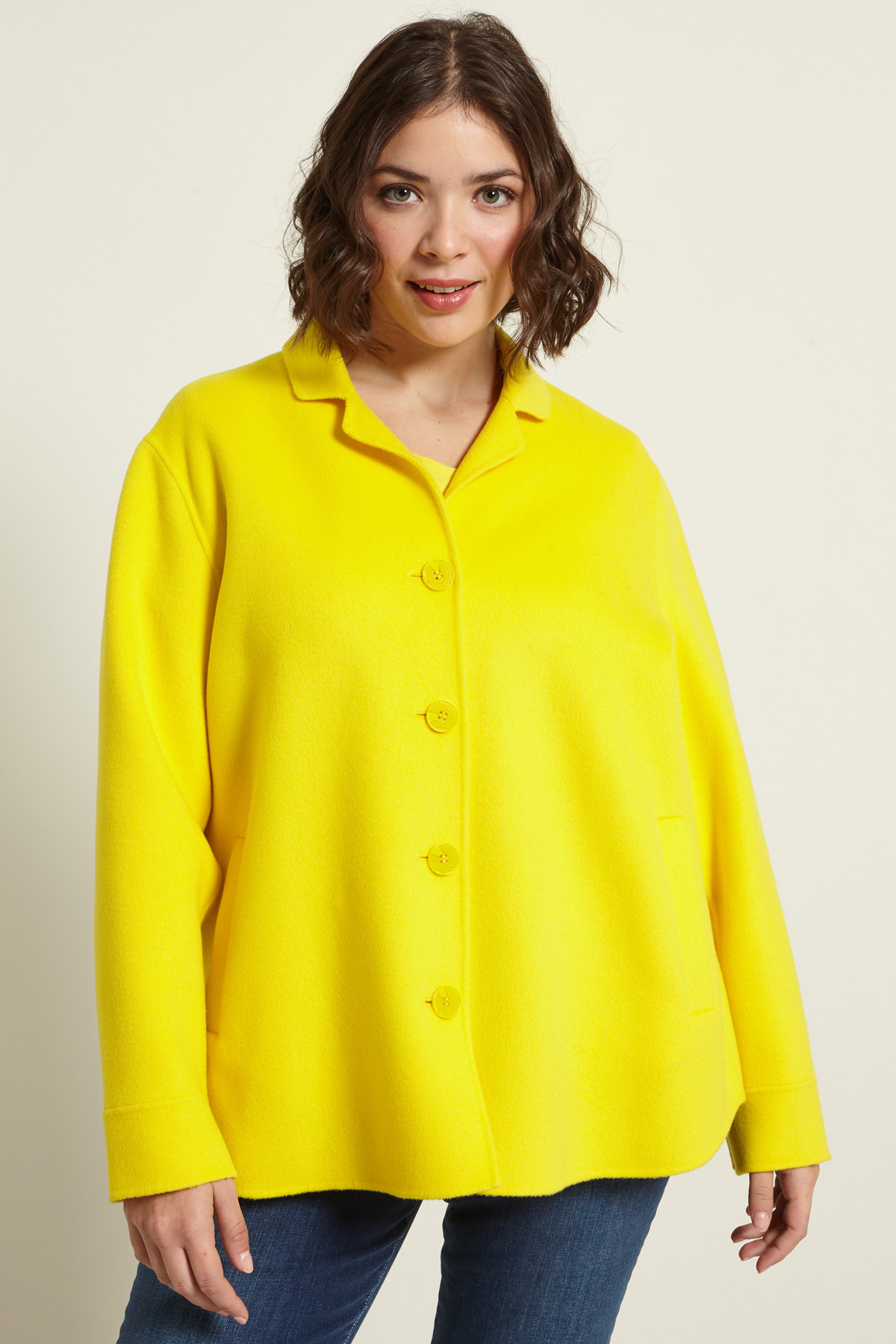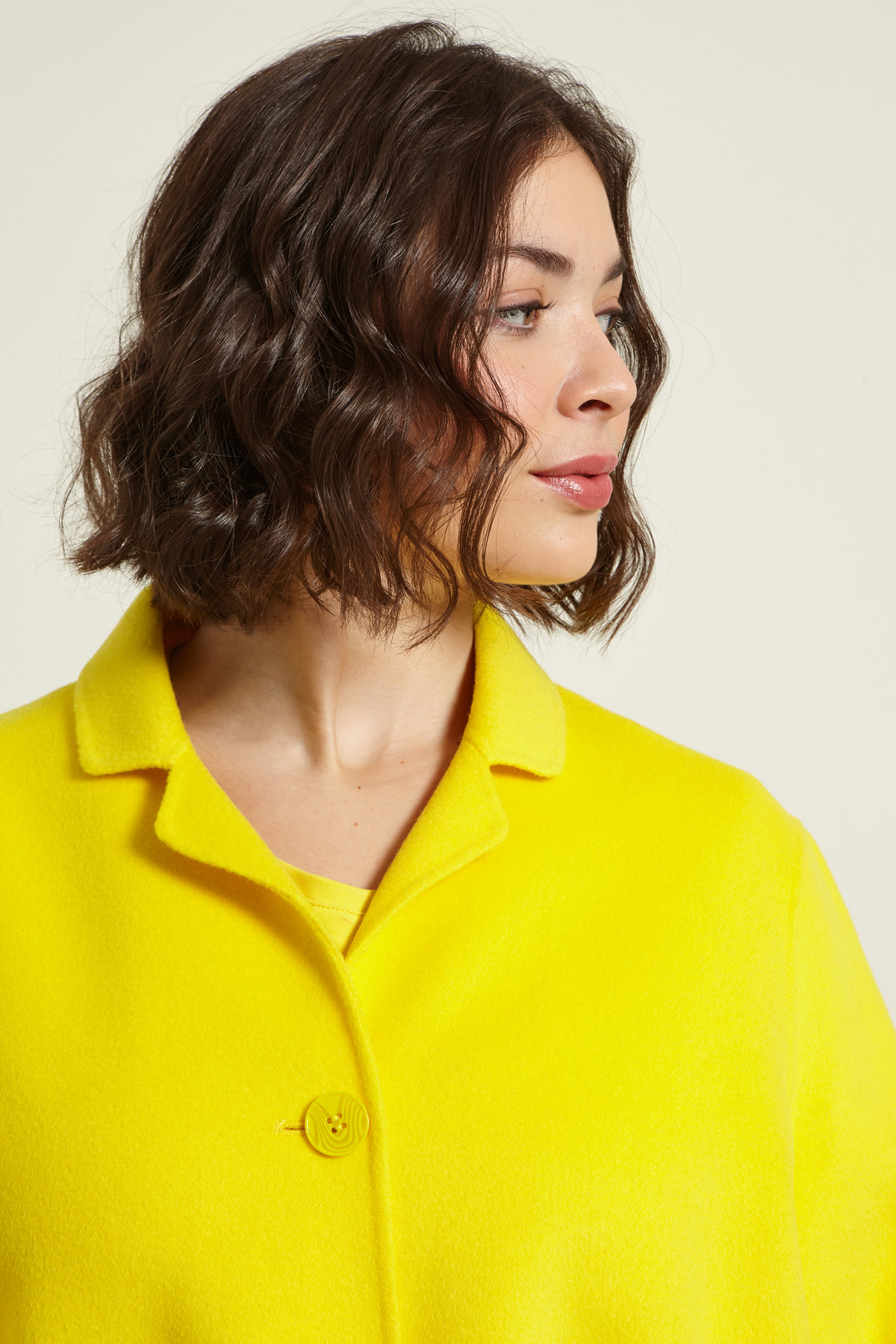 Giaccone corto dalla linea dritta realizzato in doppio drap di lana e cashmere, con collo a rever, maniche lunghe con polsino e bottone, tasche a filetto. Allacciatura monopetto tramite bottoni a vista. Sfoderato.