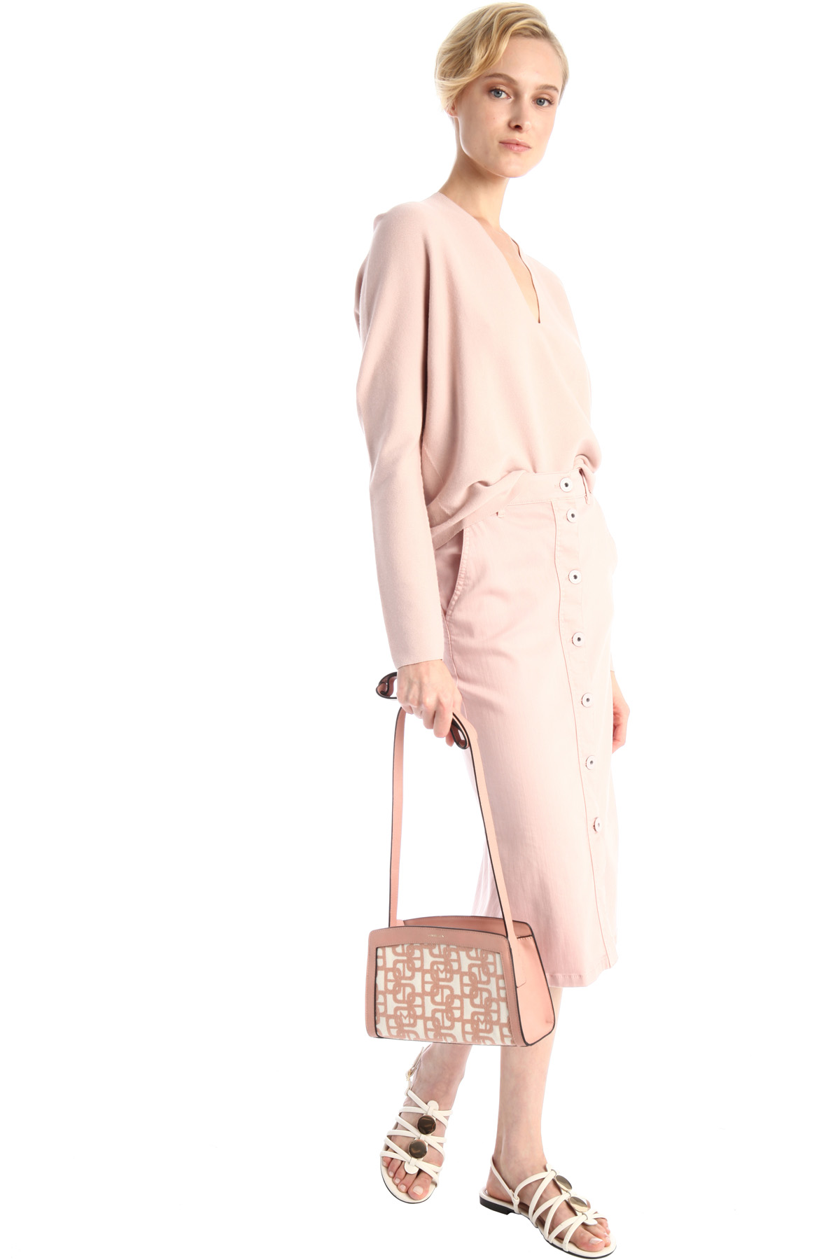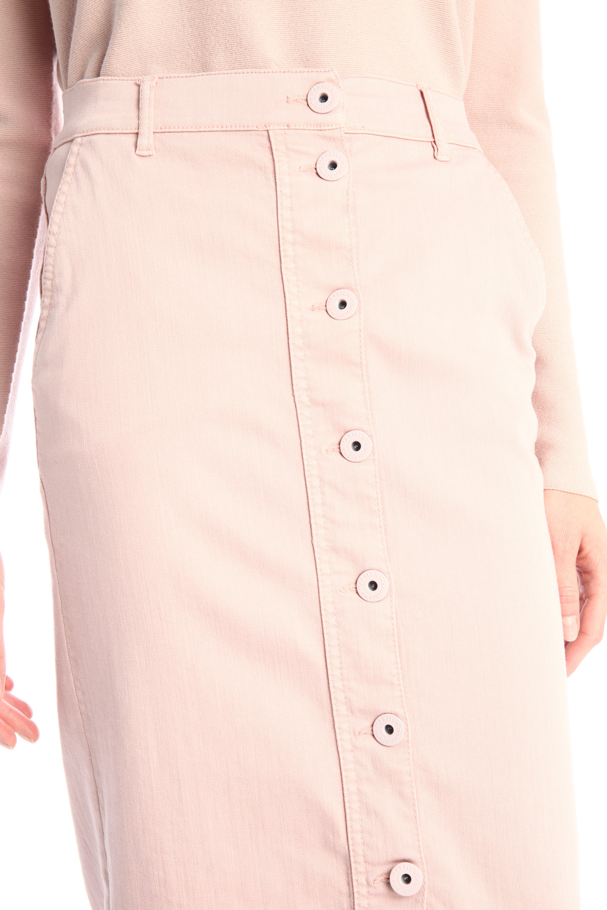 Gonna longuette dalla linea a tubo realizzata in bull di misto cotone stretch, con passanti in vita, tasche laterali alla francese e applicata nel retro. Allacciatura tramite bottoni sul davanti.