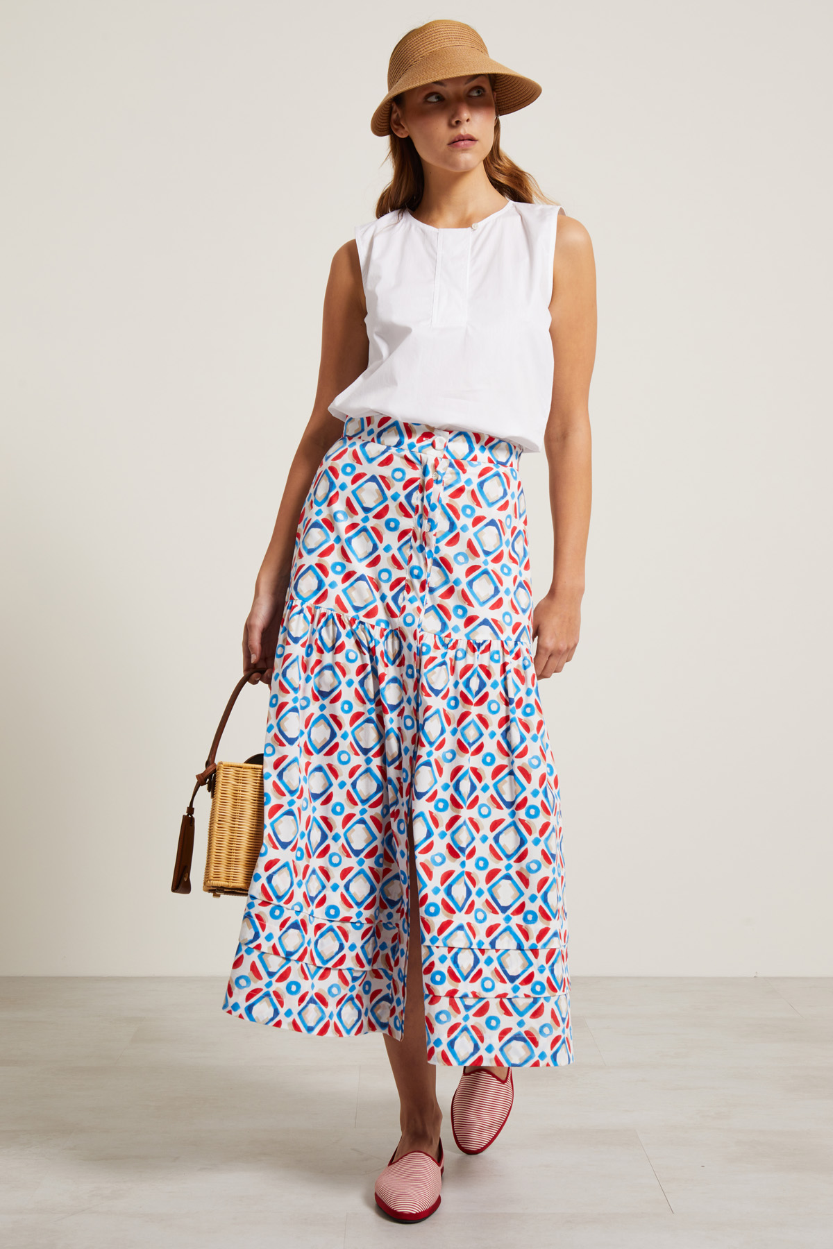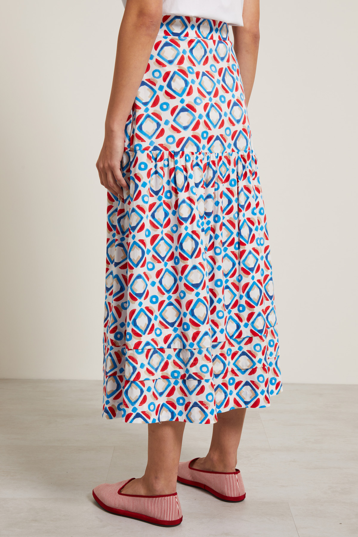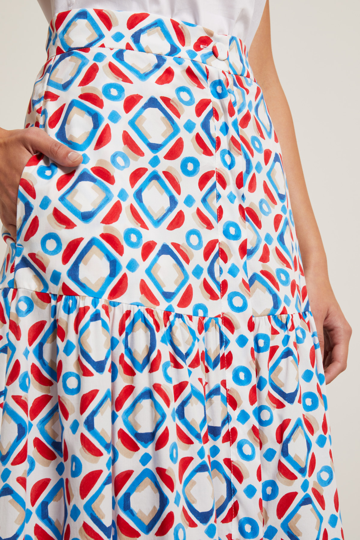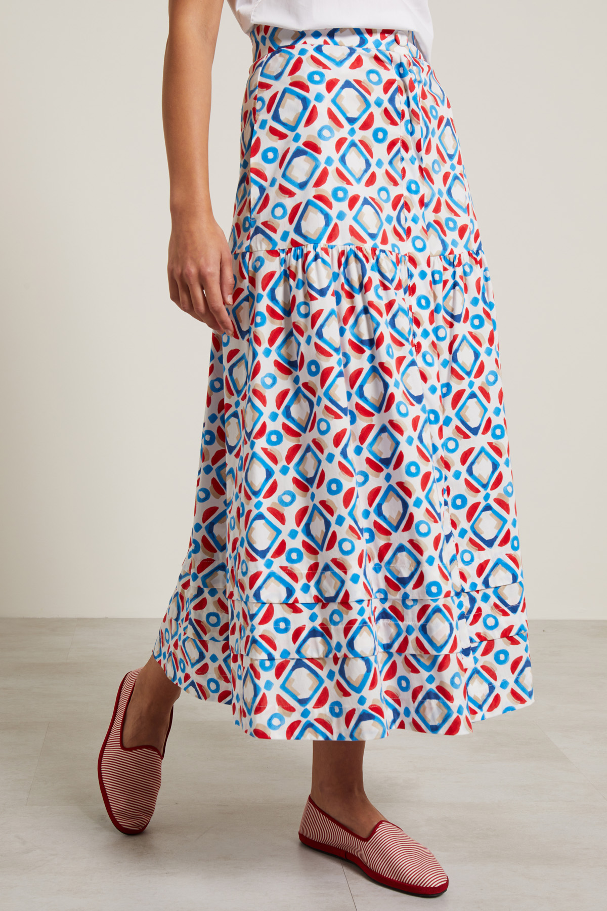 Gonna lunga dalla linea ampia realizzata in popeline di cotone stretch stampato, con baschina, tasche laterali inserite in cucitura, dettaglio di arricciatura e balze al fondo. Allacciatura a tutta lunghezza nascosta tramite bottoni.