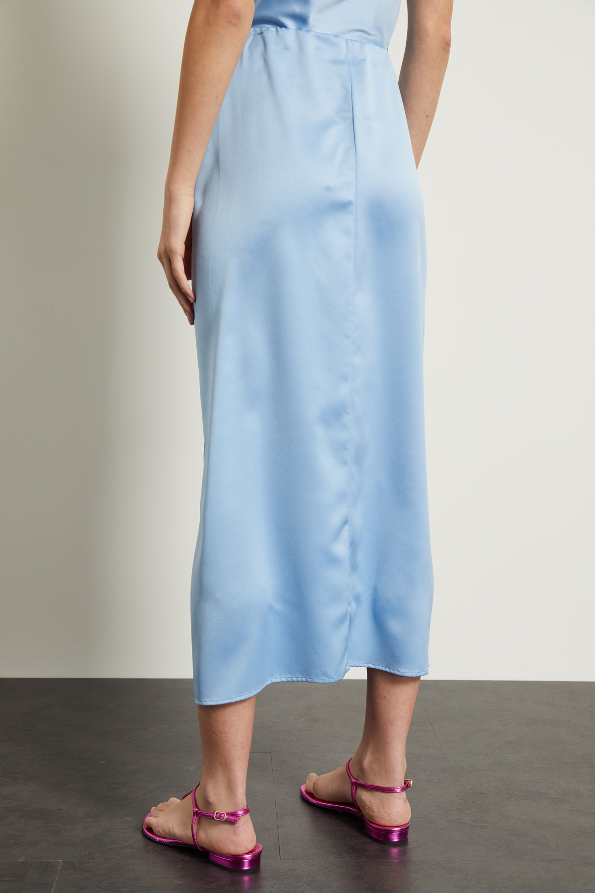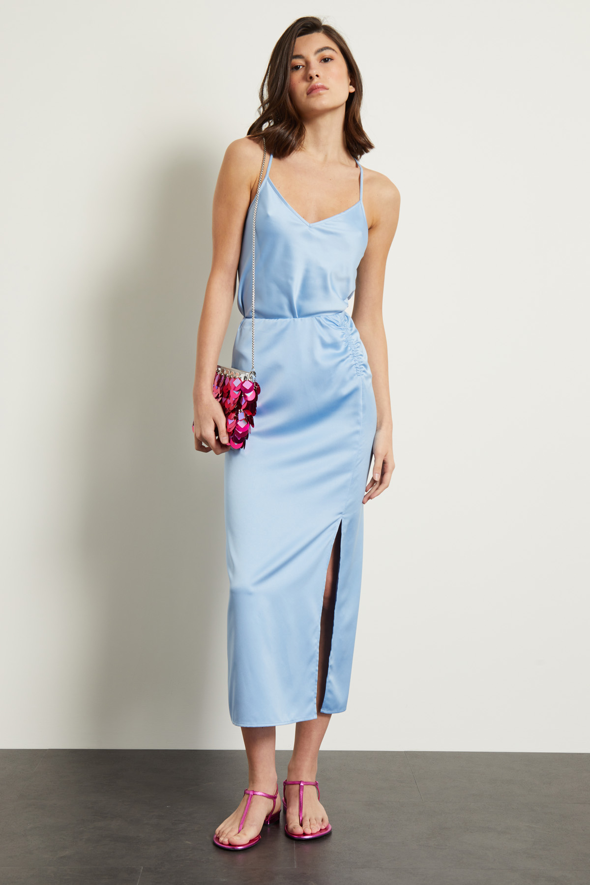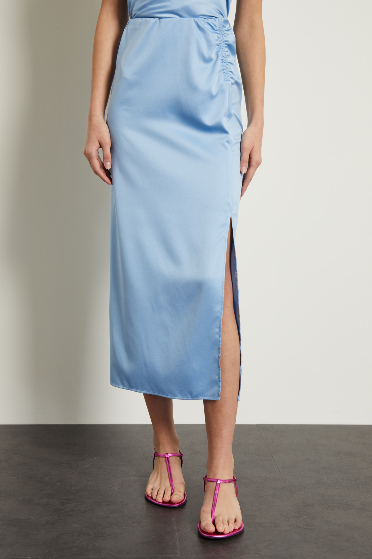 Gonna midi a tubo realizzata in raso, con inserto elastico in vita e sul davanti, dettaglio di arricciatura e spacco laterale al fondo.