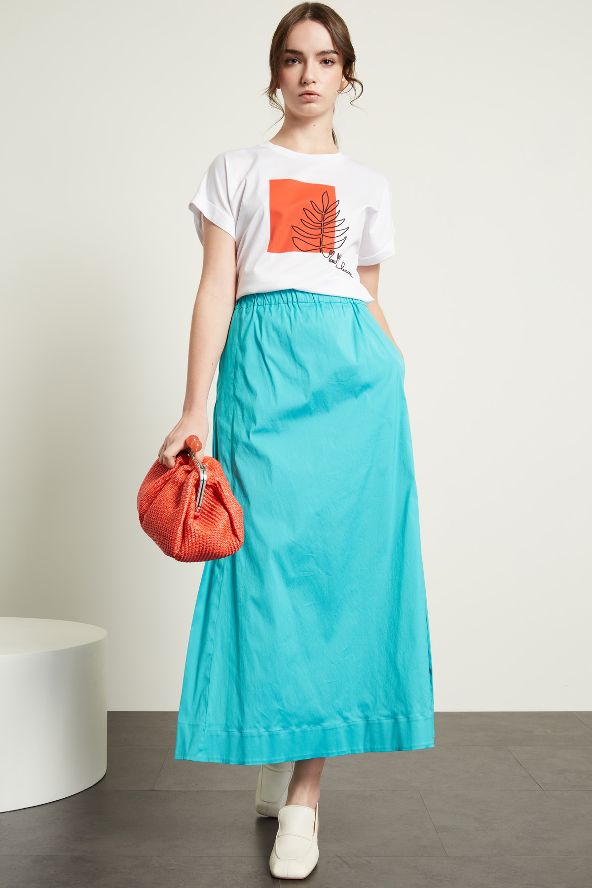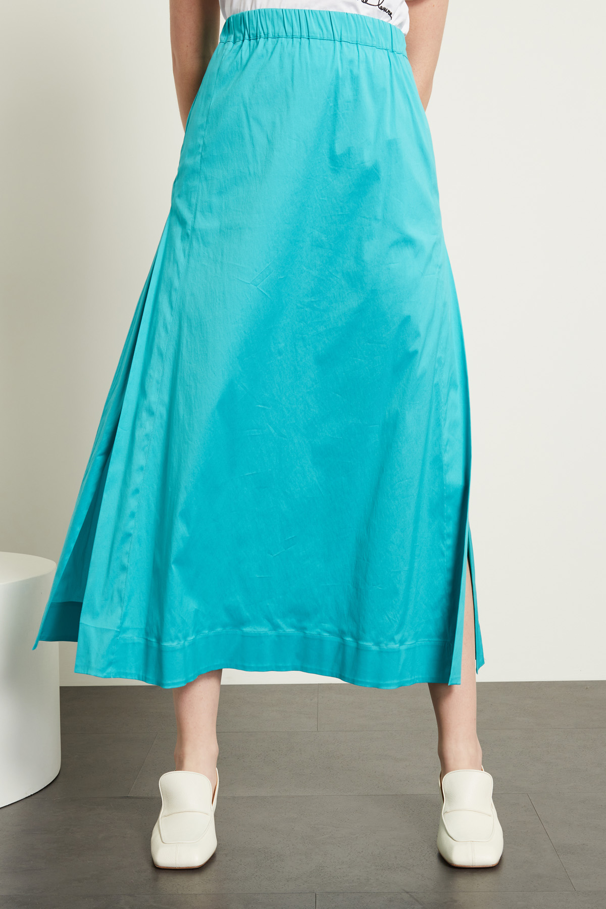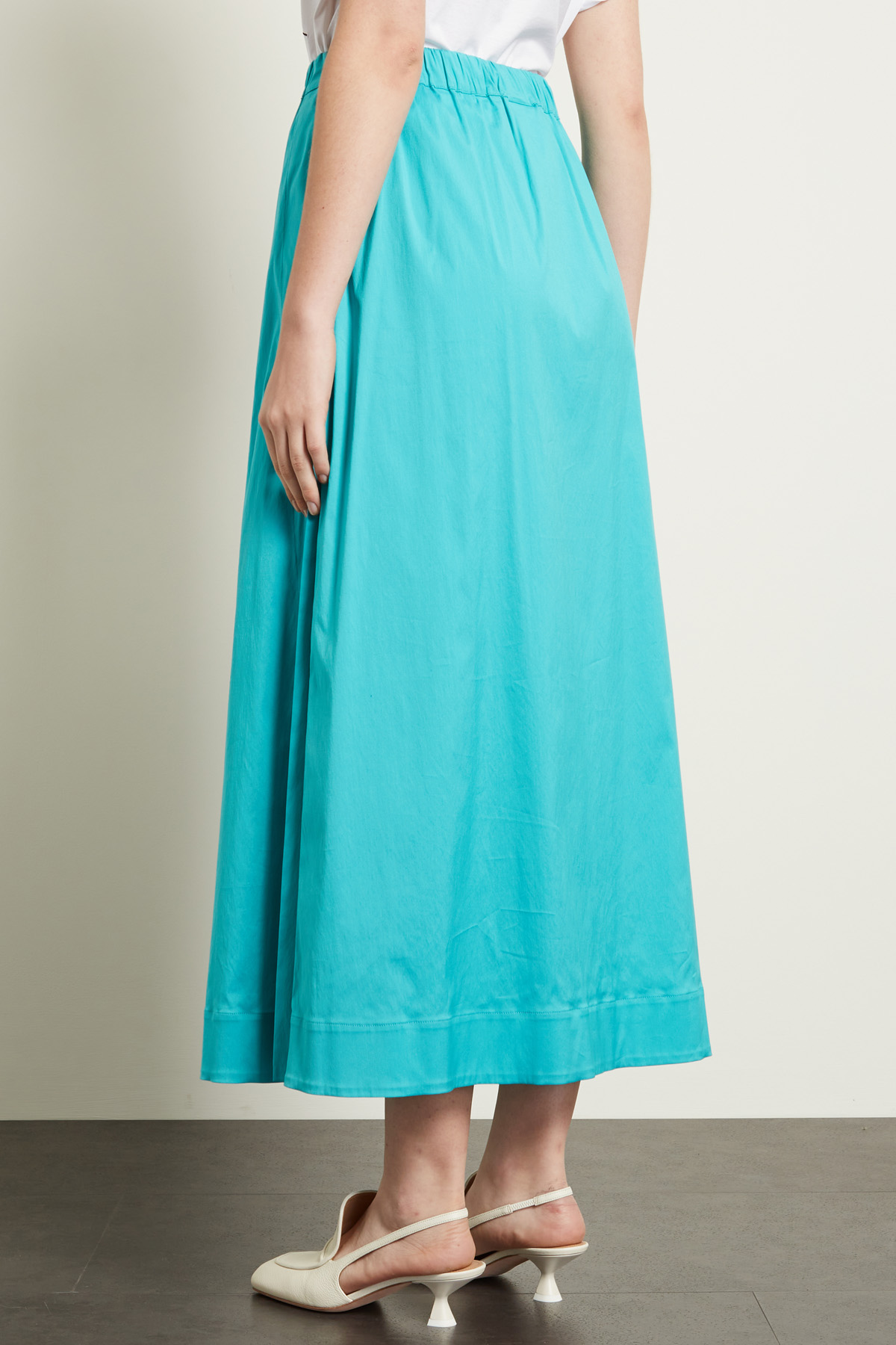 Gonna lunga dalla linea svasata realizzata in popeline di misto cotone stretch, con inserto elastico in vita, tasche alla francese e spacchi laterali. Sfoderata.