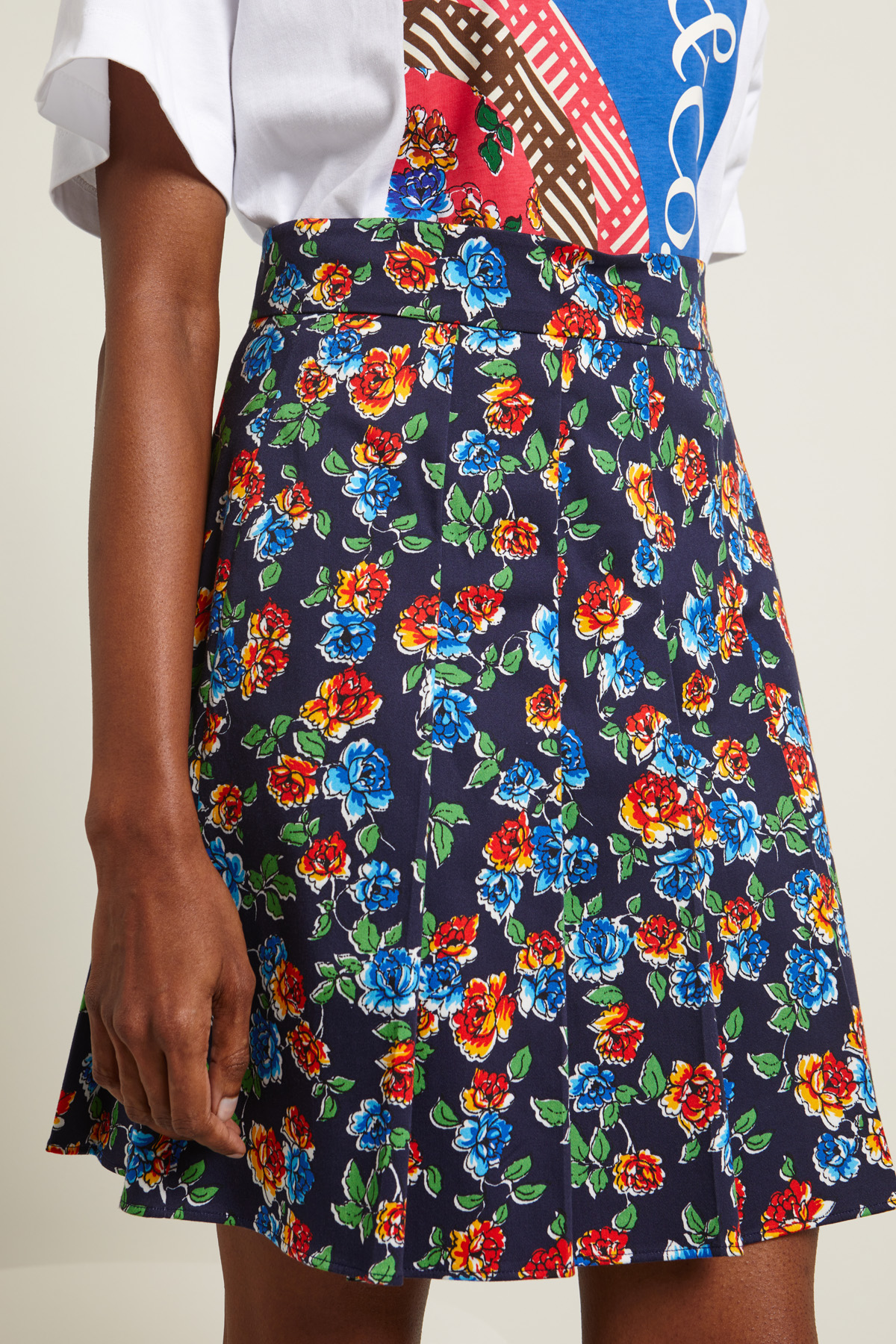 Gonna a pieghe realizzata in raso di cotone stretch con cintone in vita e allacciatura tramite zip invisibile sul fianco. Capo sfoderato.