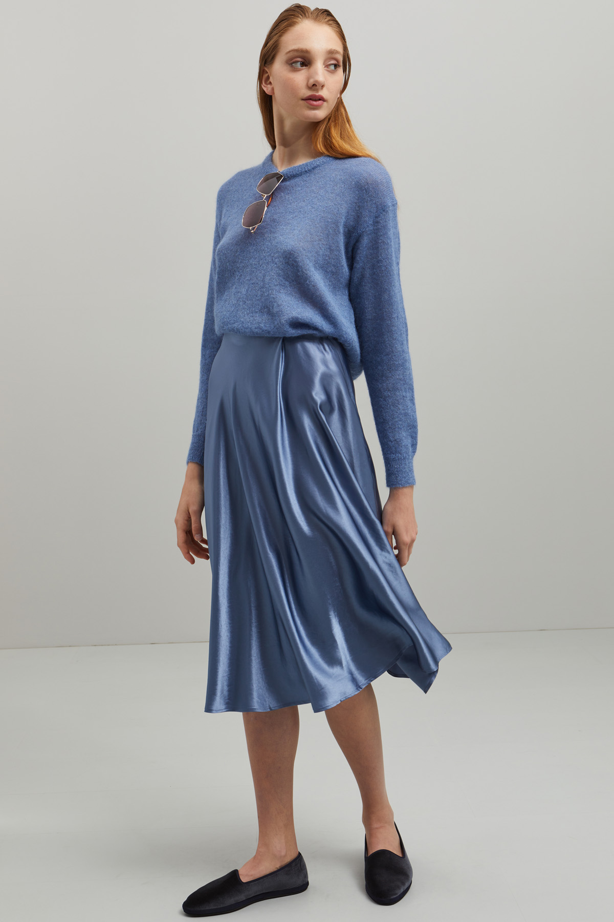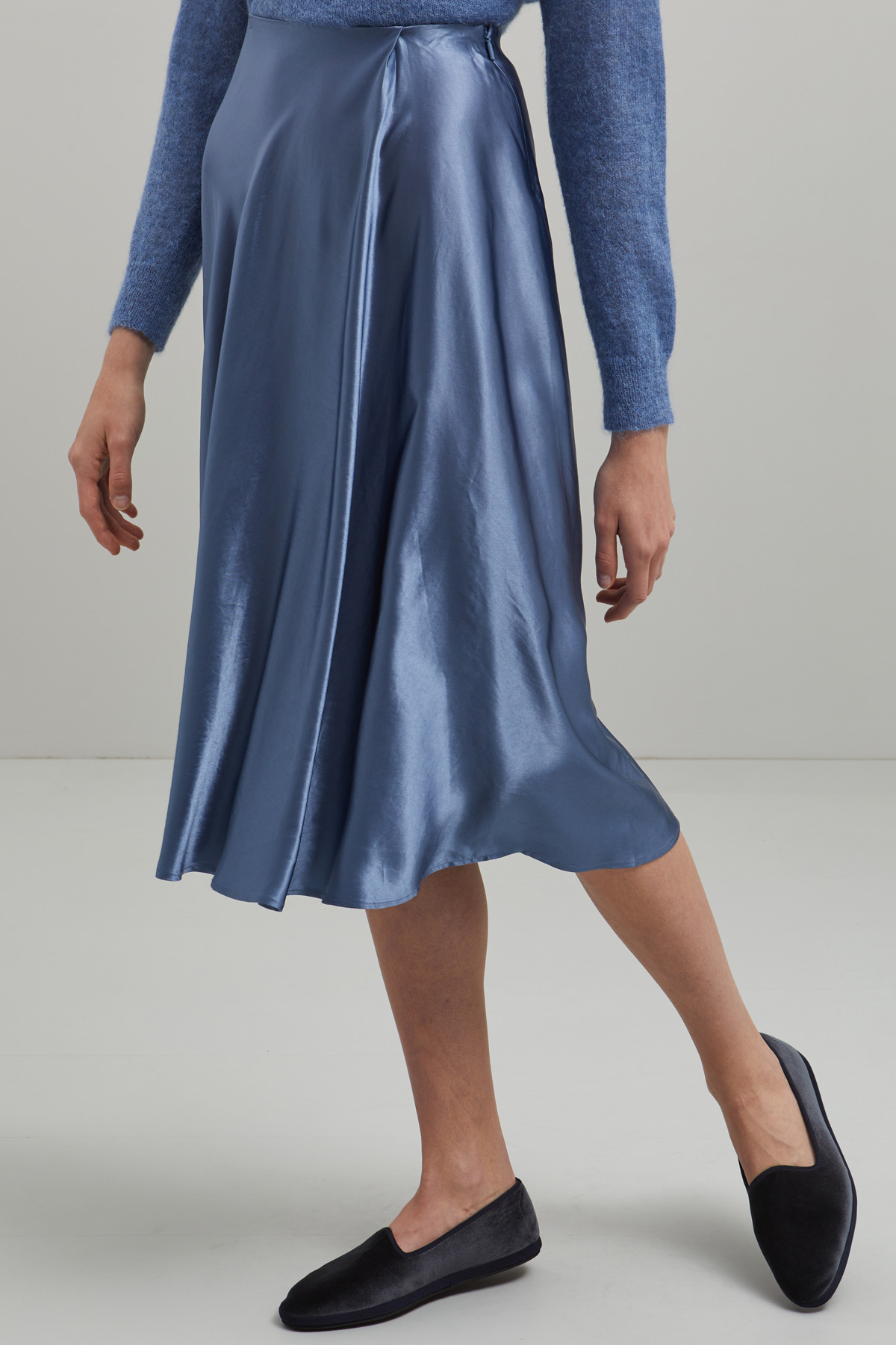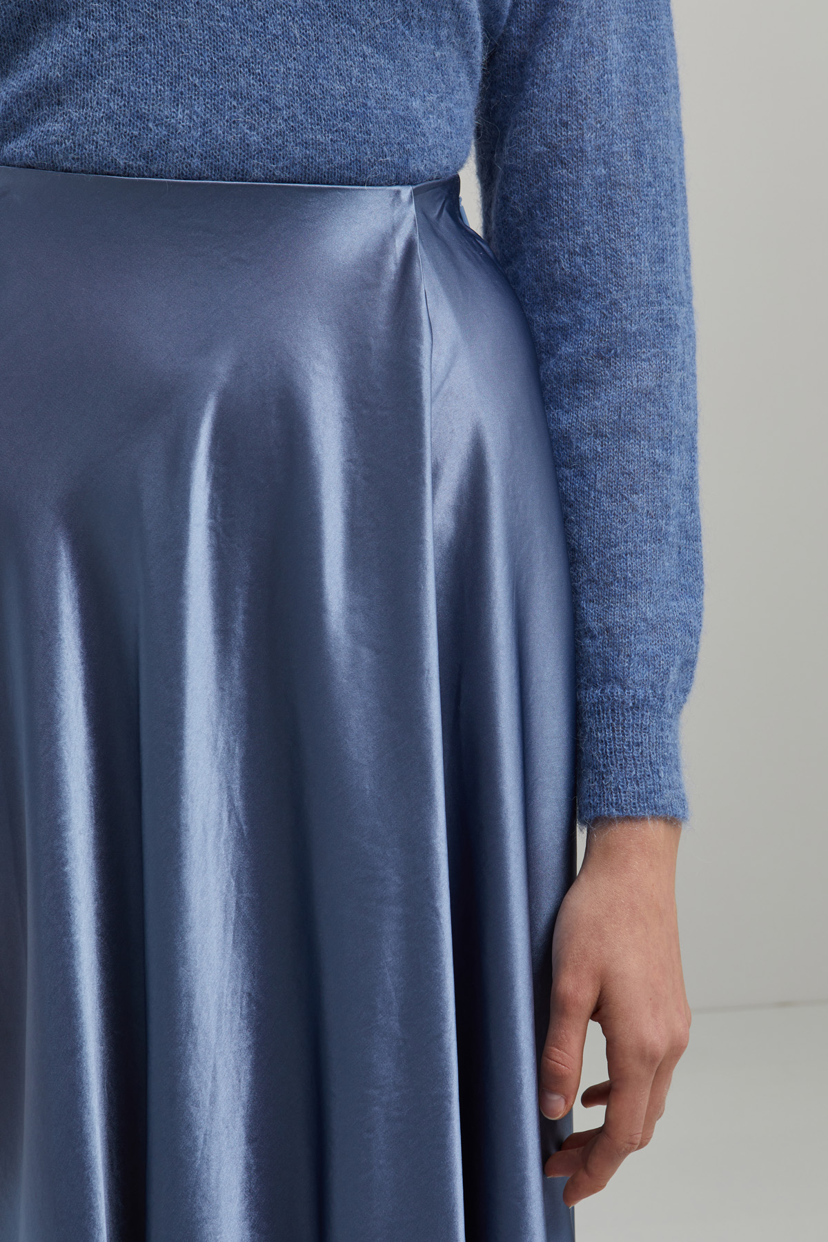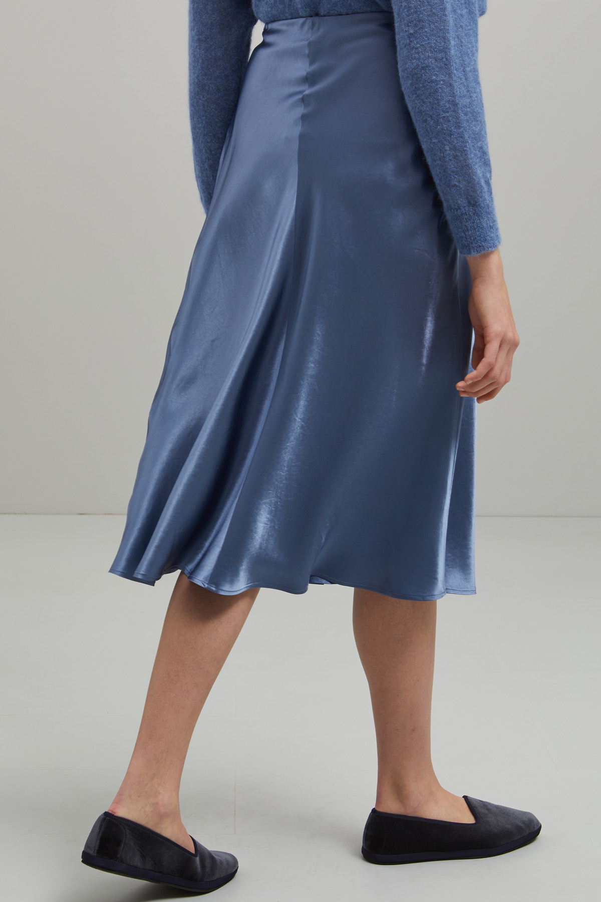Gonna midi dalla linea fluida realizzata in raso, con inserto elastico in vita, dettaglio di piega asimmetrica e chiusura tramite zip invisibile sul fianco.