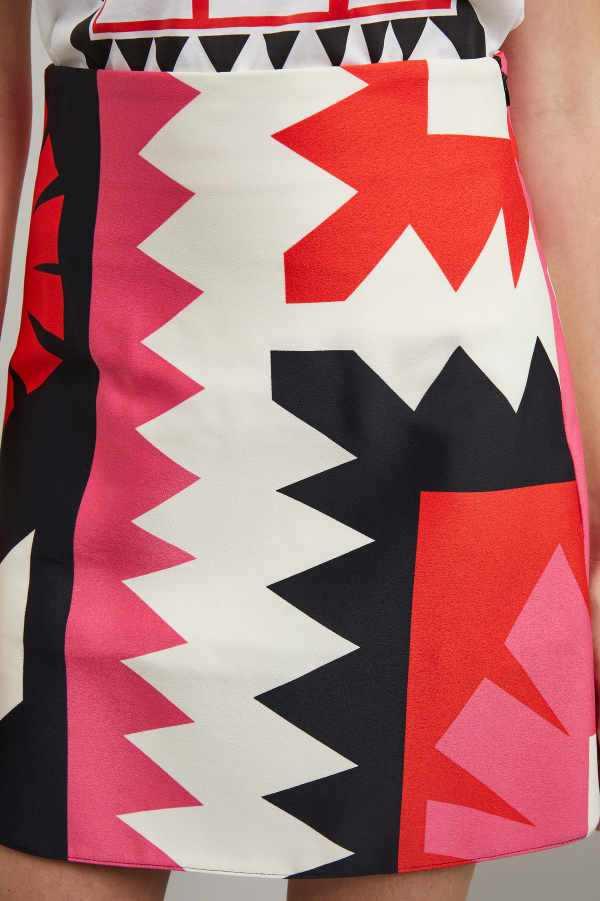 Gonna corta a vita alta dalla linea svasata realizzata in tessuto compatto stampato. Chiusura con zip invisibile sul fianco. Foderata.