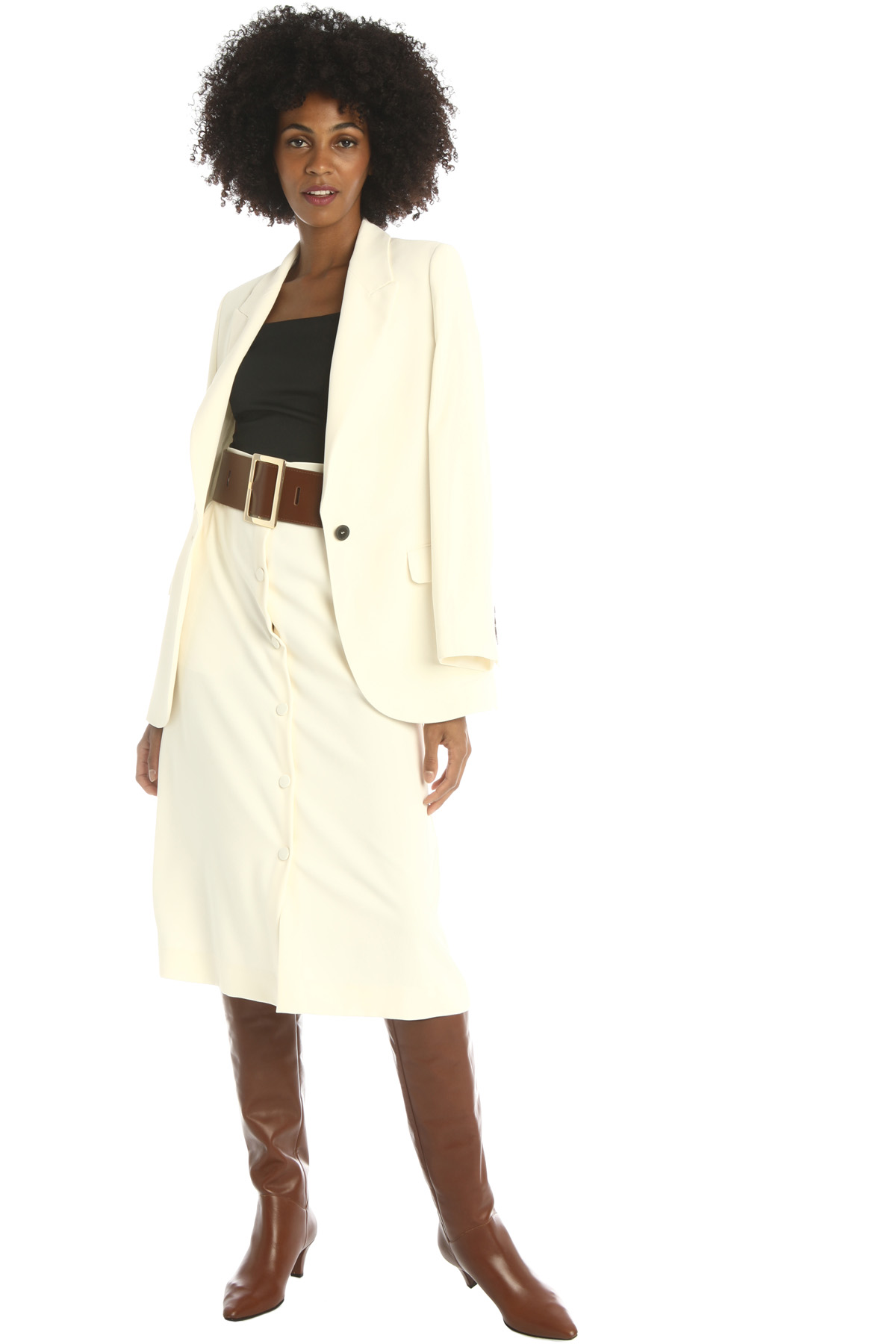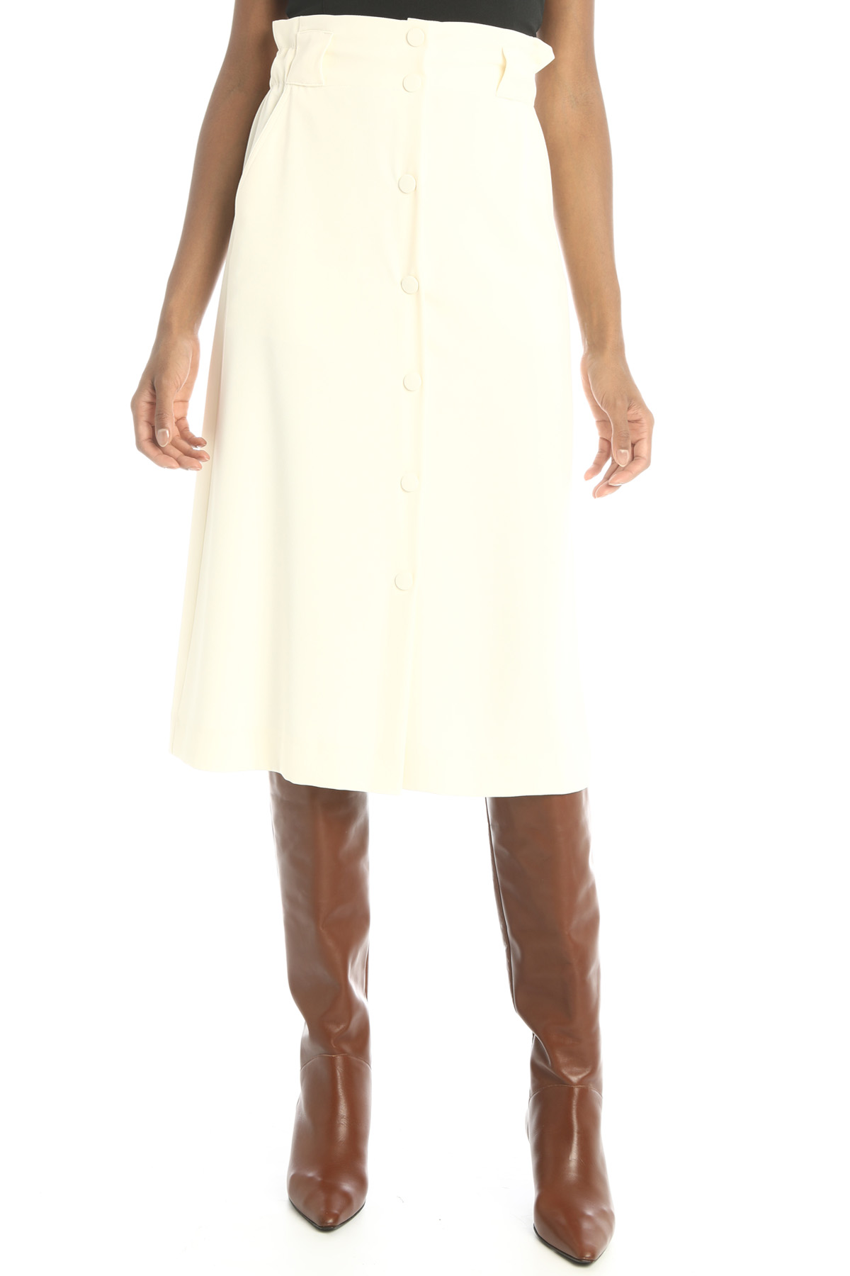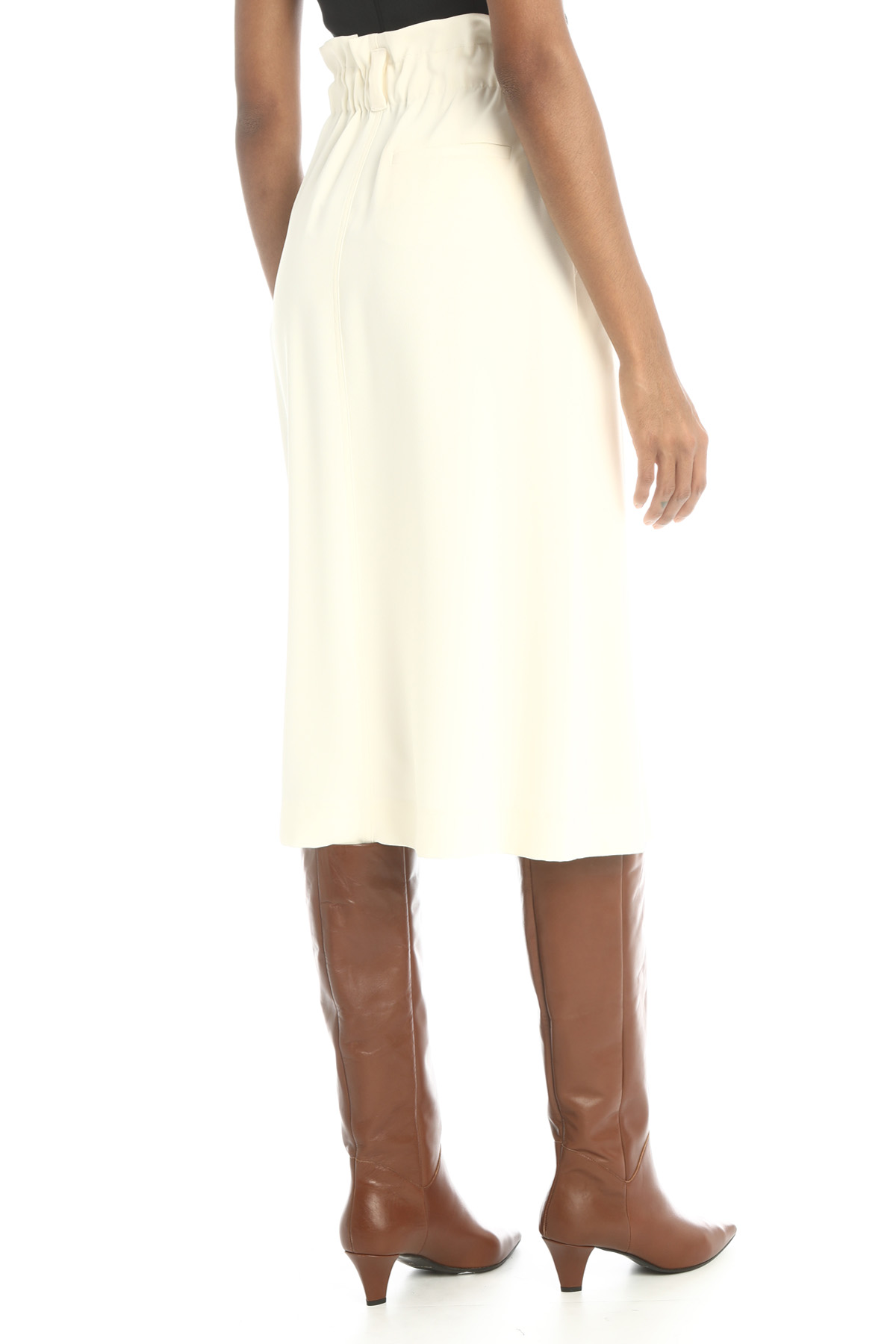 Gonna a vita alta dalla linea dritta realizzata in enver satin, con passanti e inserto elastico in vita, tasche alla francese sul davanti e a filetto nel retro, allacciatura a tutta lunghezza tramite bottoni ricoperti e cintura coordinata.