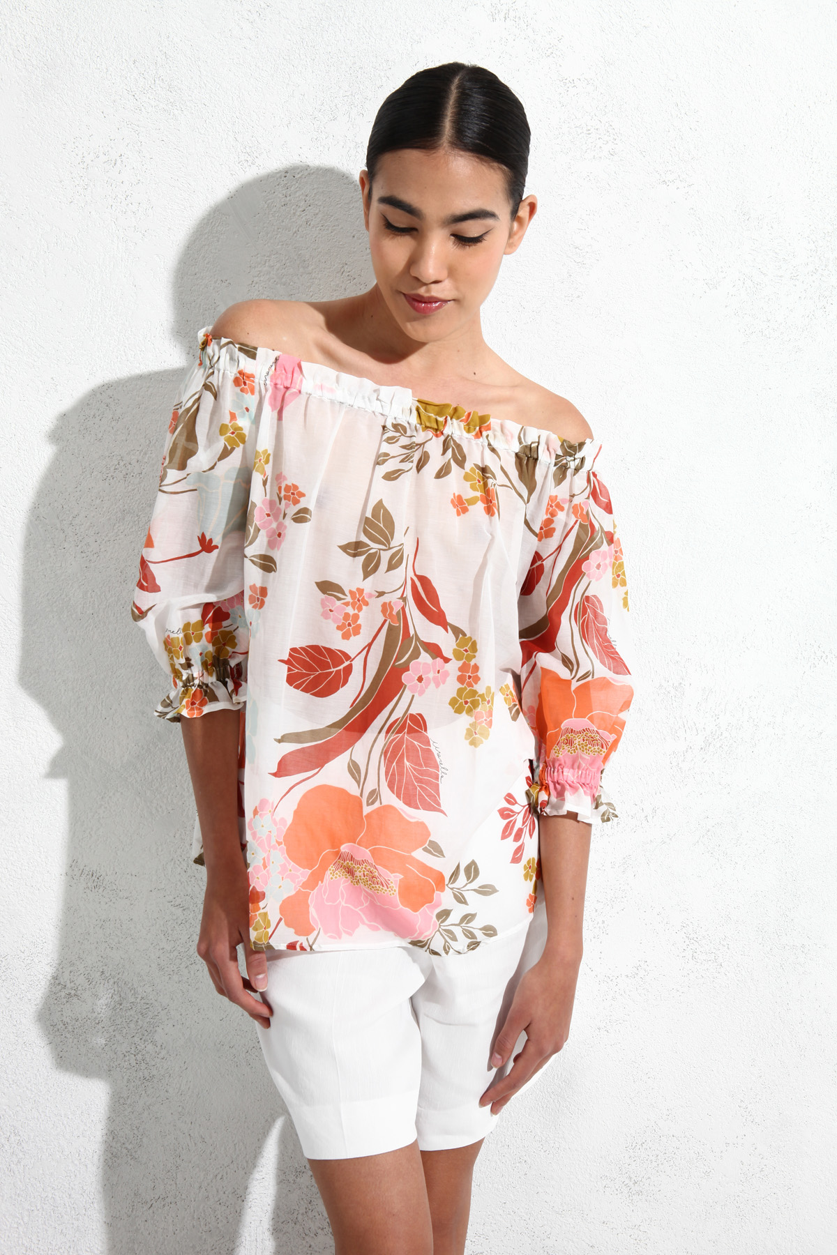 Blusa dalla linea fluida realizzata in mussola di cotone e seta stampata, con scollo off shoulder e maniche a tre quarti con inserto elastico.