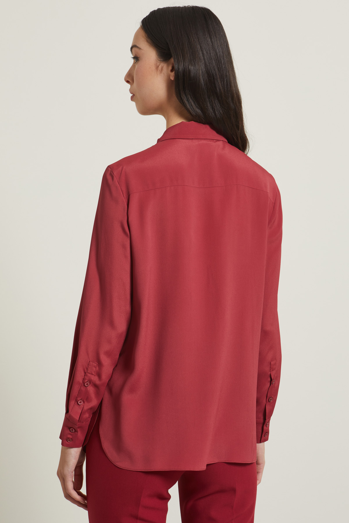 Camicia dalla linea dritta realizzata in crêpe de chine di misto seta, con colletto classico, maniche lunghe con polsino e bottoni e spacchi laterali stondati. Allacciatura nascosta tramite bottoni.