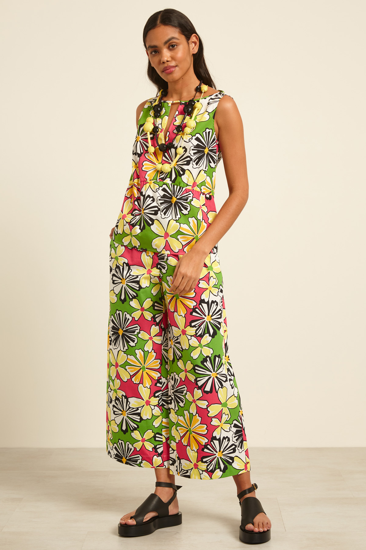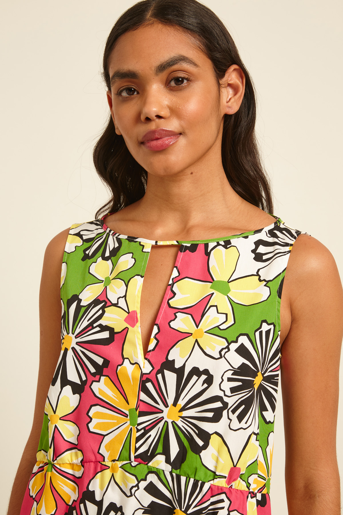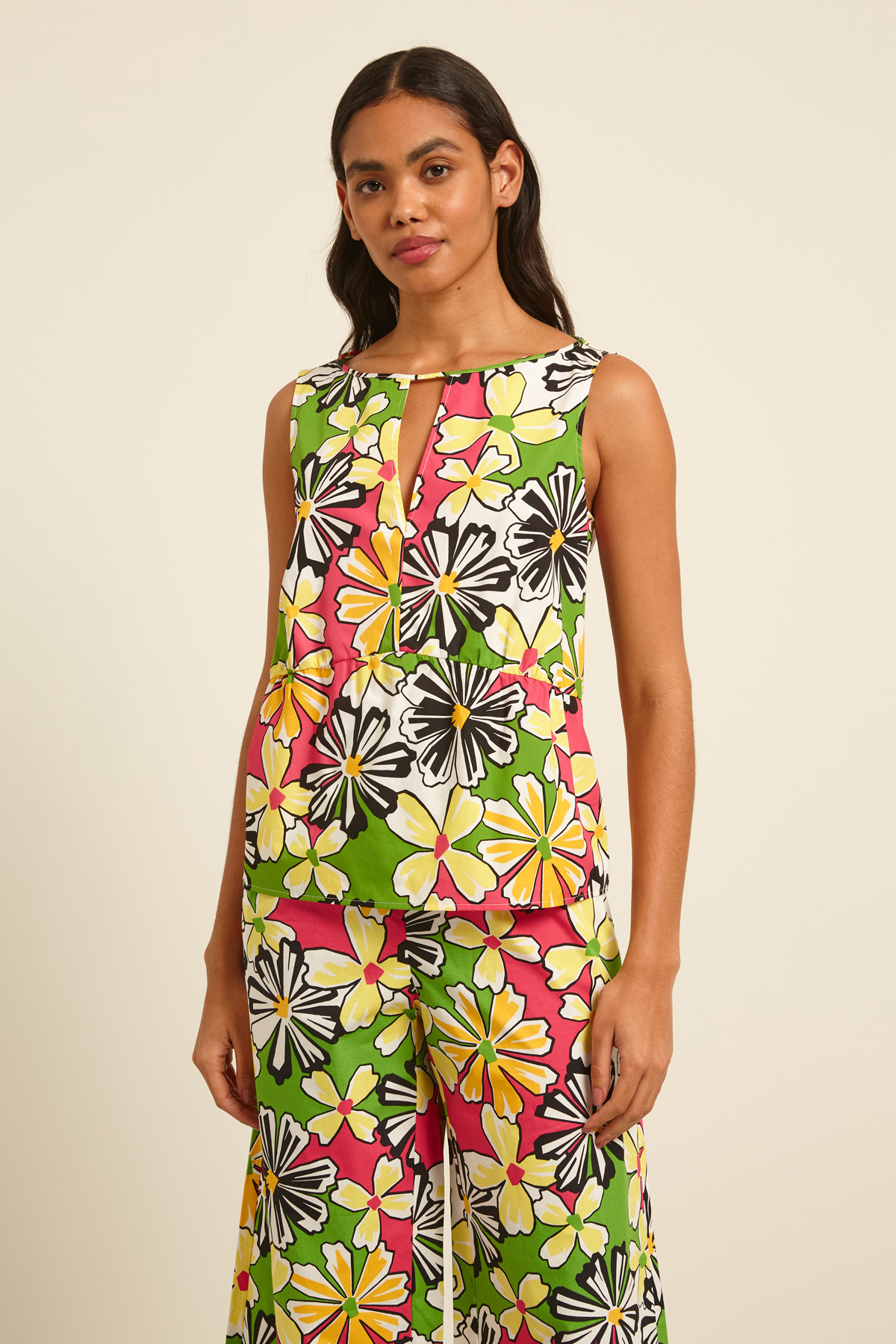 Top smanicato dalla linea dritta realizzato in popeline di puro cotone stampato, con scollo rotondo e apertura a V sul davanti, spalline spesse e dettaglio di balza.