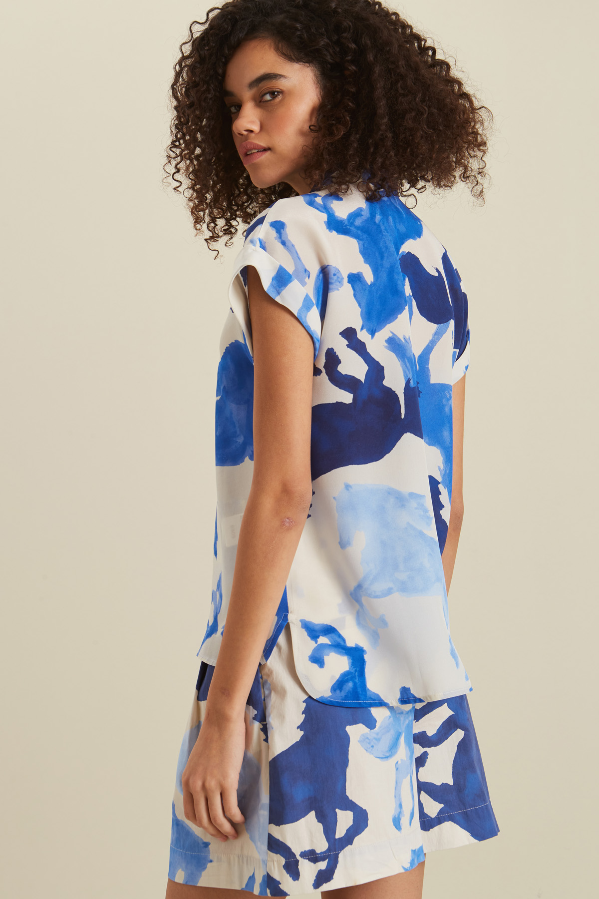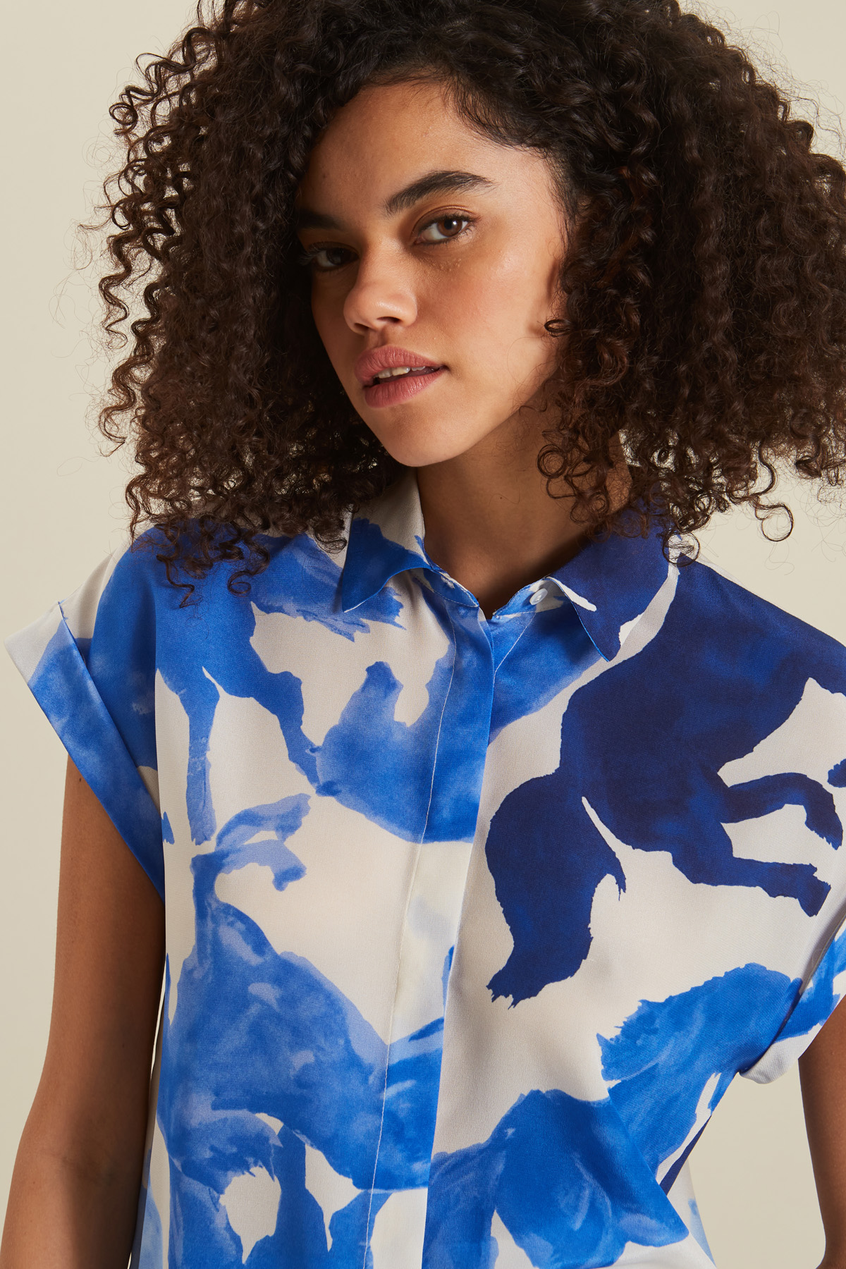 Top dalla linea sfiancata realizzato in crèpe de chine di pura seta stampata, con collo a camicia, giromanica sceso con risvolto, orlo asimmetrico più lungo dietro con spacchi laterali e chiusura a bottoni.