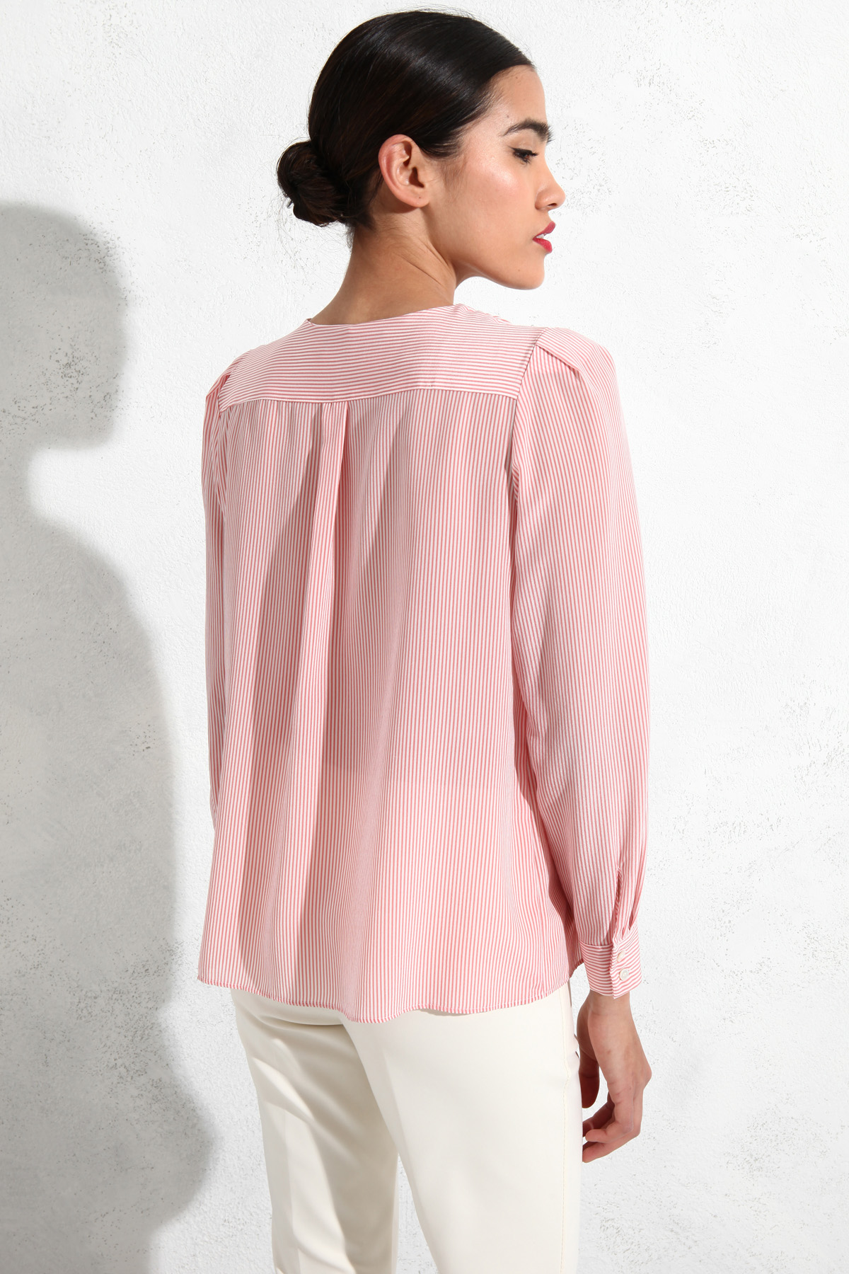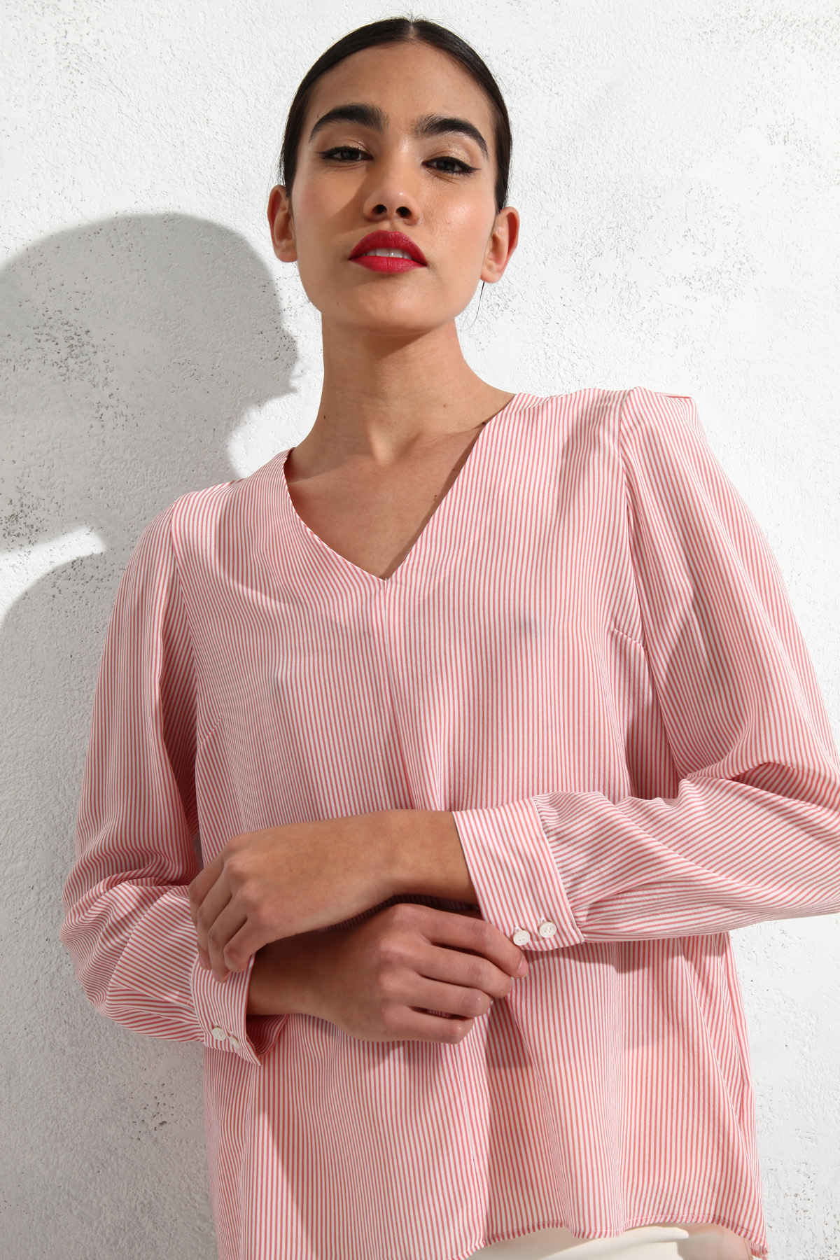 Blusa dalla linea dritta realizzata in crêpe di seta tinto filo, con scollo a V e maniche lunghe con polsino.