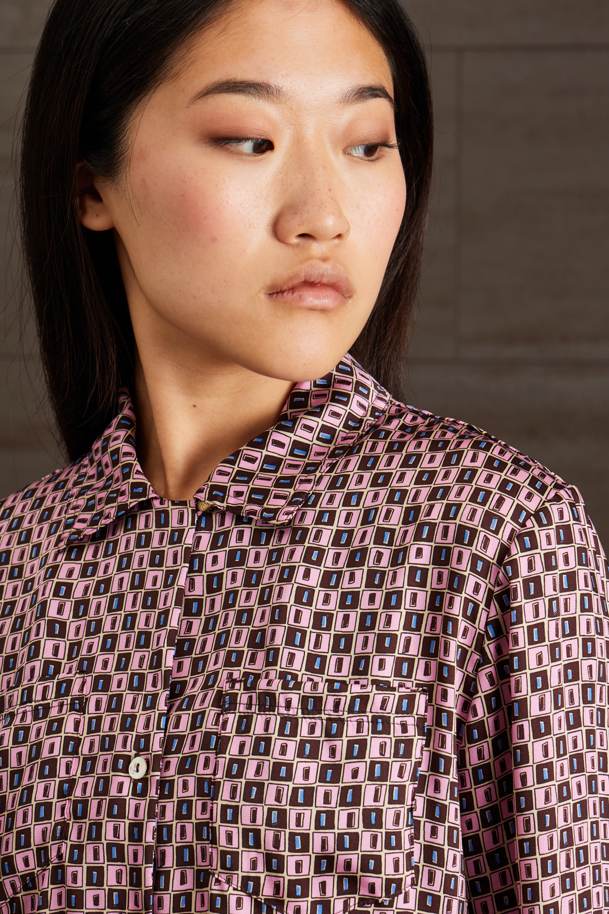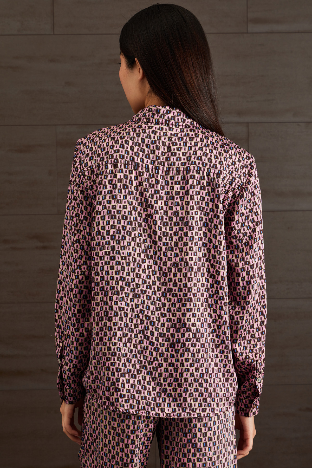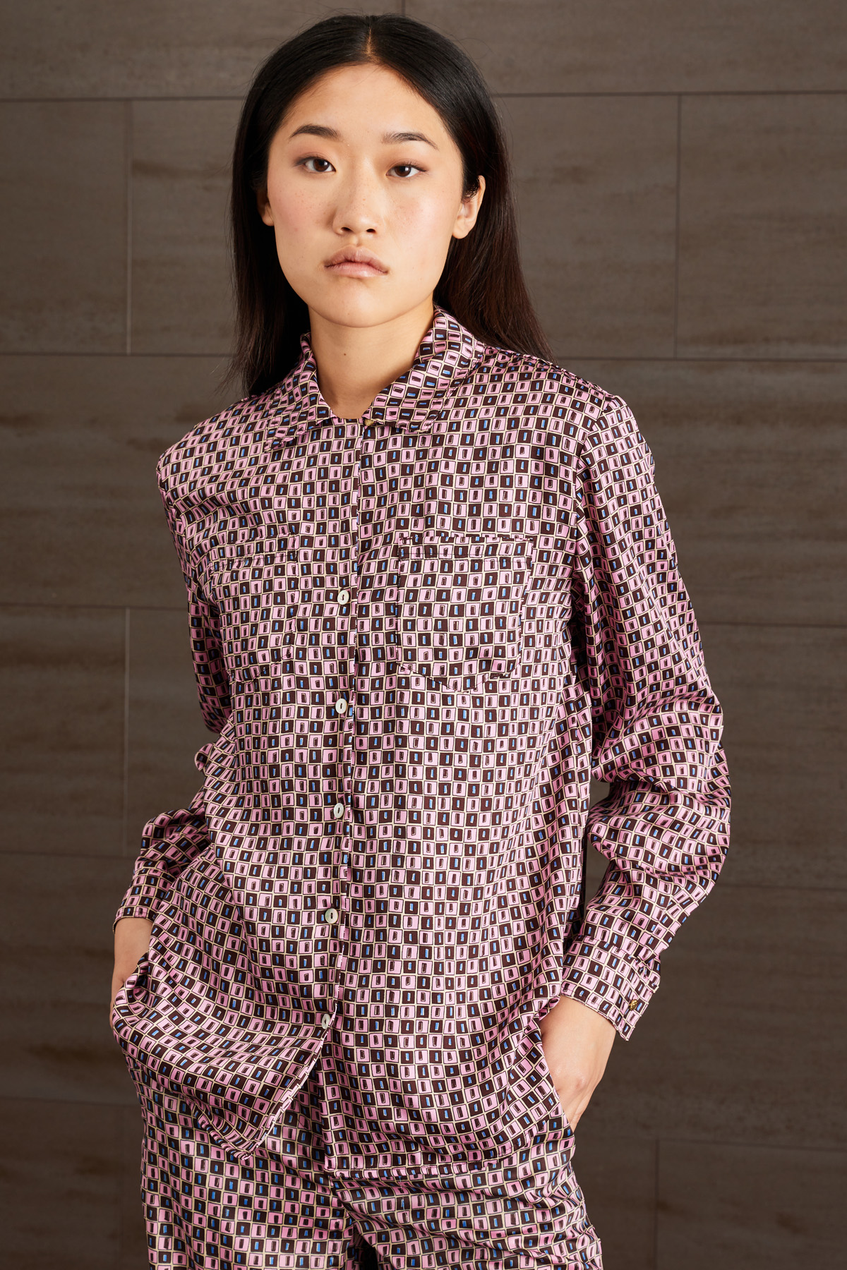 Camicia dalla linea fluida realizzata in twill stampato, con colletto classico, maniche lunghe con polsino e bottoni, taschini applicati al petto e allacciatura tramite bottoni a vista.