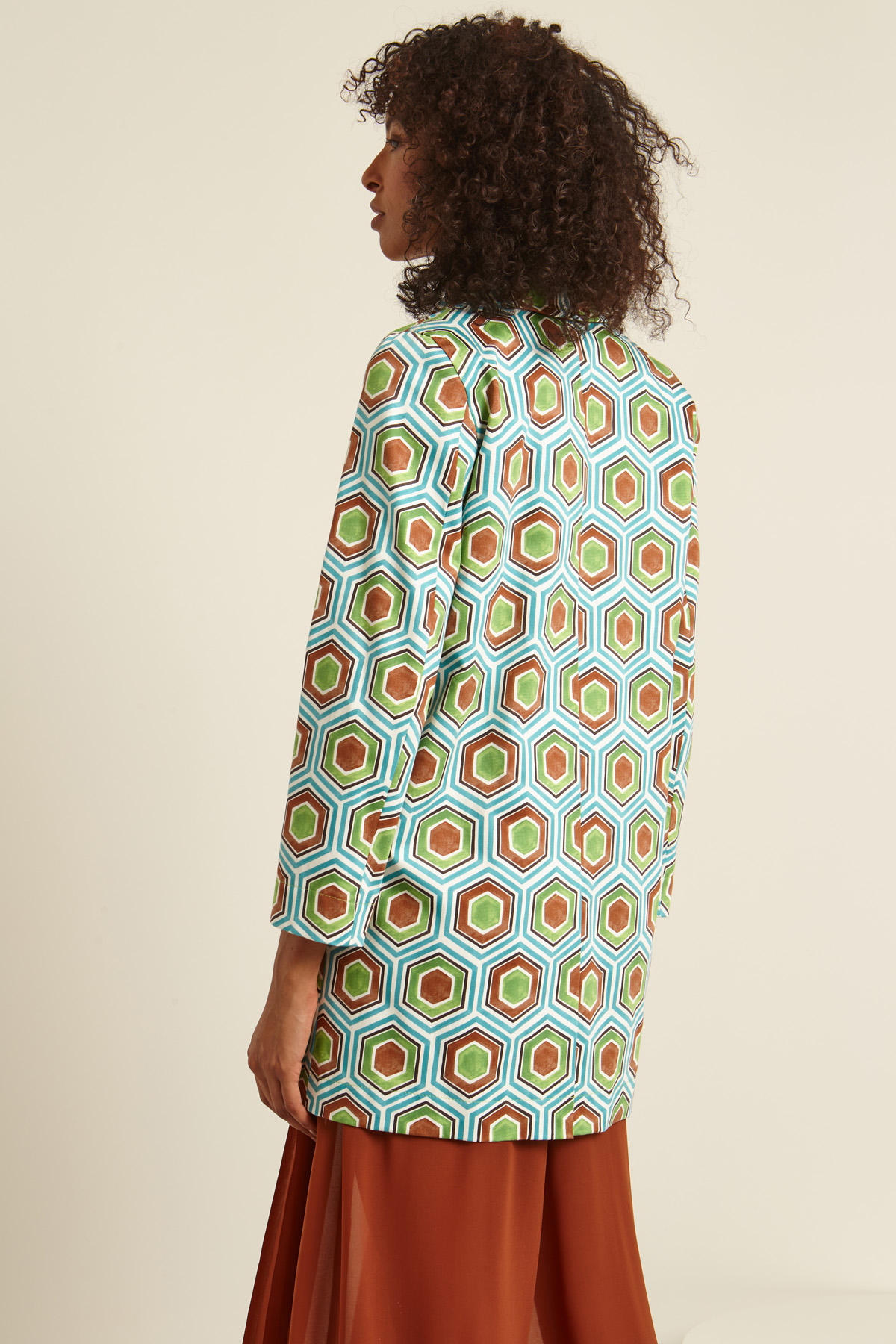 Soprabito dalla linea dritta realizzato in raso di cotone stretch stampato, con collo a rever, maniche lunghe, tasche a filettone e spacco nel retro. Allacciatura monopetto tramite bottone. Foderato.