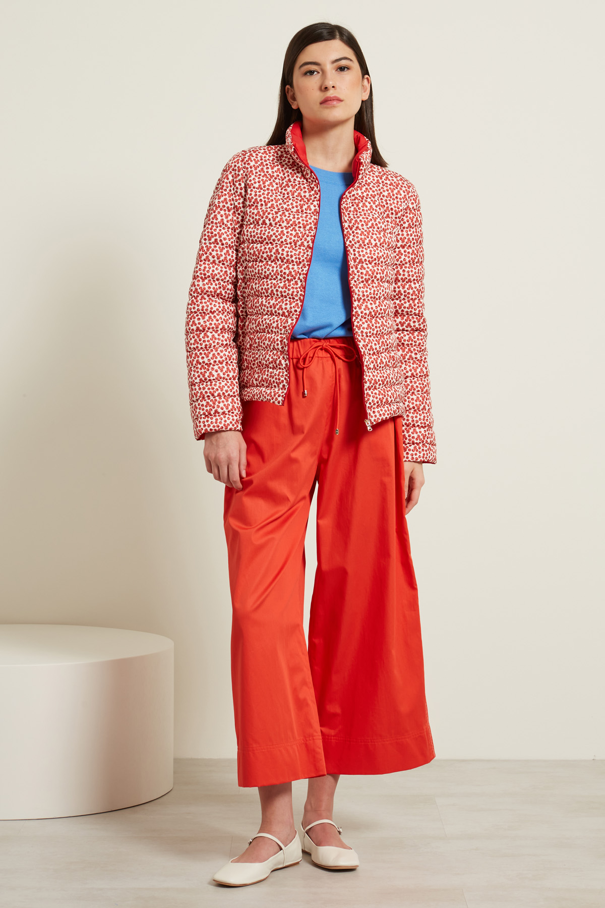 Pantaloni cropped dalla linea svasata realizzati in raso di puro cotone, con coulisse e inserto elastico in vita. Tasche alla francese sul davanti.