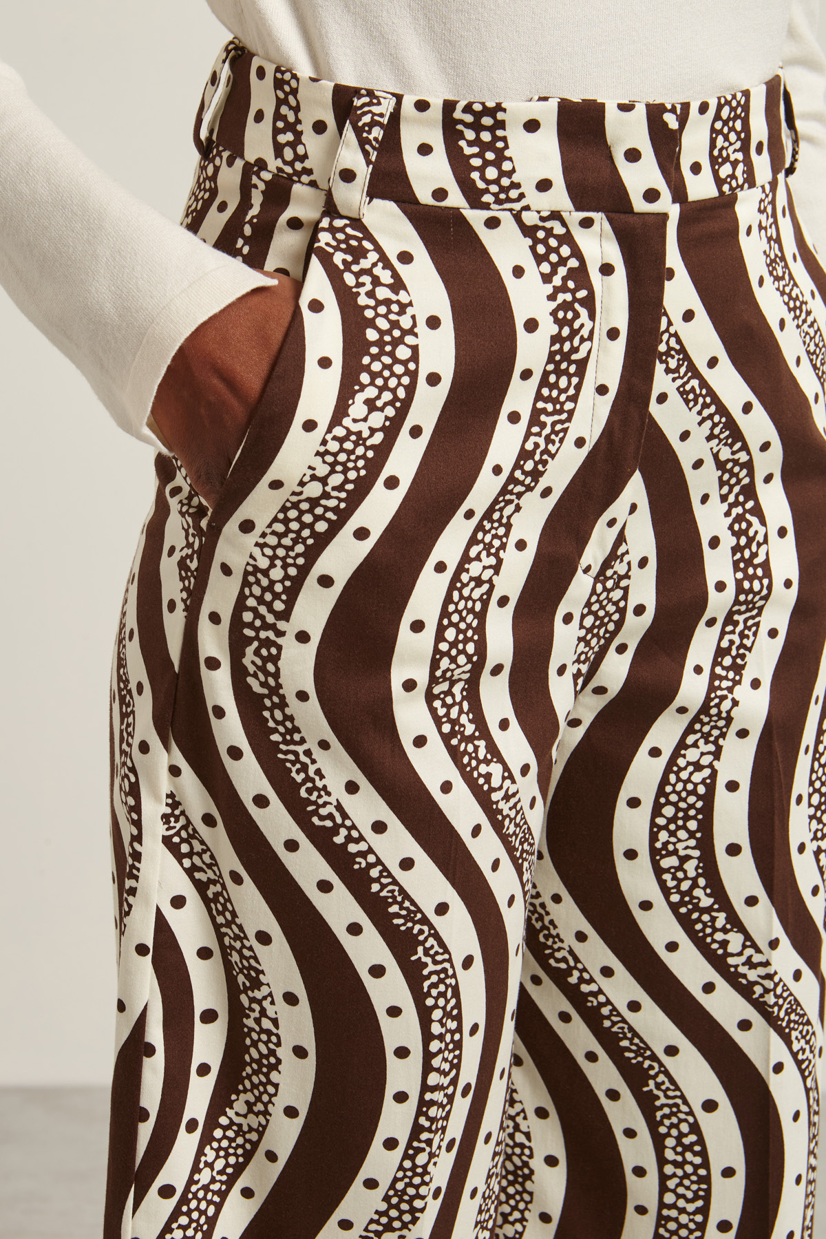 Pantaloni dalla linea ampia realizzati in raso di cotone stretch con passanti in vita, tasche alla francese davanti e filetto nel retro. Allacciatura nascosta tramite zip, bottone e gancio.