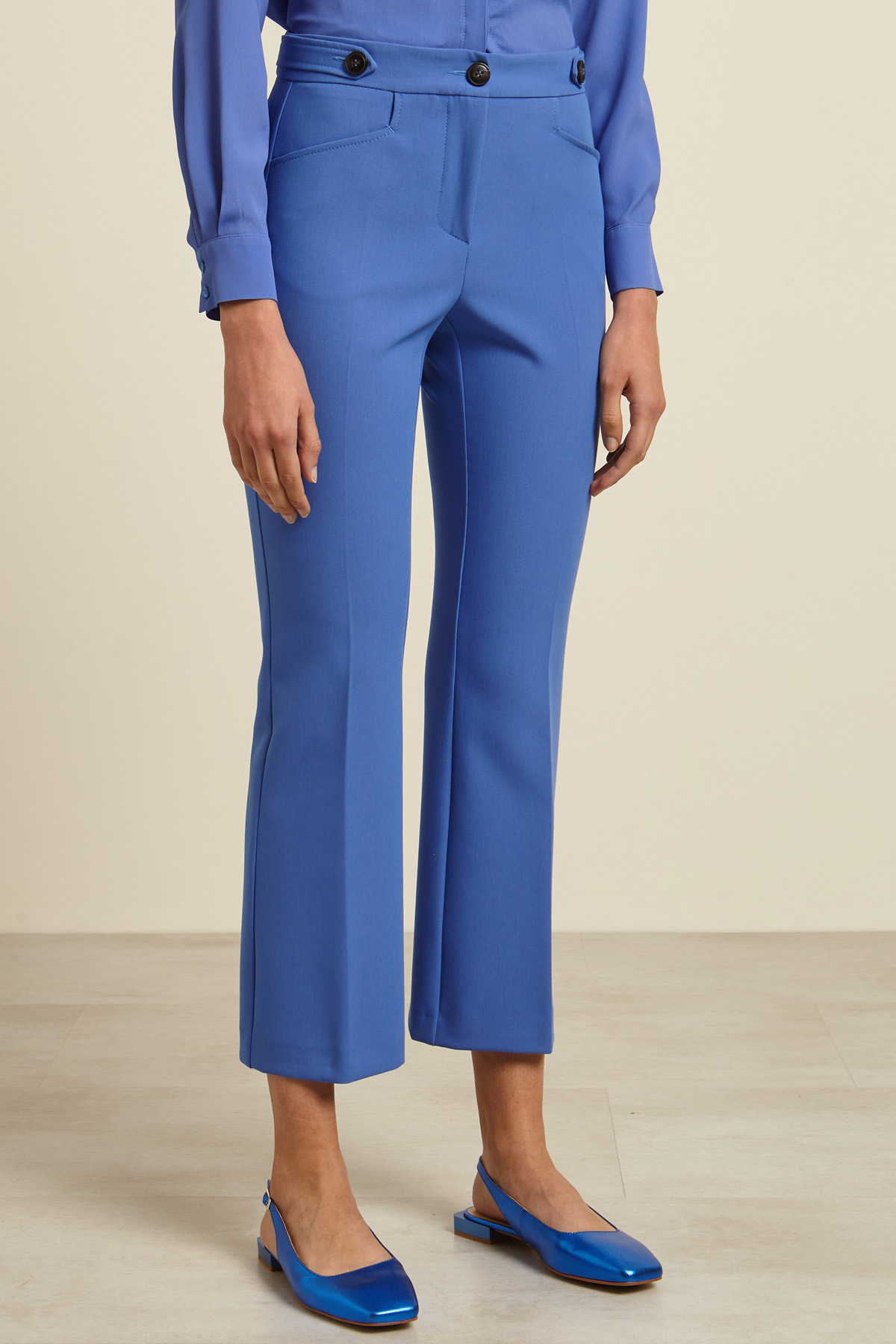 Pantaloni dalla linea dritta realizzati in tessuto di misto viscosa stretch con dettagli di alamari in vita, tasche alla francese sul davanti e a filetto nel retro. Allacciatura nascosta tramite zip e bottone a vista.