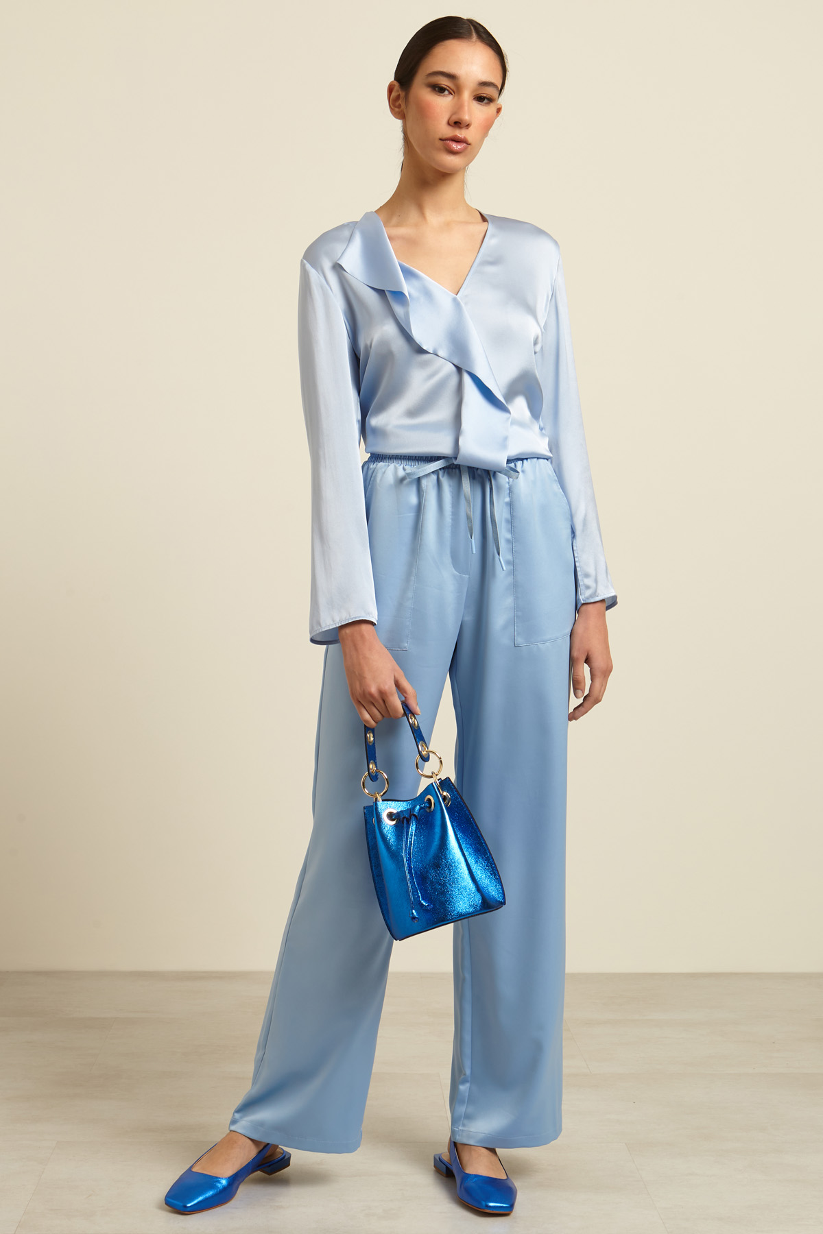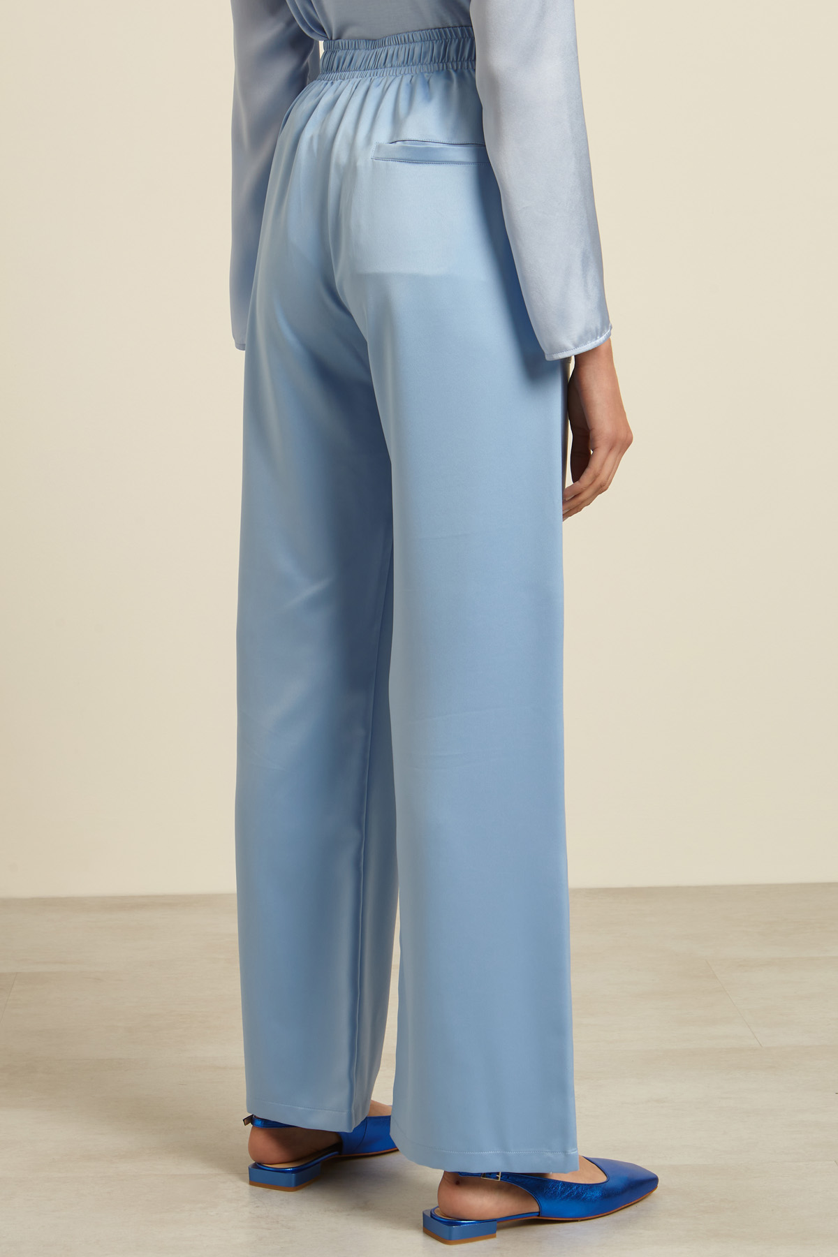 Pantaloni ampi dalla linea fluida realizzati in raso, con vita elastica con coulisse, tasche alla francese con applicazione davanti, e singola a filetto dietro.