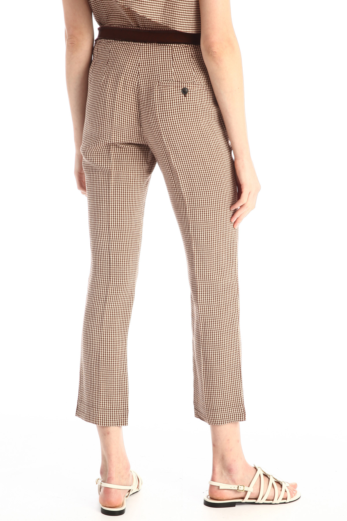 Pantaloni capri realizzati in tessuto di viscosa e lino tinto filo, con nastro in gros-grain sul cintone, tasche laterali alla francese a filetto con bottone nel retro, allacciatura nascosta tramite zip, bottone e gancio.