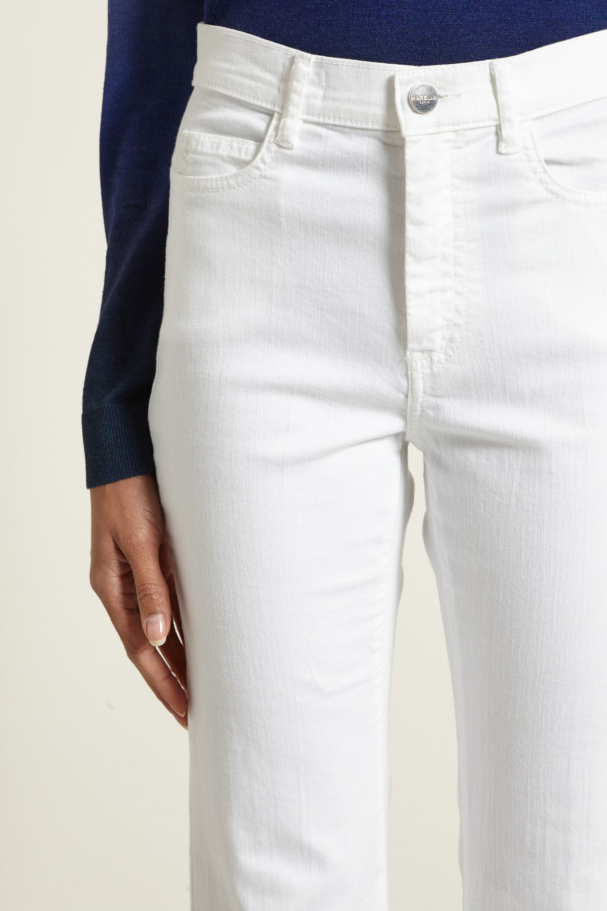 Pantaloni dalla linea flare realizzati in drill di cotone stretch, con passanti in vita e cinque tasche. Allacciatura tramite zip nascosta e bottone metallico.