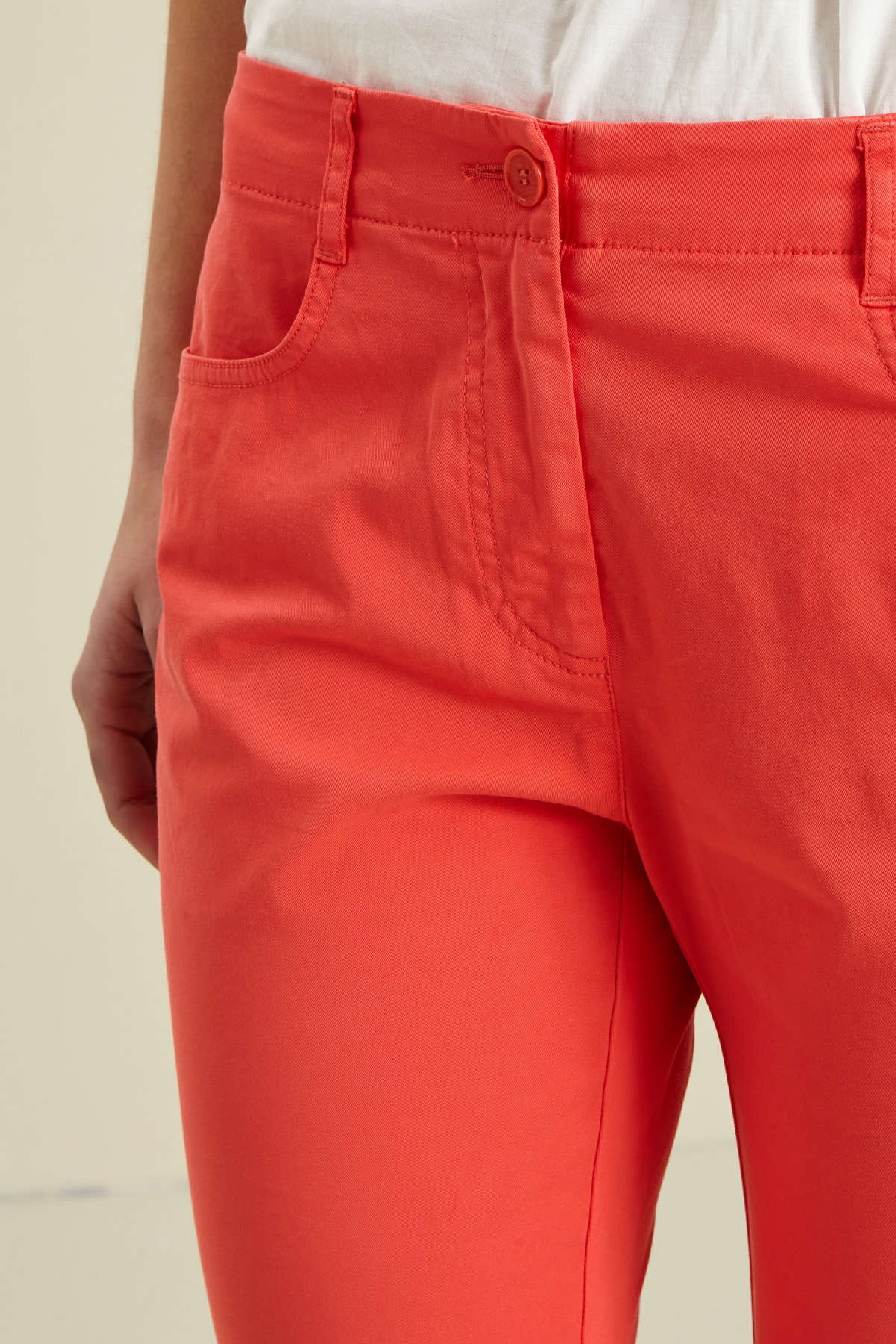 Pantaloni skinny realizzati in gabardina di cotone stretch. Modello a quattro tasche, con passanti in vita e chiusura tramite zip coperta e bottone.