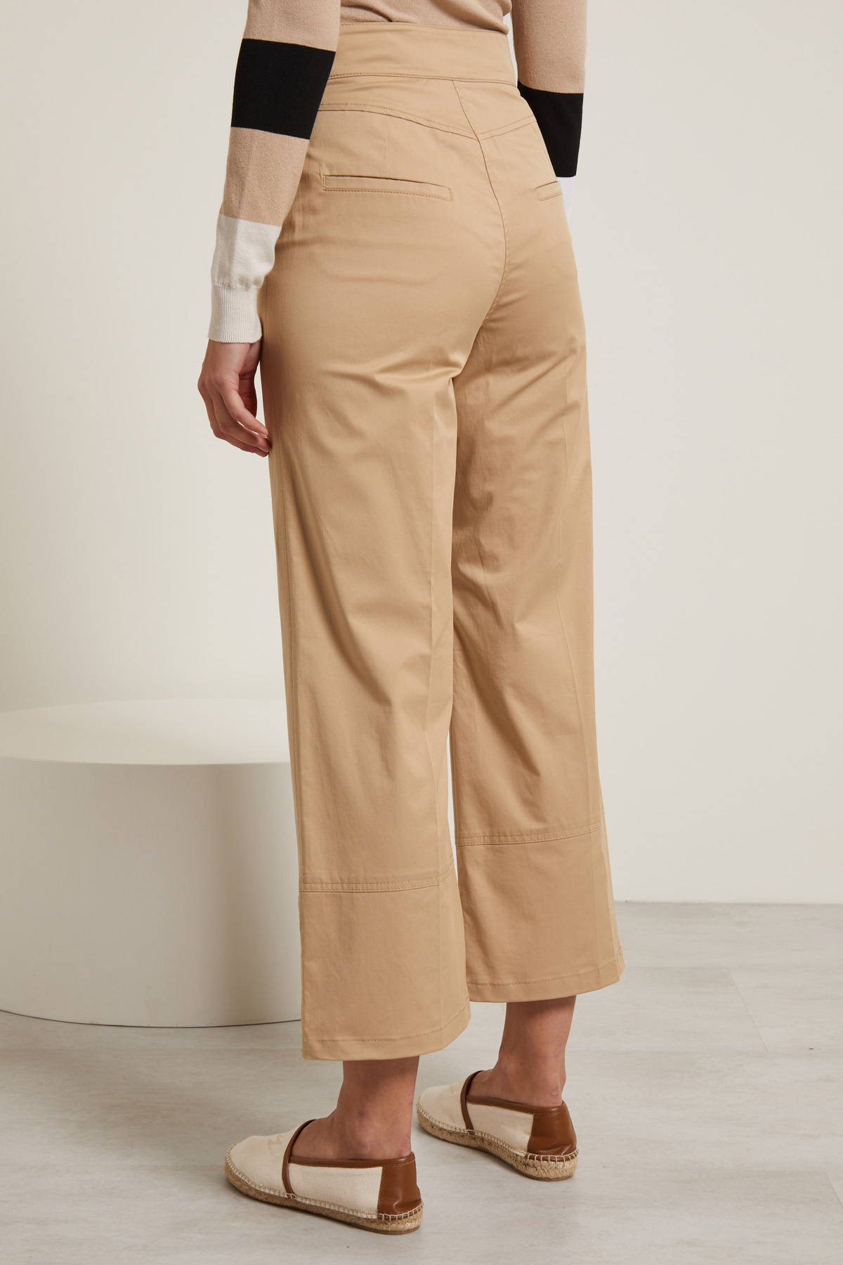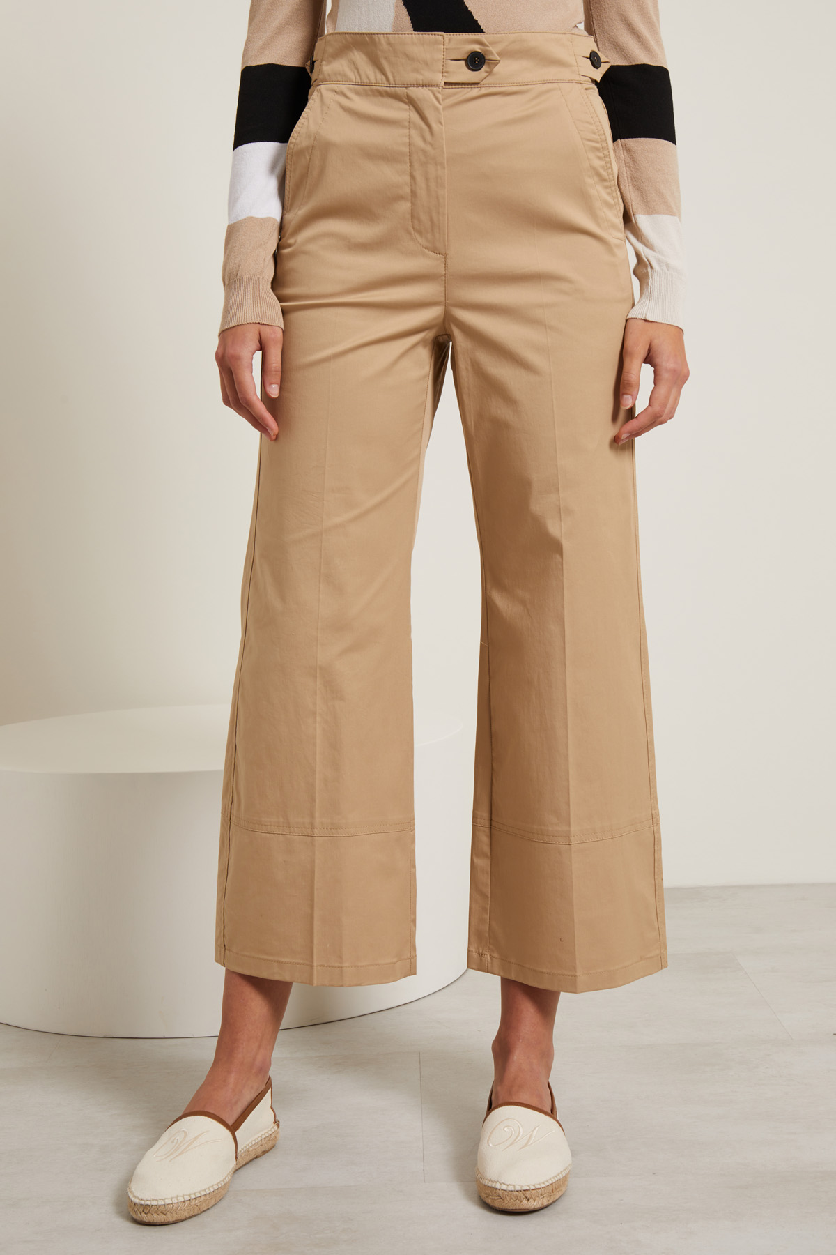 Pantaloni dalla linea svasata realizzati in gabardina di cotone stretch, con alamari in vita, tasche alla francese sul davanti e a filetto nel retro, piega stirata. Allacciatura tramite zip nascosta e bottoni.