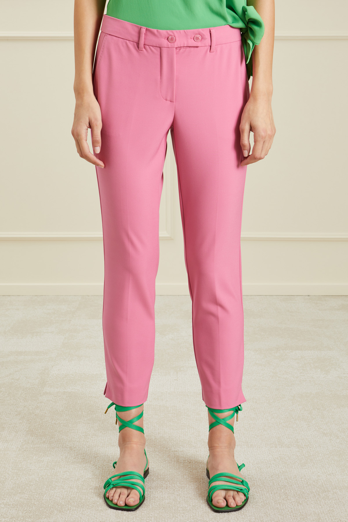 Pantaloni a sigaretta realizzati in tessuto di misto viscosa stretch, con passanti in vita, tasche alla francese rifinite a puntino sul davanti e a doppio filetto nel retro, spacchetti a fondo capo e allacciatura tramite zip nascosta e bottoni.