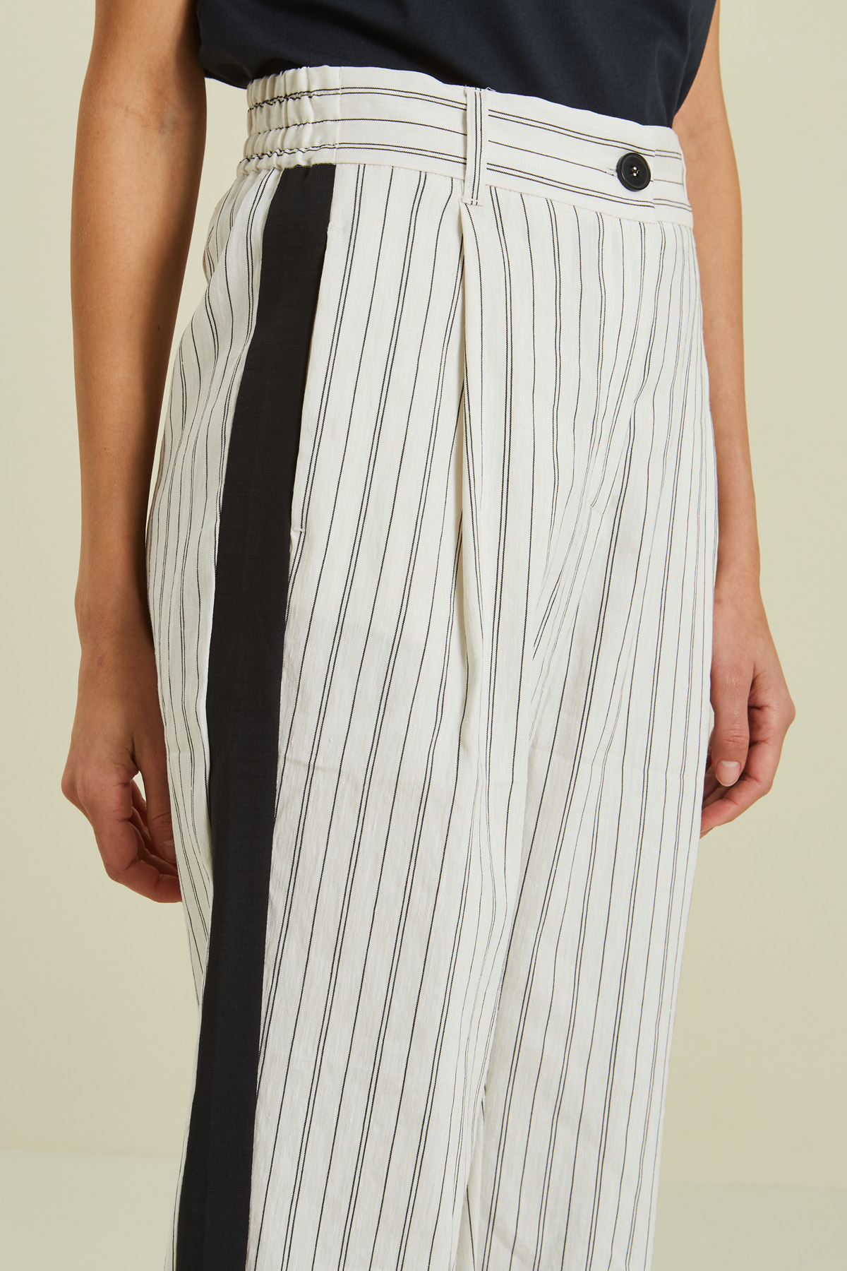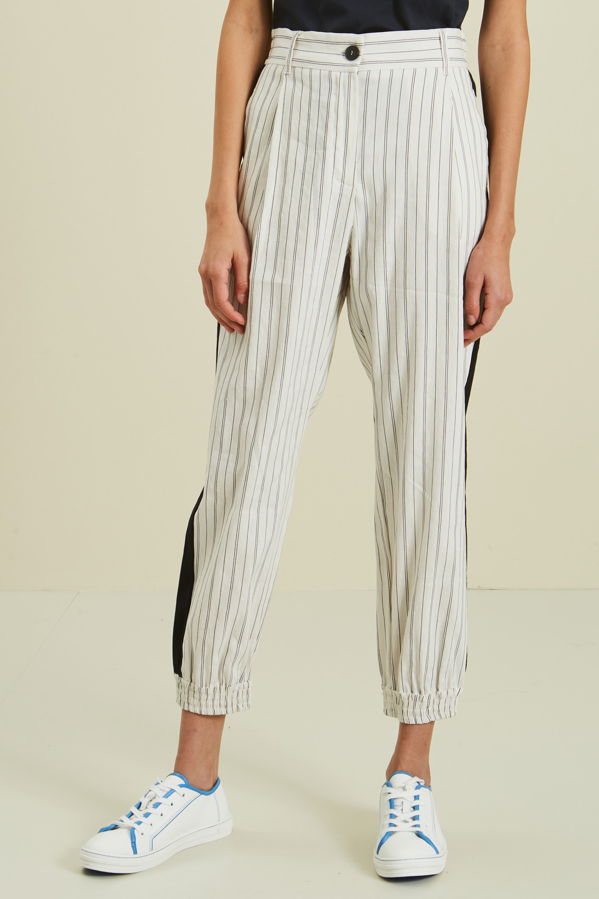 Pantaloni stile jogging realizzati in misto lino e viscosa stretch, con cintone elasticizzato in vita dietro, tasche laterali inserite in cucitura e taschini a filetto dietro, polsino elasticizzato a fondo capo e chiusura tramite zip coperta e bottone.