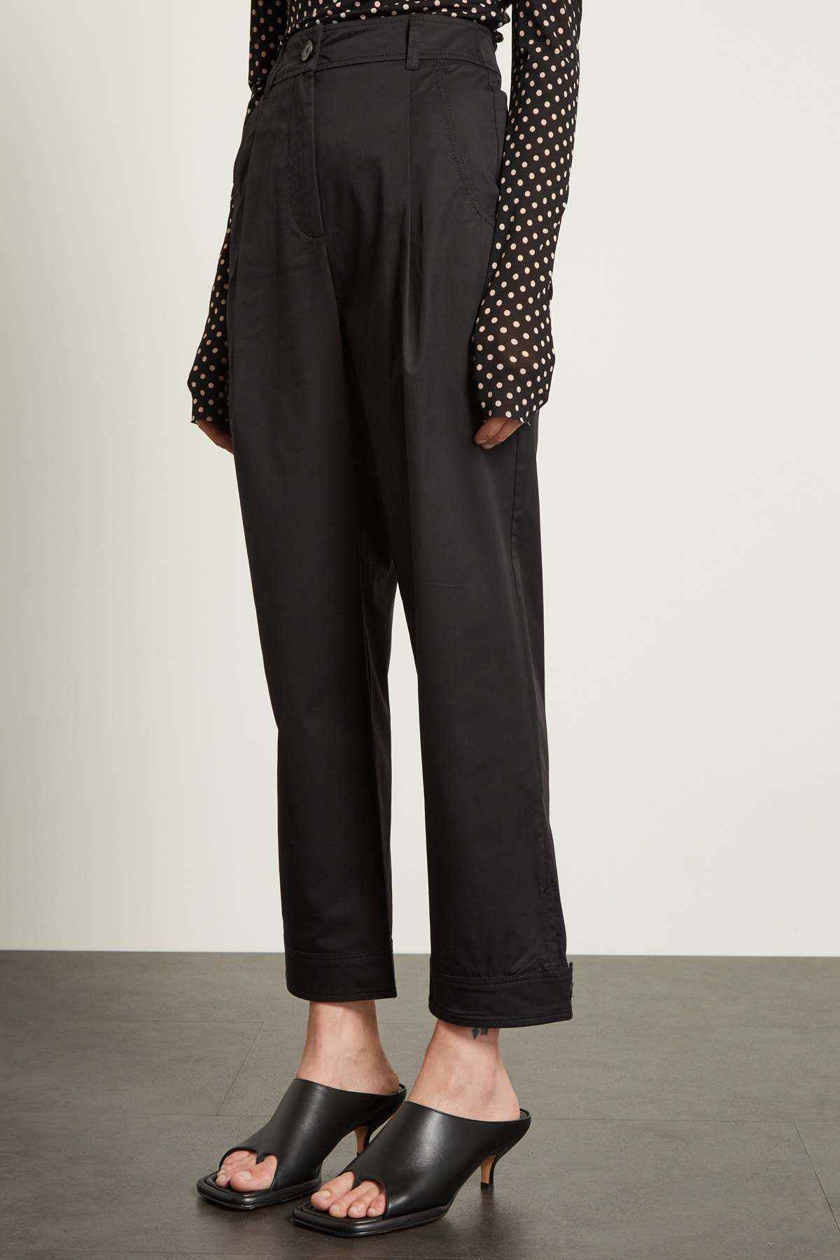 Pantaloni carrot realizzati in levantina di cotone stretch, con passanti e pieghe cucite in vita, tasche alla francese davanti e applicata nel retro. Allacciatura tramite zip e bottone.