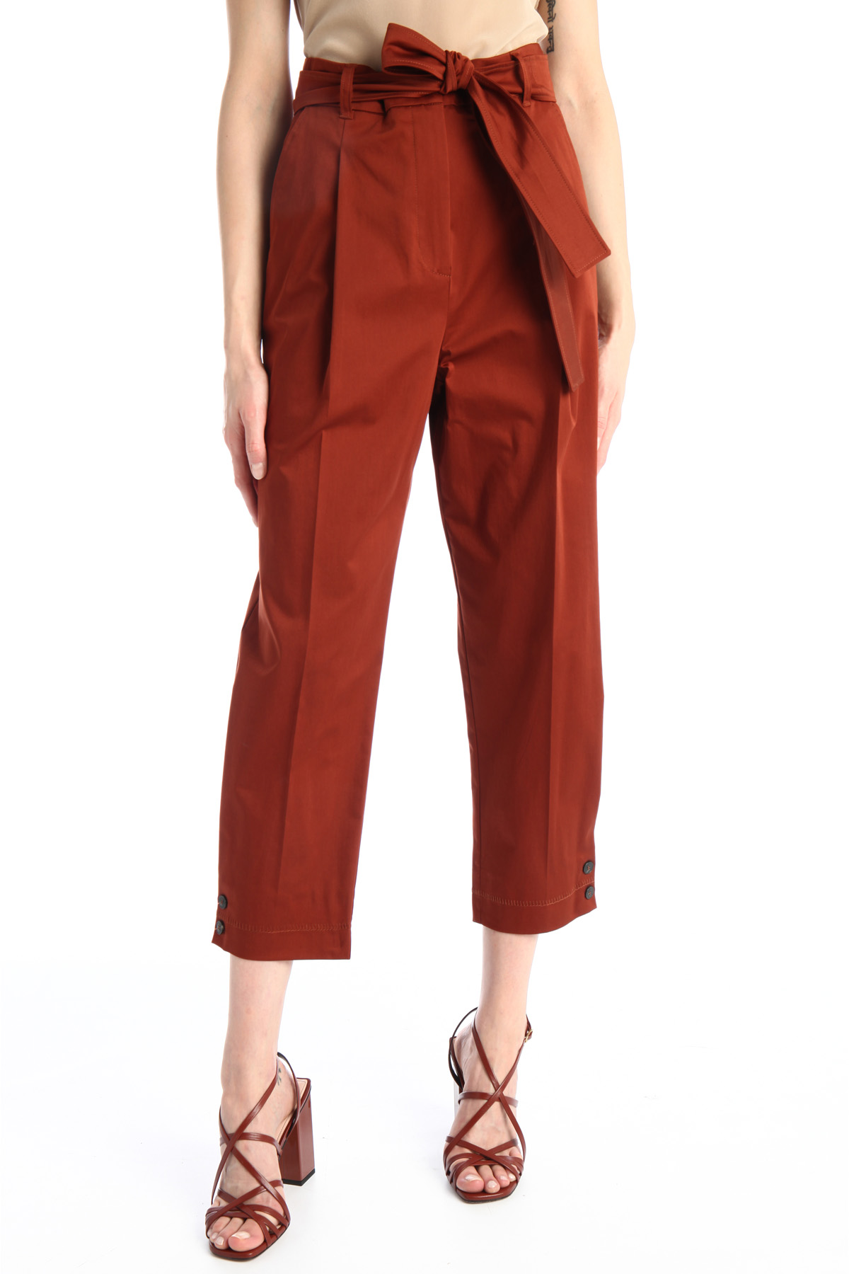 Pantaloni carrot realizzati in raso leggero di cotone stretch, con pieghe in vita, tasche laterali alla francese e a filetto dietro, bottoni laterali sul fondo. Allacciatura tramite bottone e zip nascosta. Capo dotato di cintura coordinata.