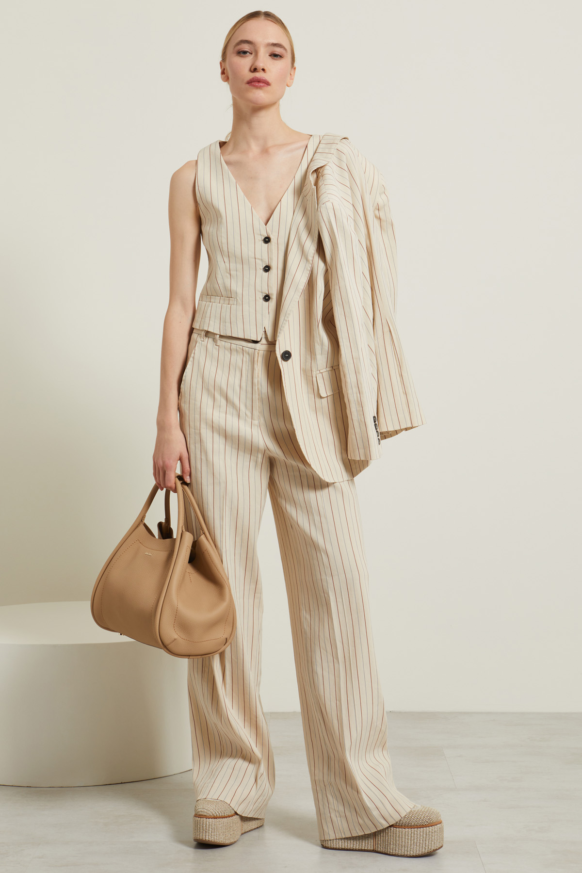 Pantaloni a palazzo realizzati in tela crépe di lino, cotone e viscosa stretch tinto filo, con passanti in vita, tasche alla francese davanti e a filetto dietro. Allacciatura tramite zip nascosta e bottone.