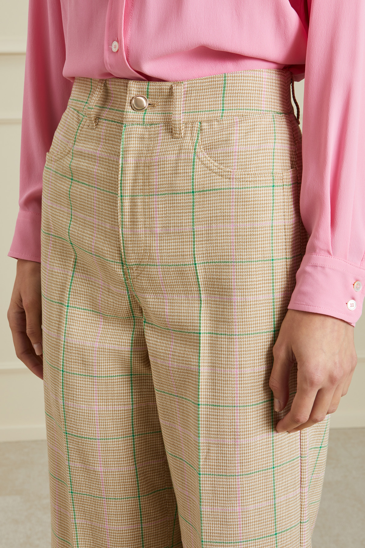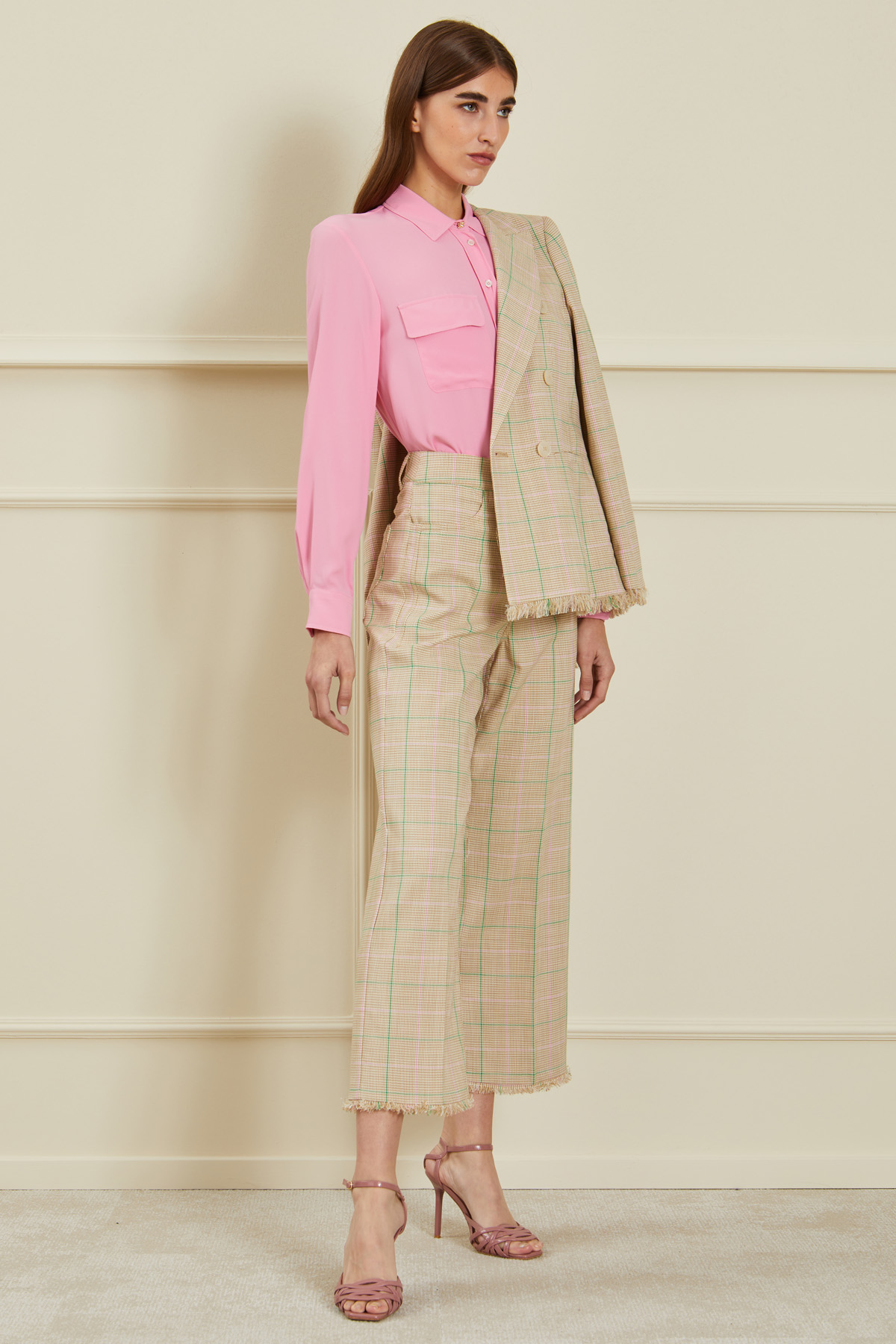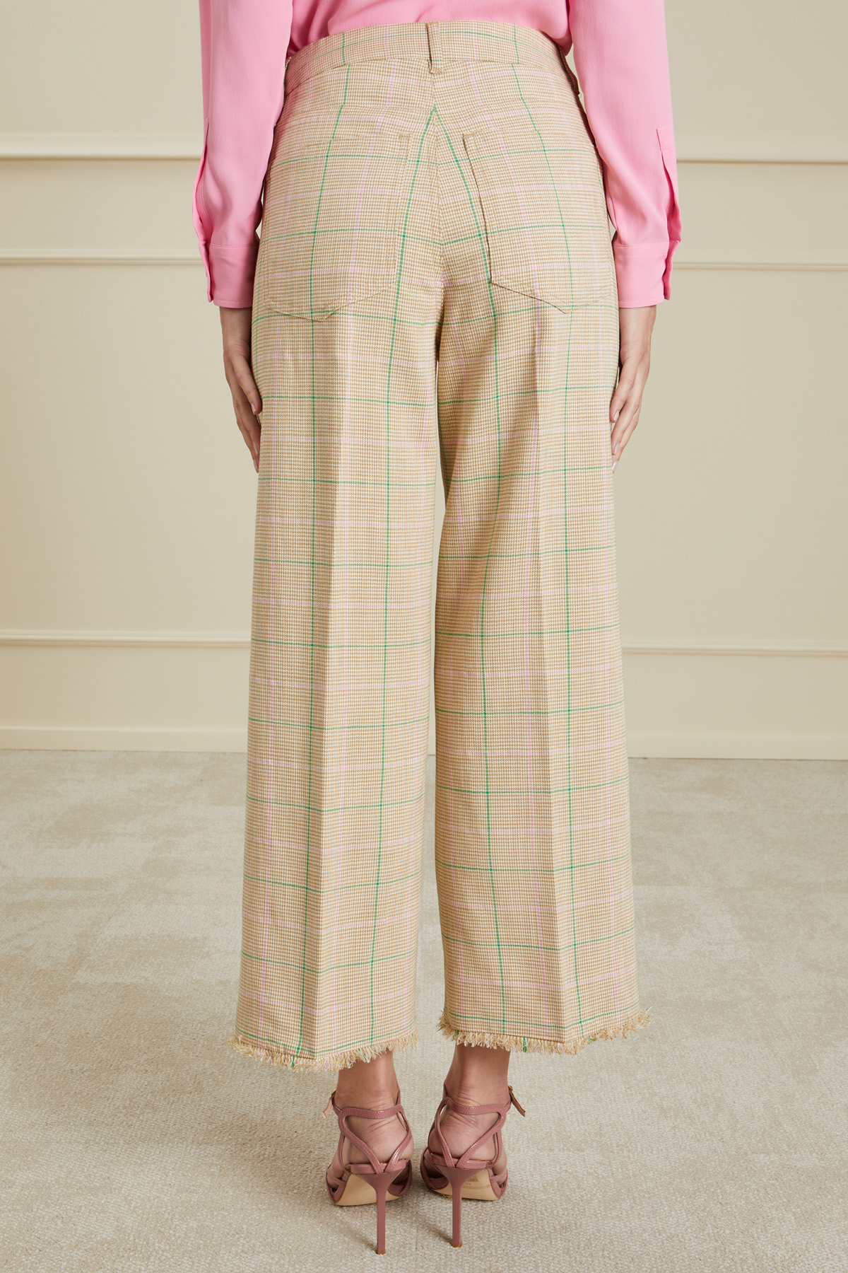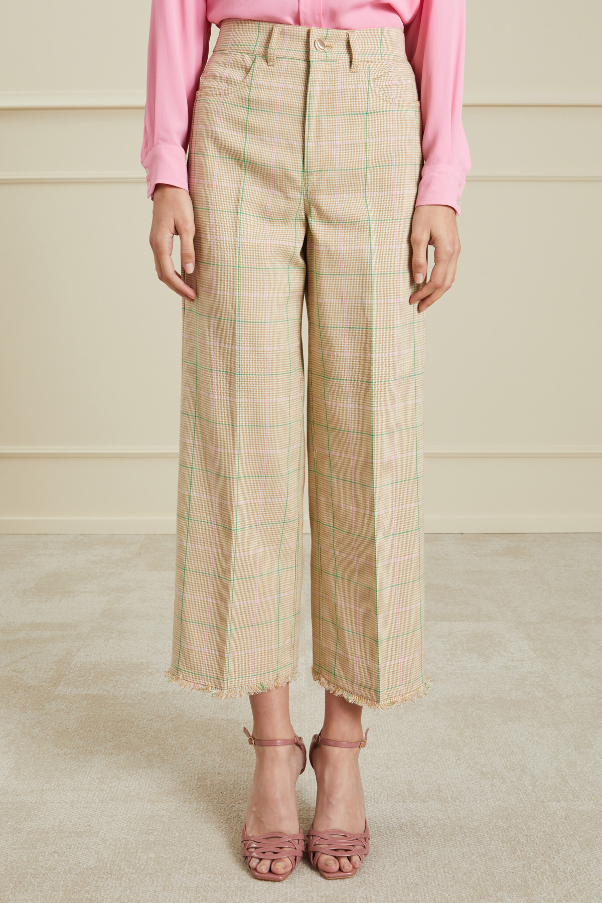 Pantaloni dalla linea dritta realizzati in stuoia di misto viscosa stretch tinto filo, con tasche alla francese sul davanti e applicate nel retro, fondo sfrangiato e allacciatura tramite zip nascosta e bottone.