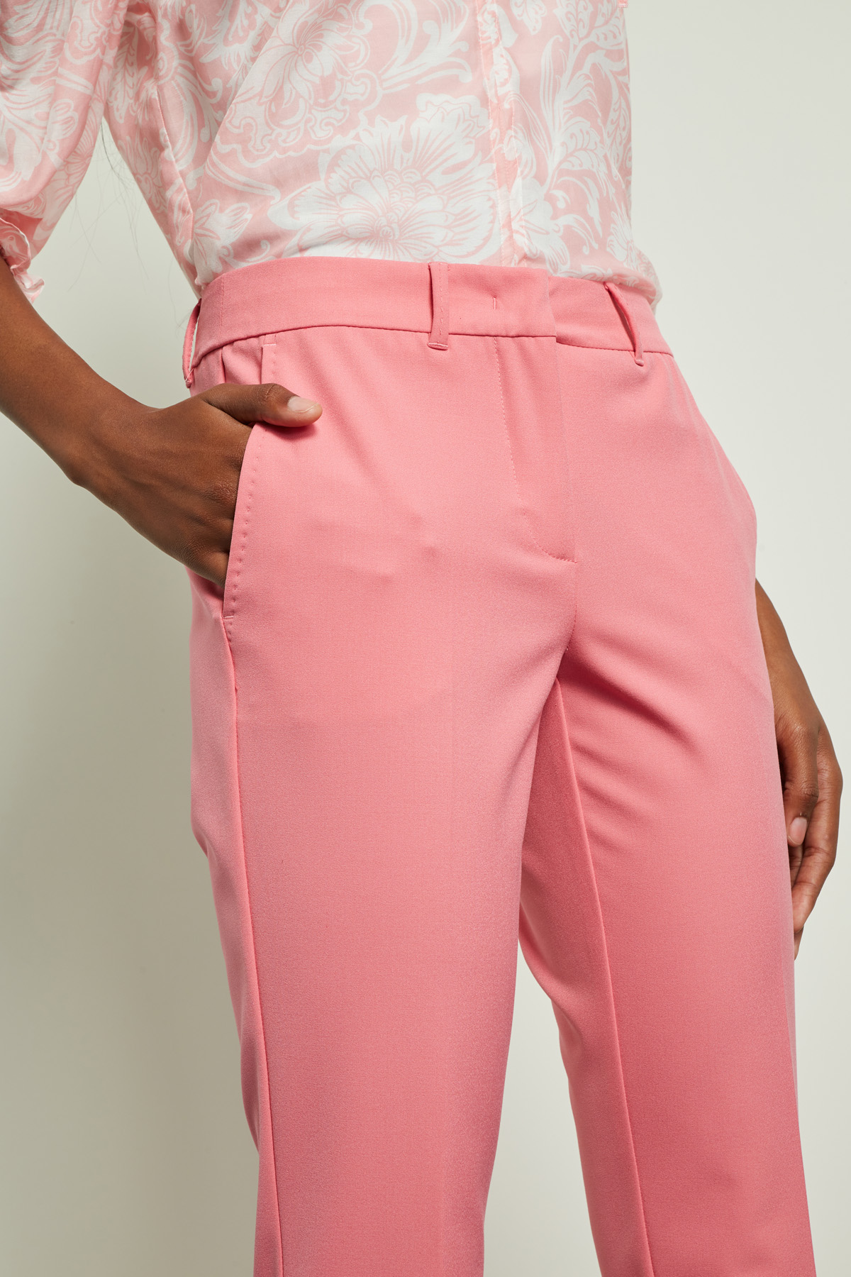 Pantaloni capri realizzati in tela di misto viscosa stretch, con passanti in vita, piega stirata, tasche alla francese rifinite a puntino davanti e a filetto dietro, spacchetti a fondo capo. Allacciatura nascosta tramite zip, bottone e gancio.