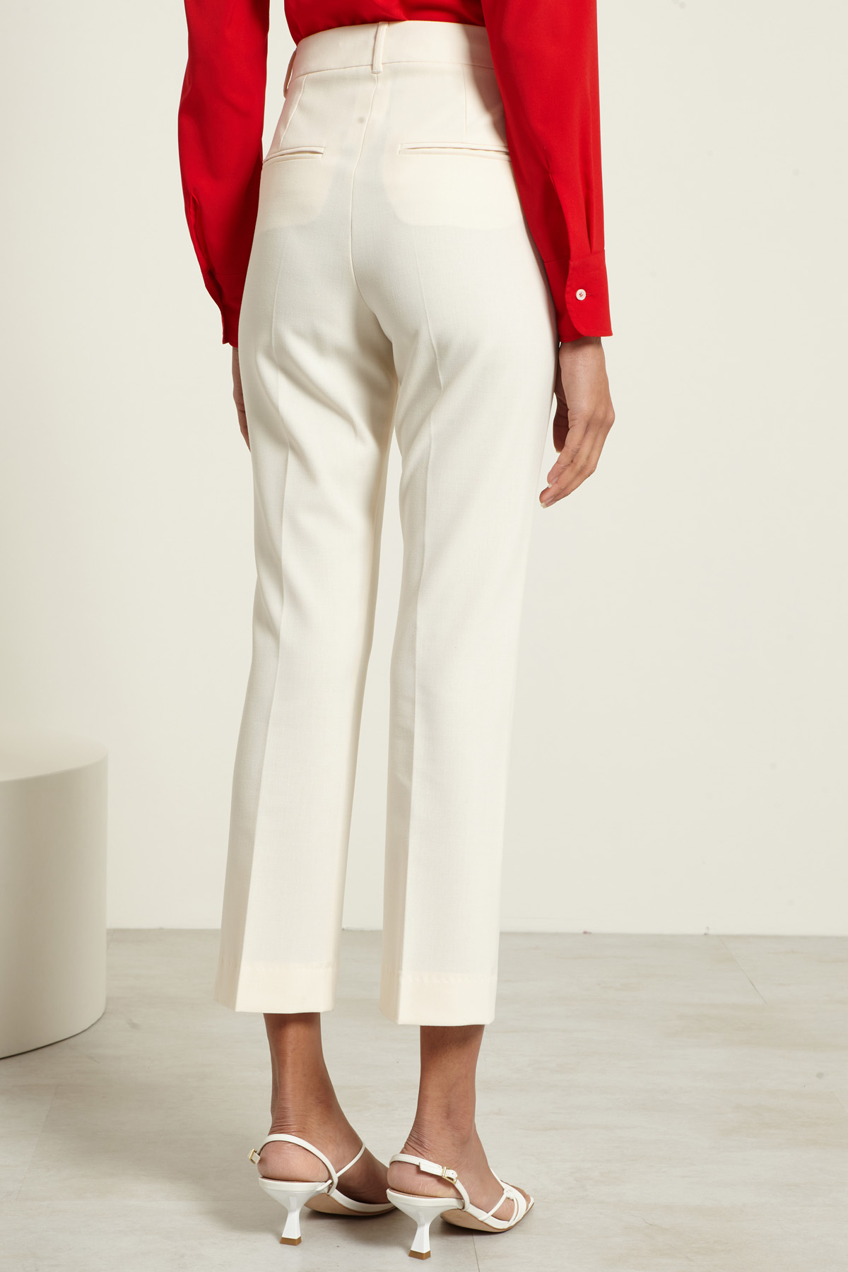 Pantaloni cropped dalla linea a sigaretta realizzati in tela di misto viscosa stretch, con passanti in vita, tasche alla francese davanti e a doppio filetto dietro, piega stirata e profili rifiniti a puntino. Allacciatura nascosta tramite zip, bottone e gancio.