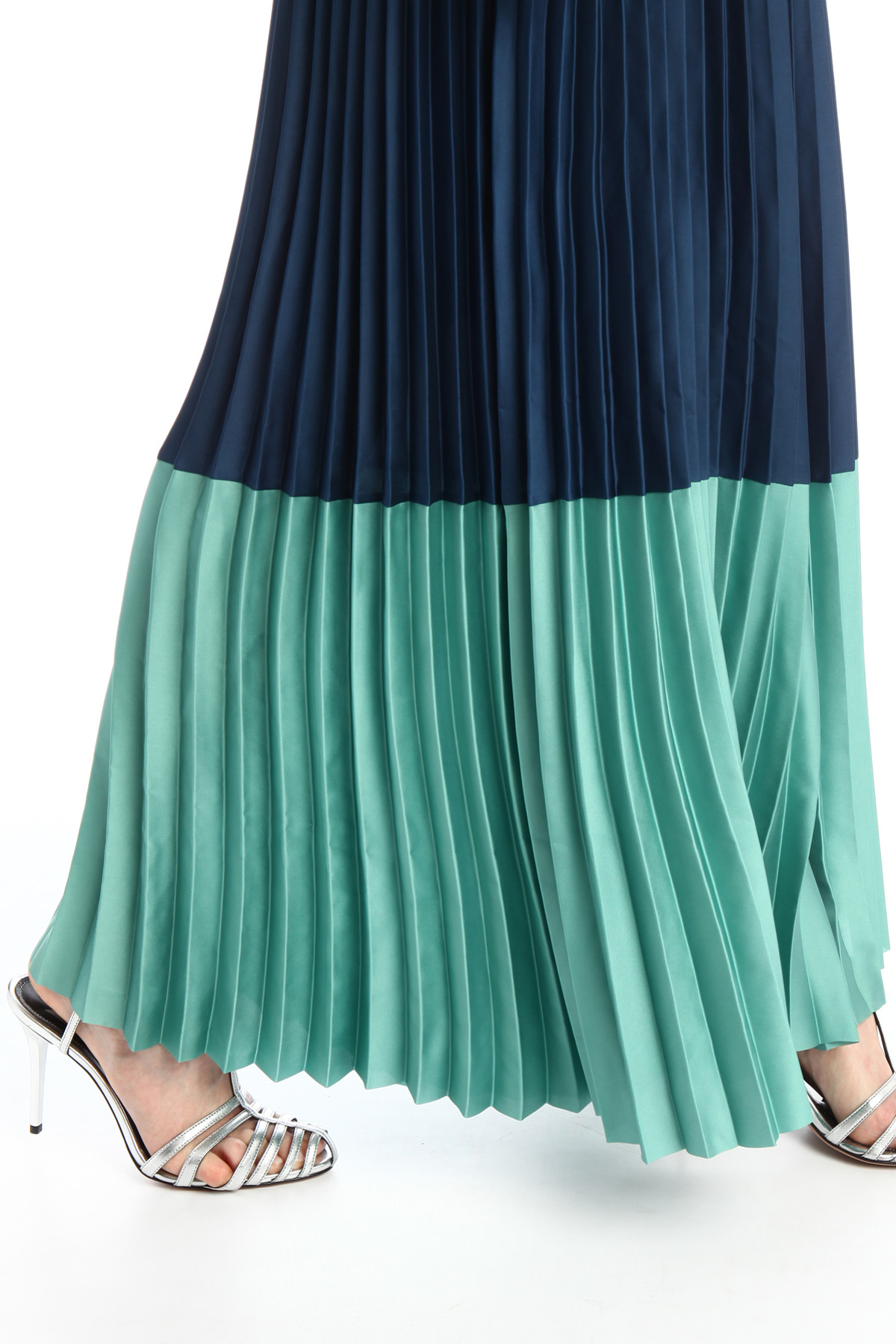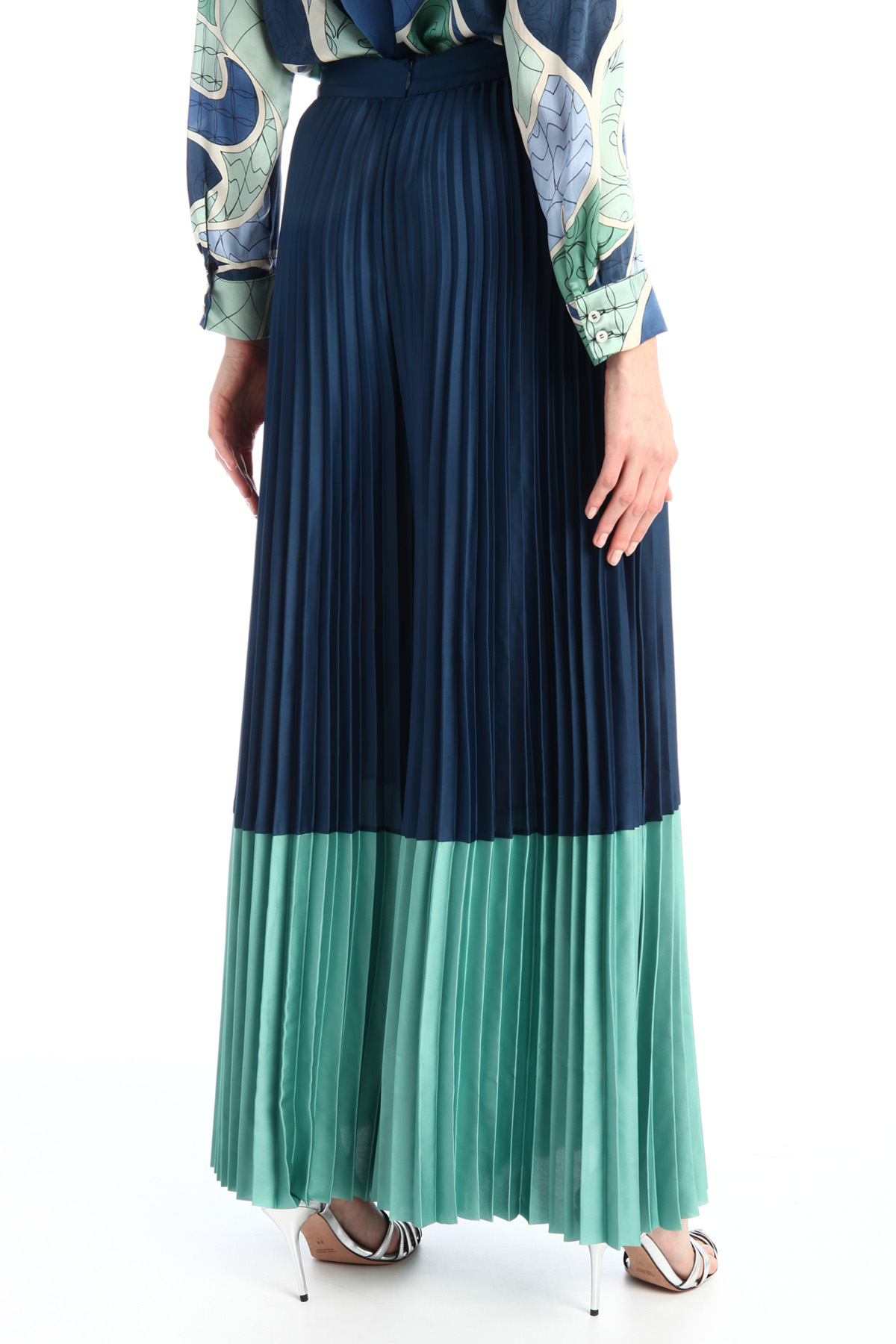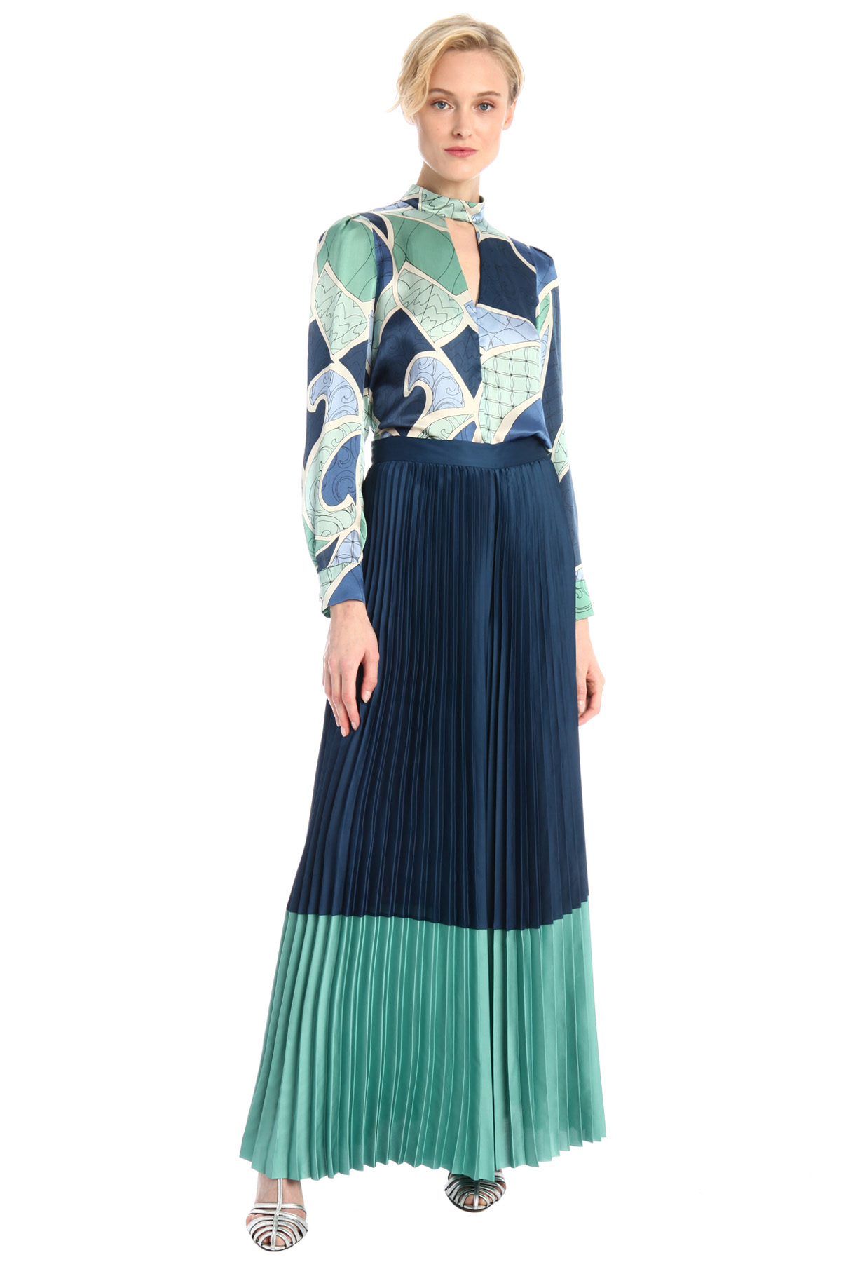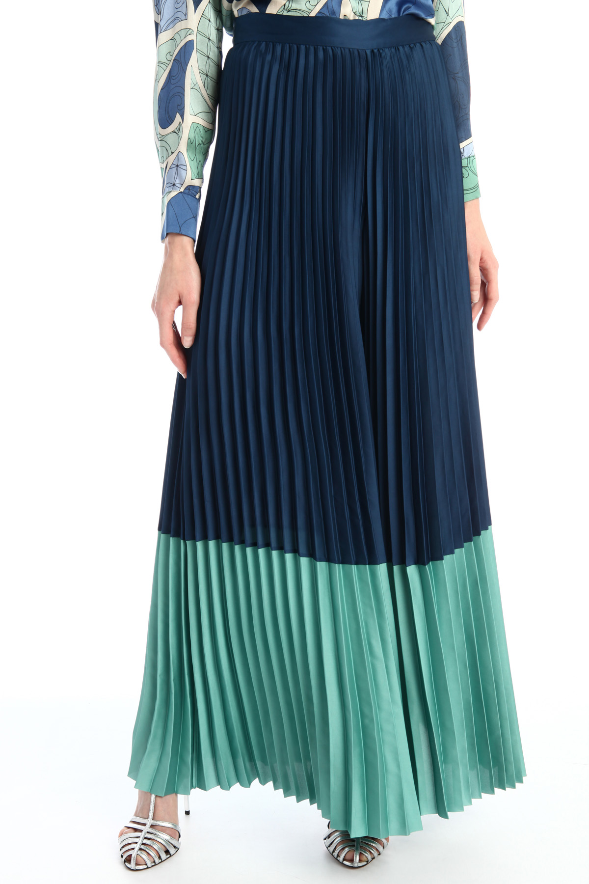 Pantaloni dalla linea ampia realizzati in raso stampato, con lavorazione plissè all over, cintone in vita e allacciatura tramite zip invisibile sul retro.