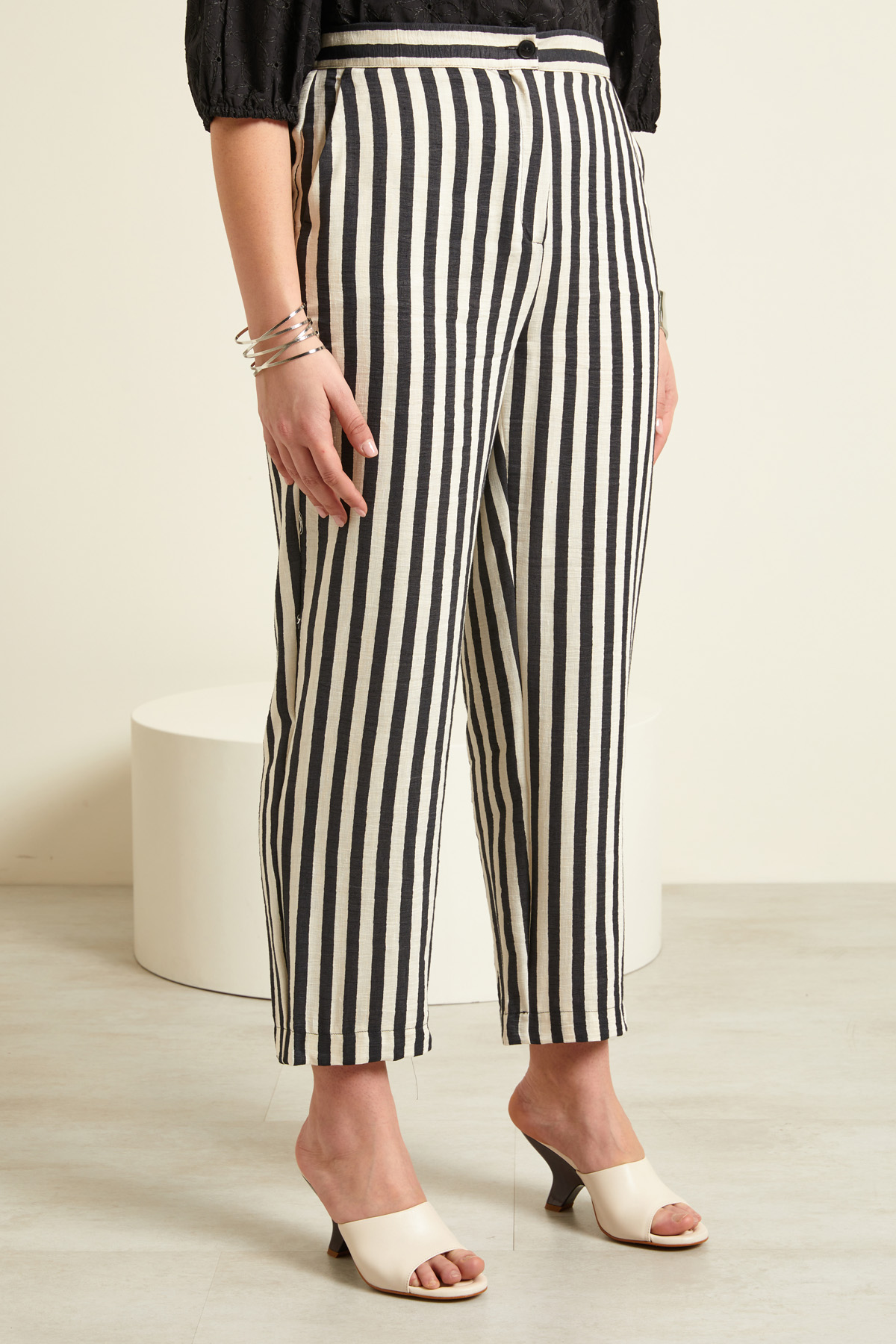 Pantaloni dalla linea dritta realizzati in tela di misto lino tinto filo, con inserto elastico in vita nel retro, tasche alla francese e allacciatura tramite zip nascosta e bottone.