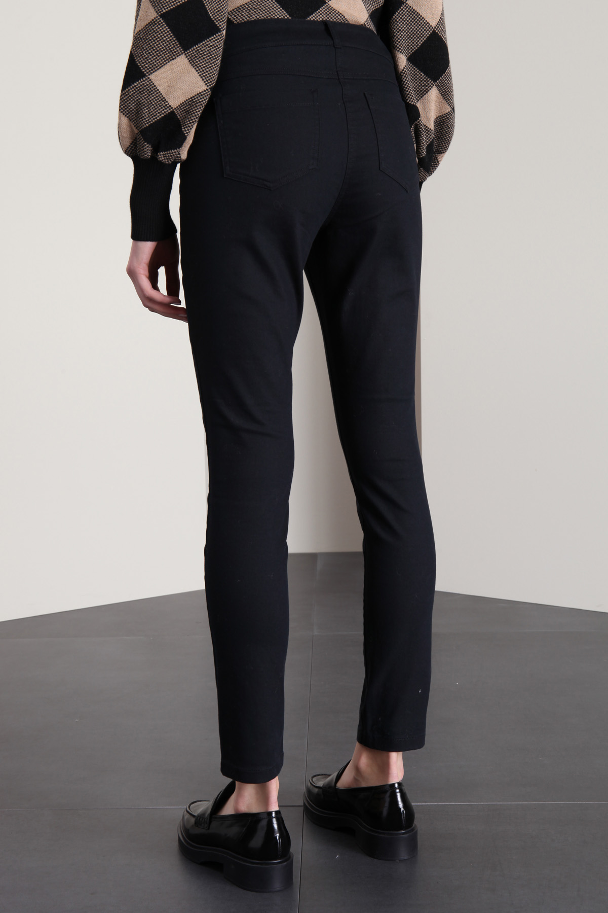 Pantaloni skinny realizzati in gabardine di misto cotone stretch, con passanti in vita, cinque tasche e allacciatura tramite zip nascosta e bottone metallico.