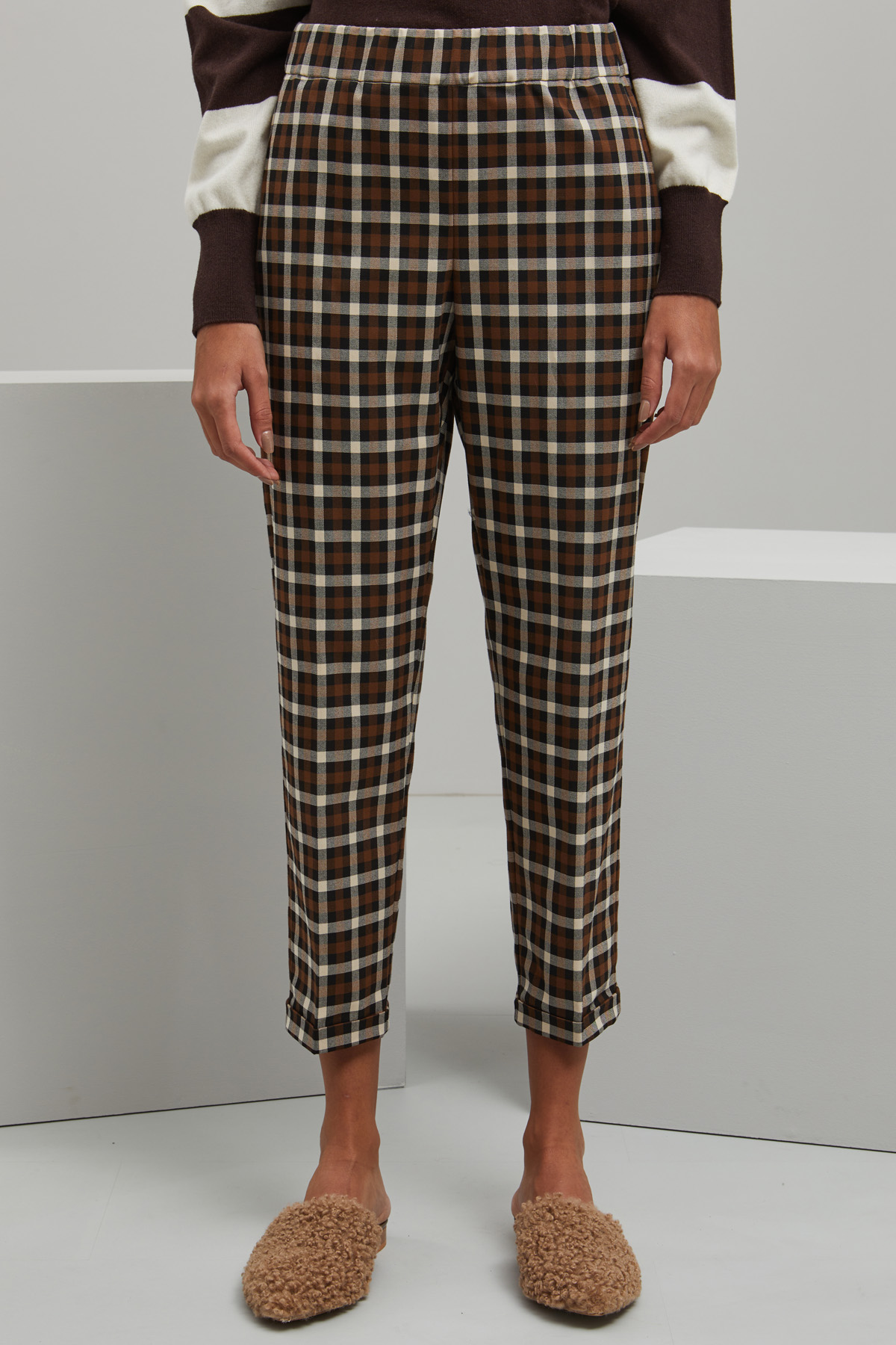 Pantaloni carrot realizzati in tessuto diagonale di misto viscosa stretch tinto filo. Il modello ha inserto elastico al punto vita, tasche laterali inserite in cucitura e a filetto nel retro, risvolto al fondo.