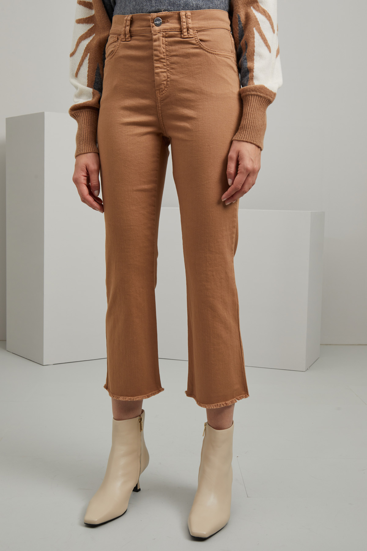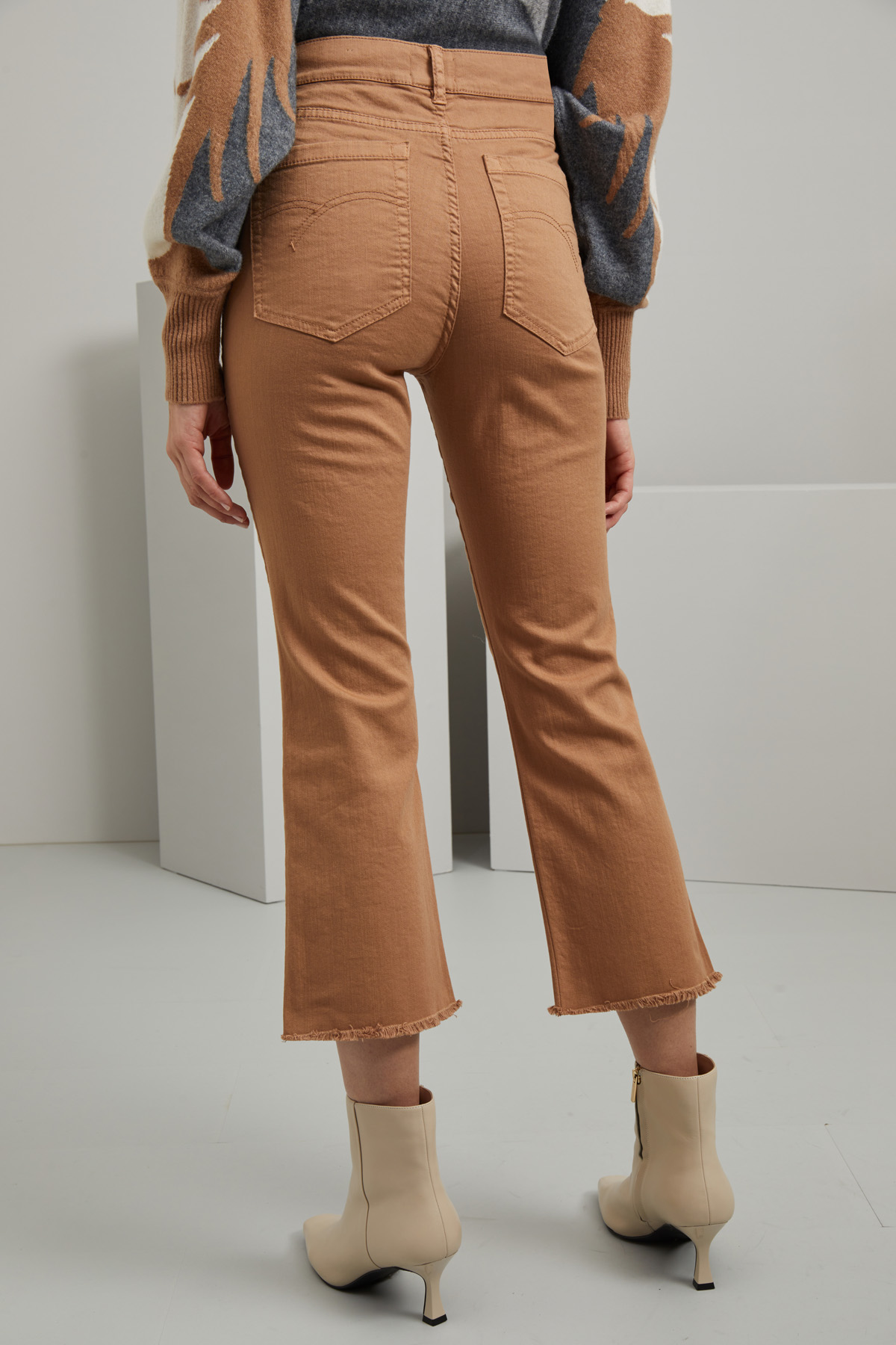 Jeans cropped dalla linea flare realizzato in denim di misto cotone stretch. Modello cinque tasche, passanti in vita e fondo sfrangiato. Allacciatura con bottone e zip nascosta.