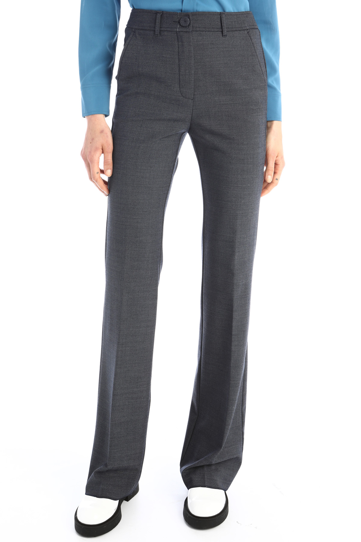 Pantaloni dalla linea dritta realizzati in tessuto effetto denim di misto lana stretch, con passanti in vita, tasche alla francese sul davanti e a filetto con bottone sul retro, allacciatura tramite zip nascosta e bottone ricoperto.