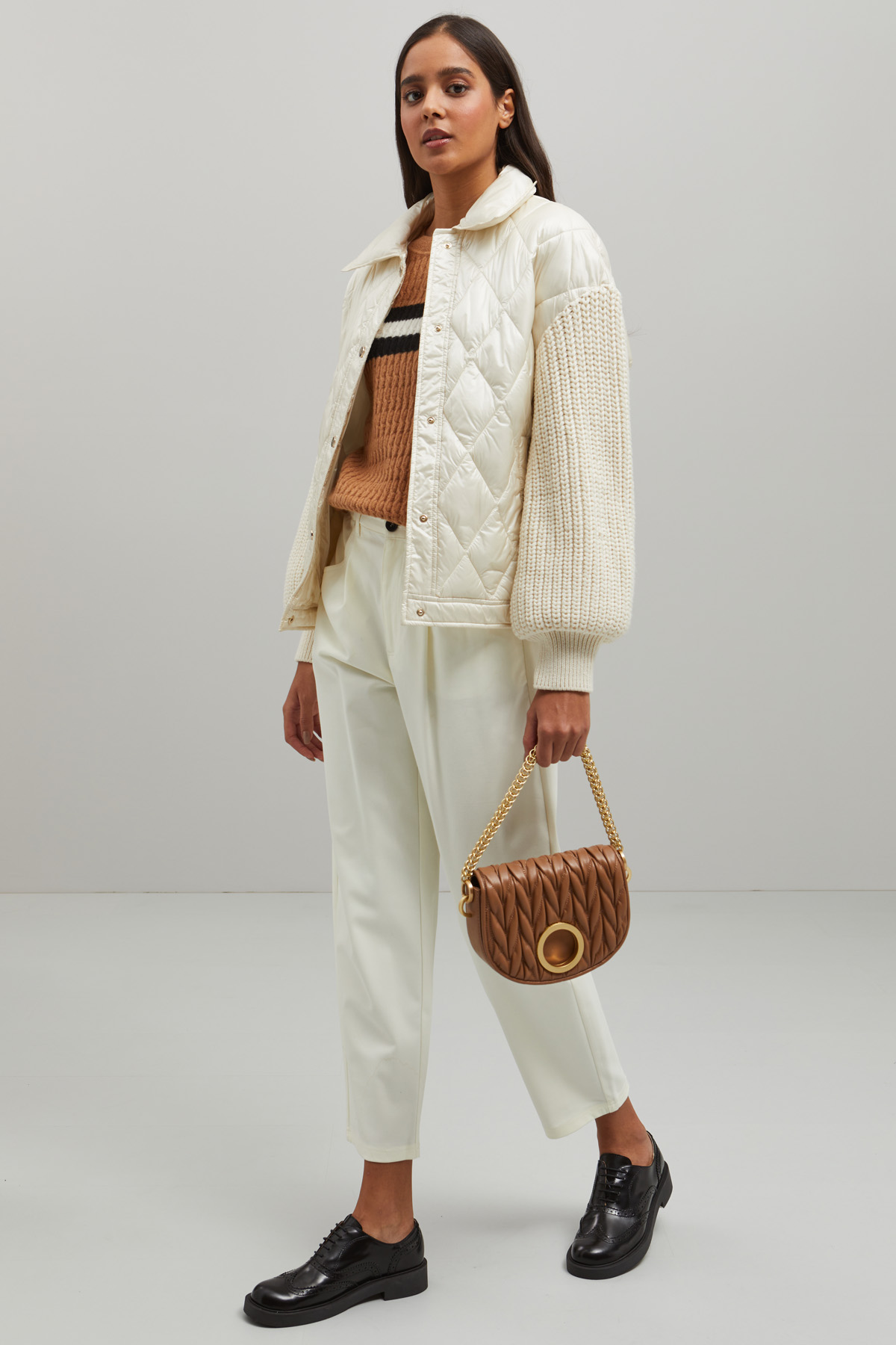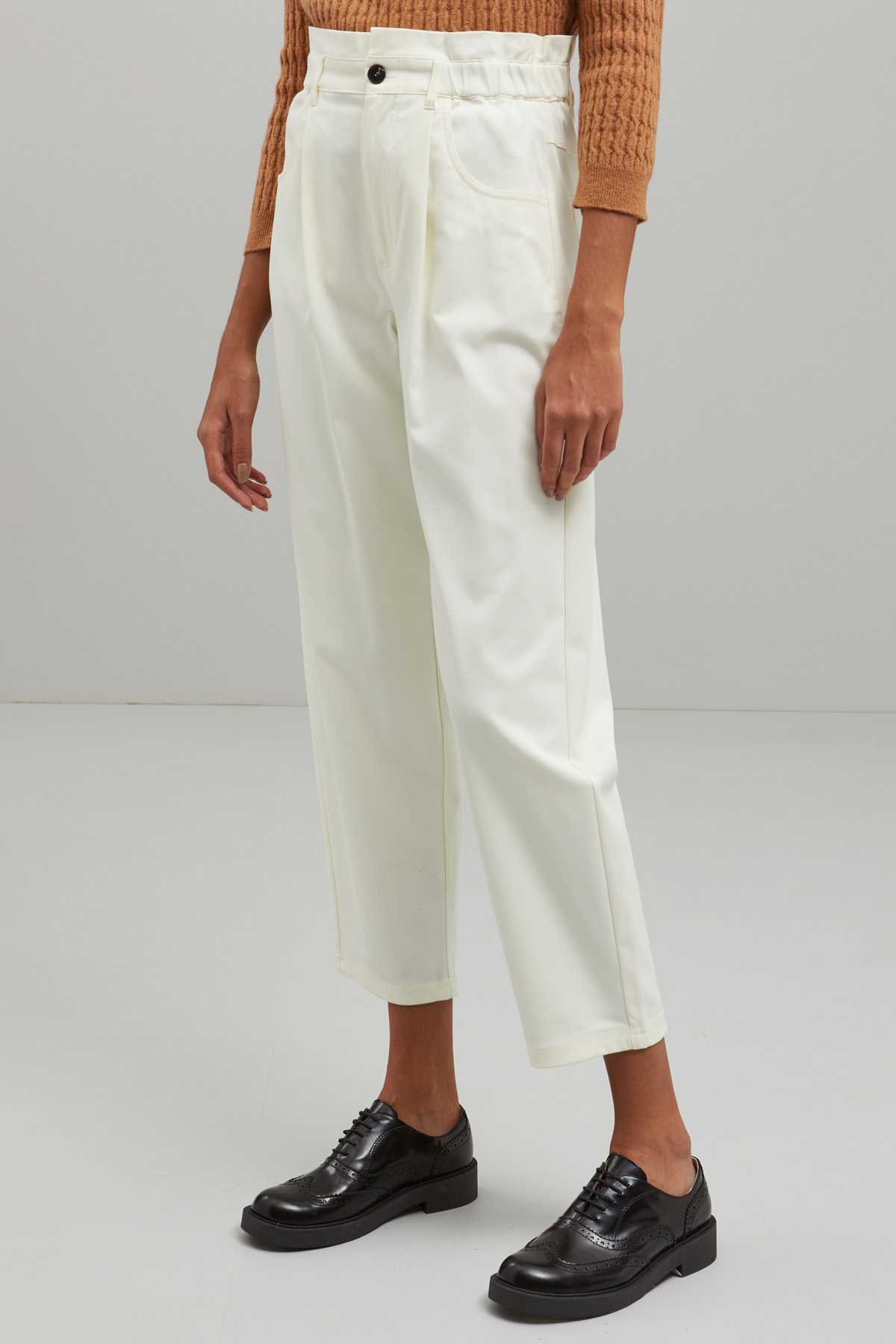 Pantaloni a vita alta dalla linea carrot realizzati in tessuto diagonale di misto viscosa e cotone stretch, con inserto elastico e passanti in vita, tasche alla francese sul davanti e applicate nel retro. Allacciatura tramite zip nascosta e bottone.