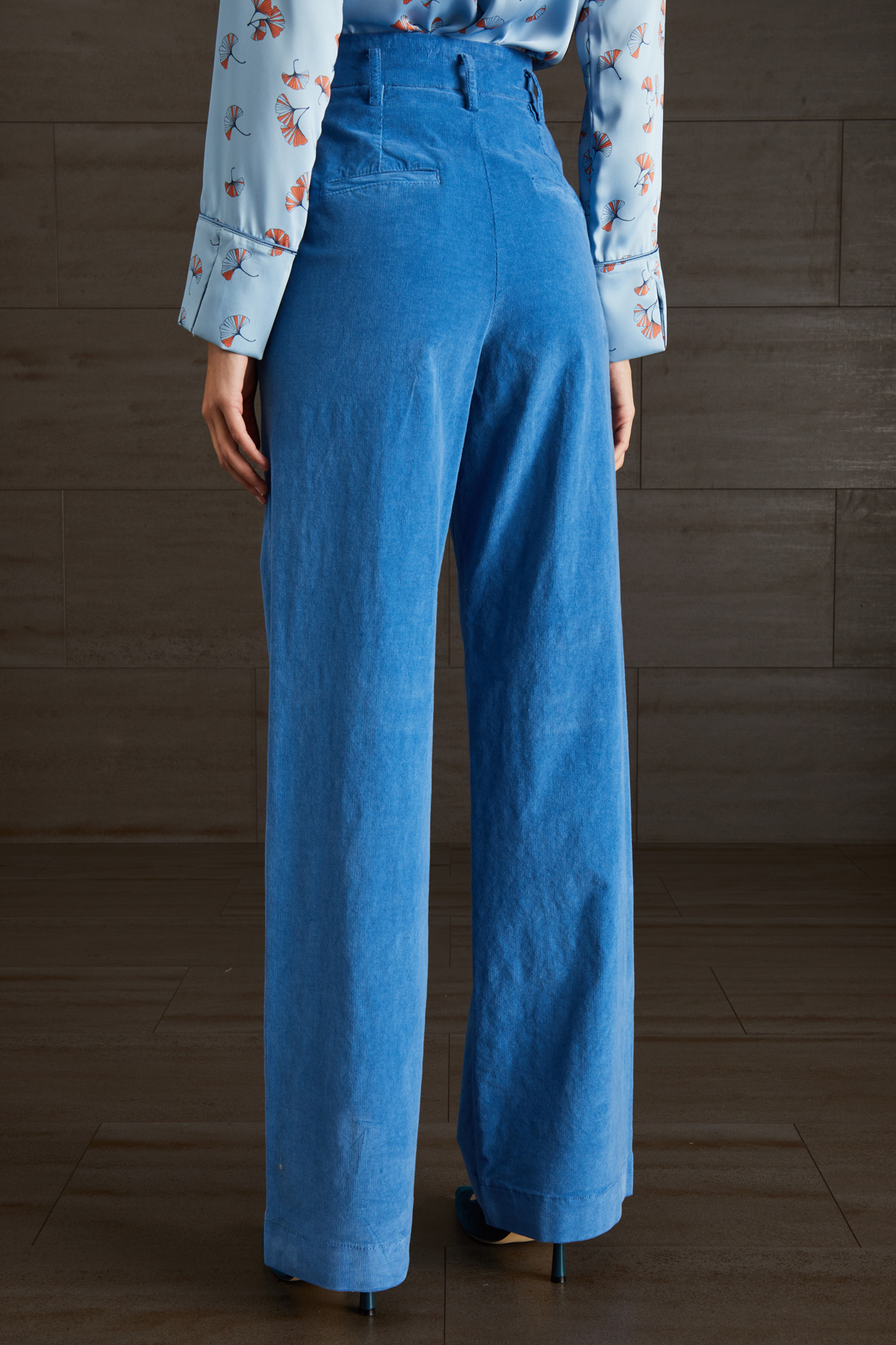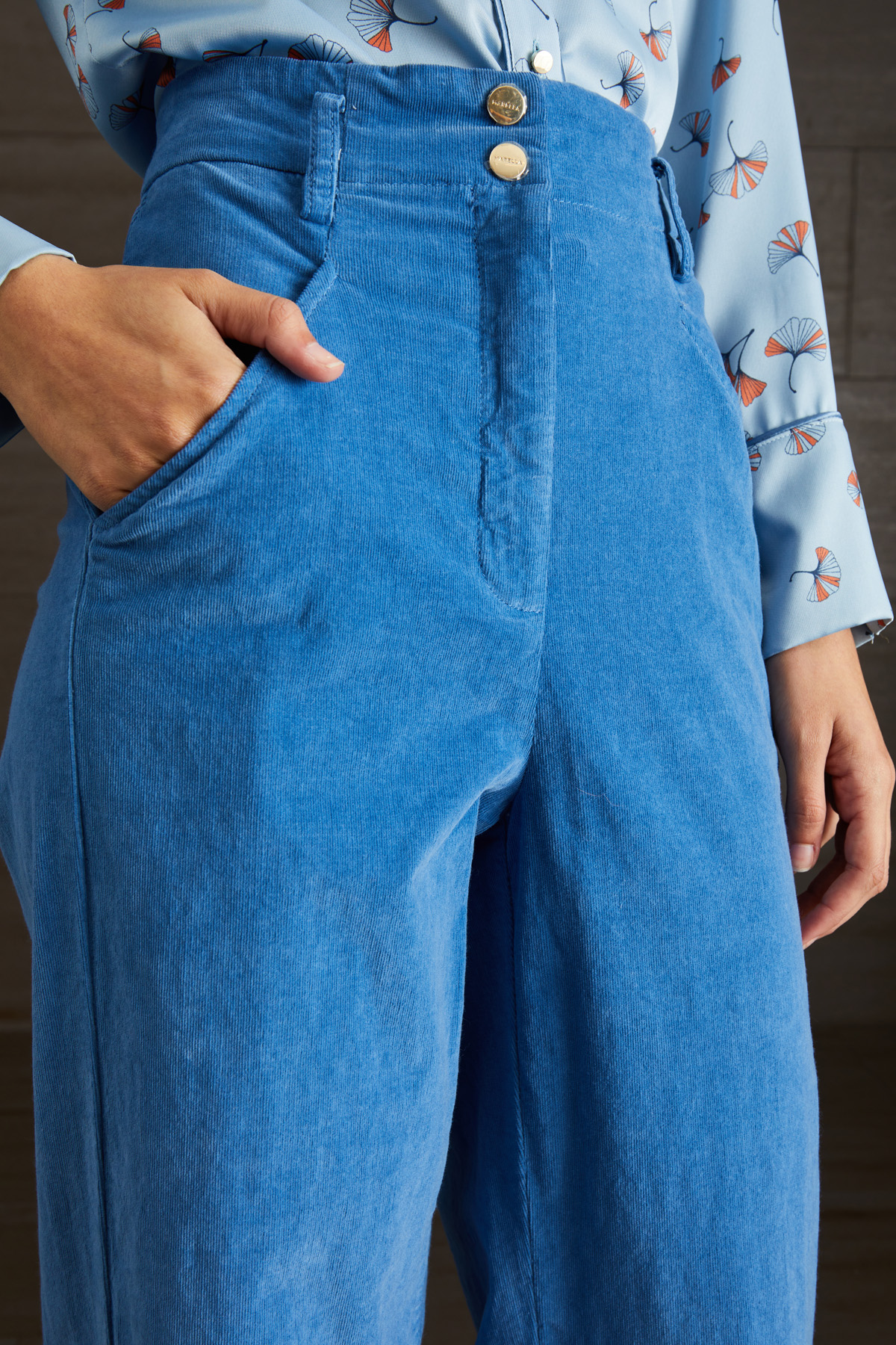 Pantaloni a palazzo realizzati in velluto di cotone stretch, con lavorazione a coste. Passanti in vita, tasche alla francese sul davanti e a filetto nel retro. Allacciatura tramite zip nascosta e bottoni.