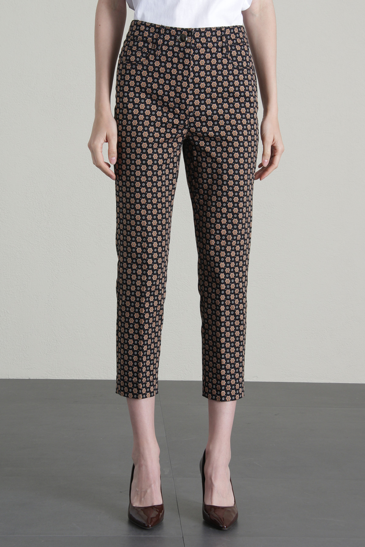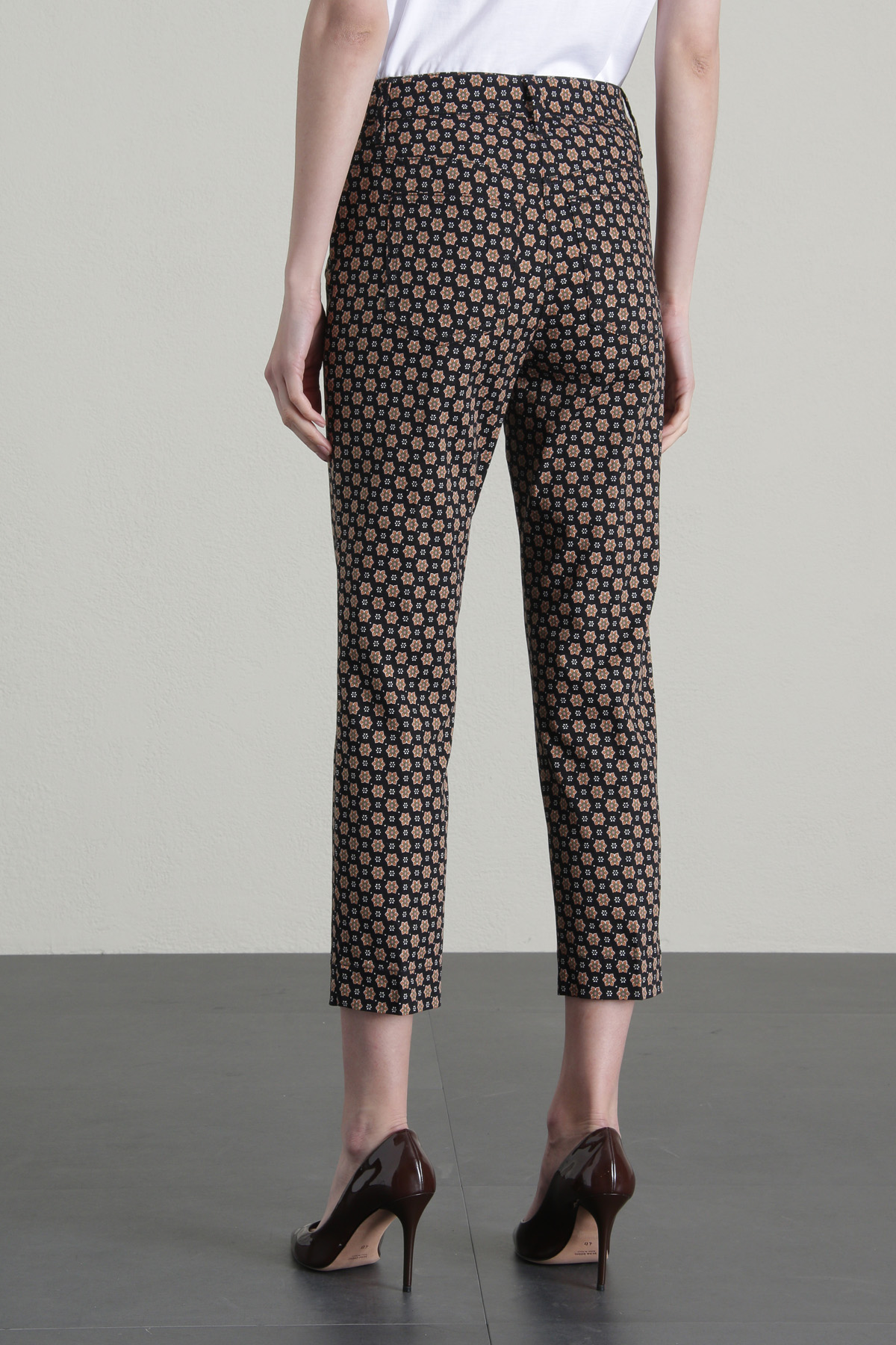 Pantaloni cropped dalla linea dritta realizzati in drill di cotone stretch stampato, con passanti in vita, tasche laterali alla francese sul davanti e applicate sul retro. Allacciatura tramite zip nascosta e bottone.
