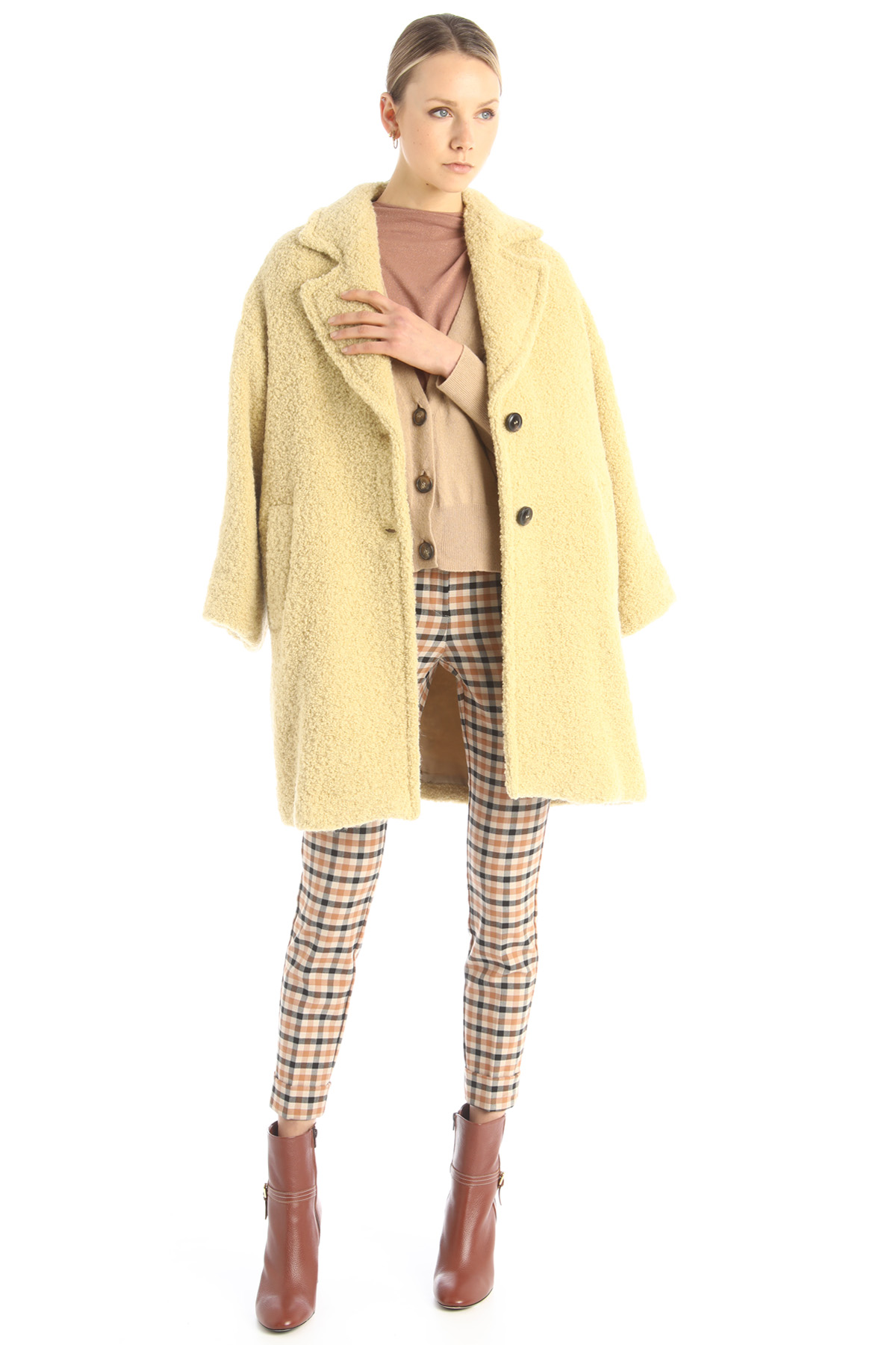 Pantaloni a sigaretta realizzati in tessuto di misto lana stretch tinto filo, con passanti in vita, tasche laterali alla francese sul davanti, a filetto sul retro e taschino con bottone. Orlo con risvolto al fondo e allacciatura nascosta tramite zip, bottone e gancio.