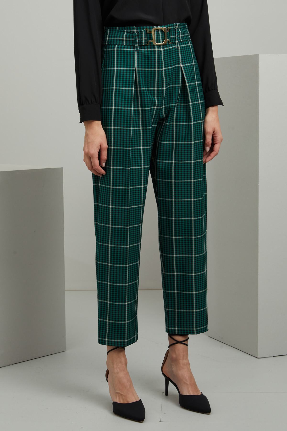 Pantaloni carrot realizzati in tessuto diagonale stretch con passanti in vita, tasche alla francese davanti e a filetto nel retro. Allacciatura nascosta tramite zip, bottone e ganci. Capo dotato di cintura coordinata con elastico e fibbia a incastro.