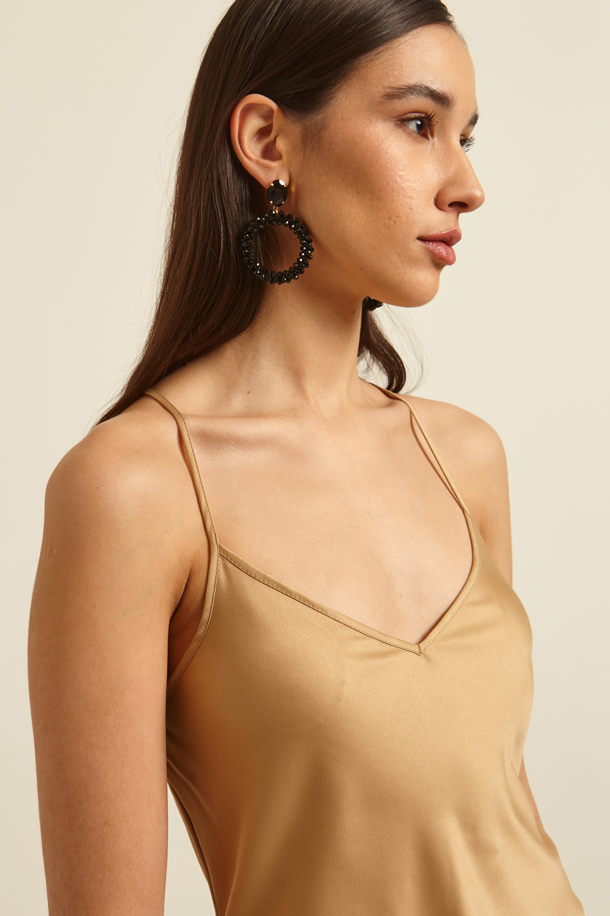 Top sottoveste dalla linea dritta realizzato in raso, con scollo a V e spalline sottili incrociate dietro.