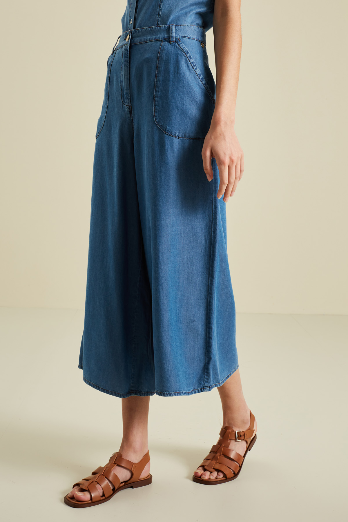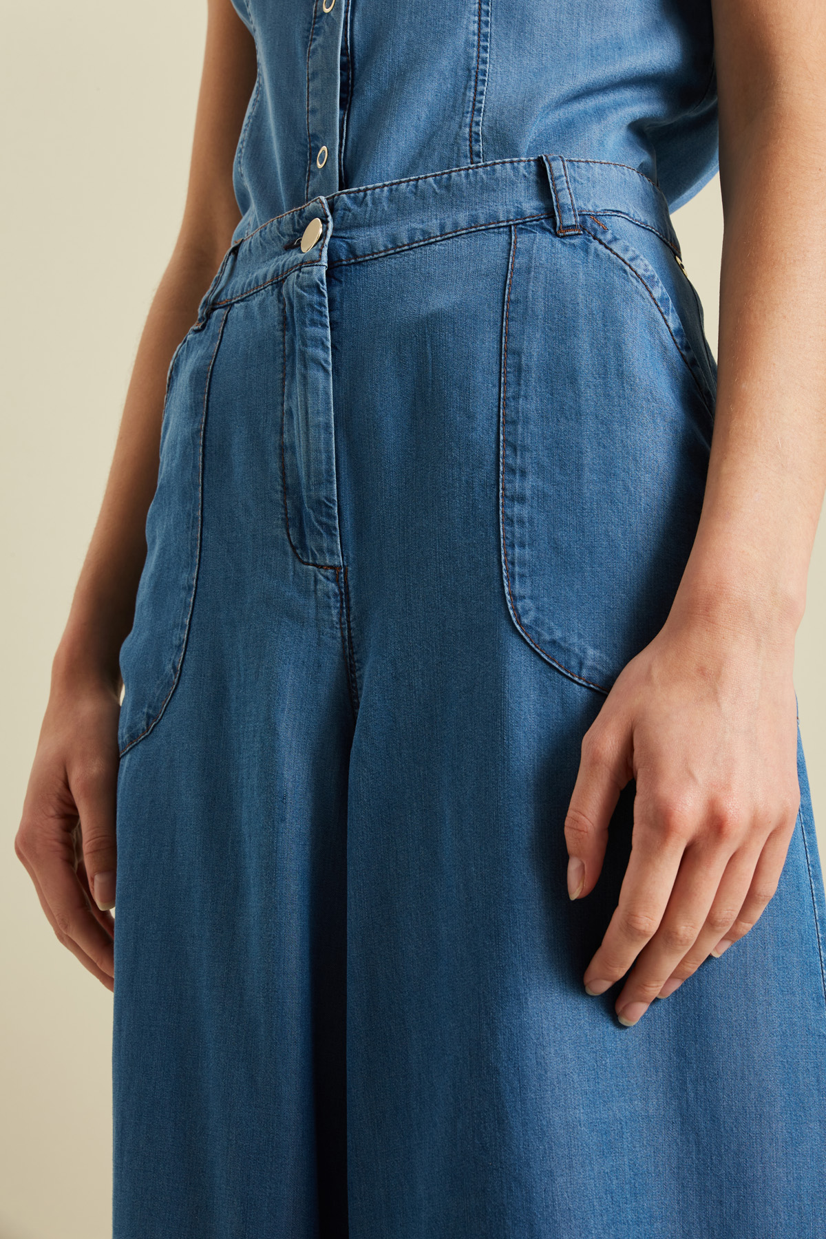 Pantaloni cropped a gamba larga realizzati in tela di fibra naturale effetto denim, con cintone e passanti in vita, tasche a filetto applicate e chiusura tramite zip coperta e bottone.