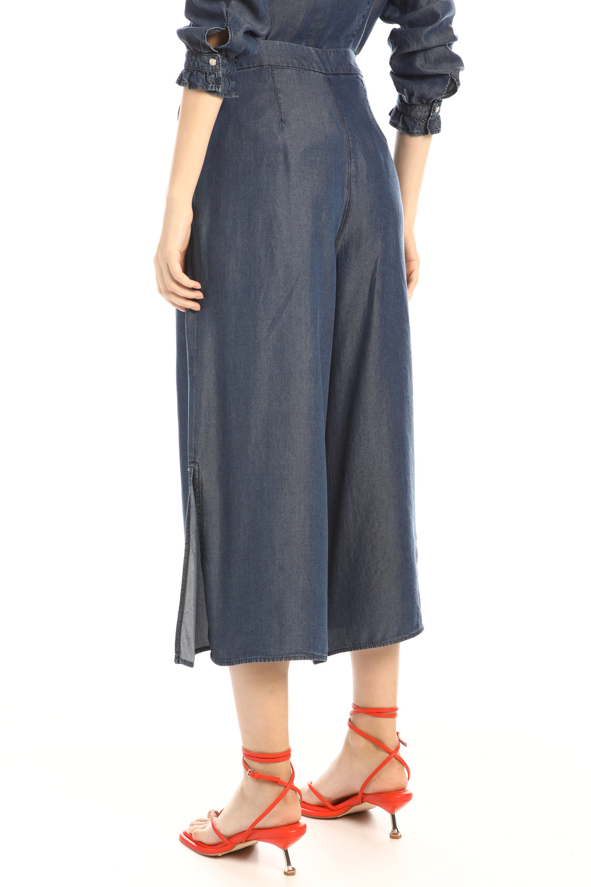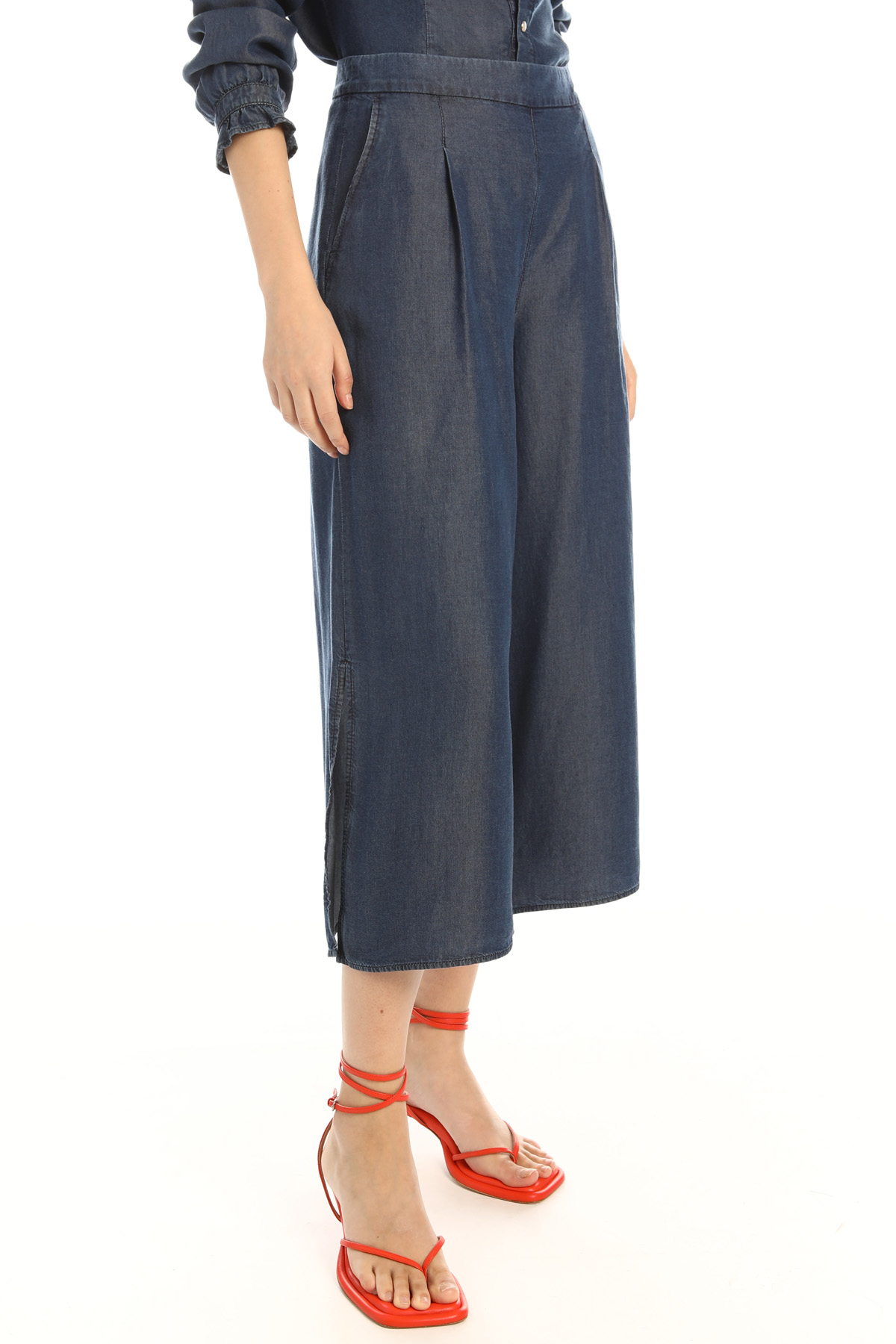 Jeans cropped dalla linea ampia realizzati in denim di pura fibra naturale, con tasche laterali alla francese, ampi spacchi al fondo e allacciatura tramite zip invisibile sul fianco.