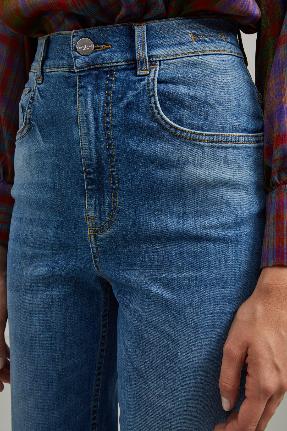 Jeans dalla linea dritta realizzati in denim di cotone stretch. Modello cinque tasche, vita alta e allacciatura tramite bottone e zip nascosta.